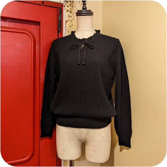 クラシカルなブラックのフリルリボンデザインニットです。 ポコポコとした立体感のあるユニークな編み地と、フロントにあしらわれた可憐なリボンタイがとっても素敵。 パンツにもスカートにもコーディネートしやすいおすすめニットです。 〇素材 : アクリル70% , 毛30% 〇サイズ表記 : Lサイズ 〇実寸サイズ 肩幅 : 約37㎝ 身幅 : 約48㎝ 袖丈 : 約55㎝ 着丈 : 約54㎝ ※着用ボディサイズは9号=Mサイズでございます。 〇コンディション : 目立ったダメージもなく綺麗な状態ですが、なにぶん古着のため多少の使用感はございます。 〇ご利用可能な配送方法 ①レターパックプラス ¥600 ( ※単品でのご注文 ) ②ゆうパック60サイズ ( ※単品でのご注文 ) ③おまとめ便A ¥600 ( ※複数点でのご注文 ) ※古着商品という性質上、到着後の色 · イメージが違うなどのお客様都合の返品は一切お断りしております。 サイズやコンディションをよくご確認の上お買い求めください。 また、ご使用の端末や画面設定、ご自宅の照明等により実際のお色味と多少異なって見える場合がございます。どうかご了承くださいませ。 ご不明な点は、お電話やメールにてお気軽にお問い合わせくださいませ♪