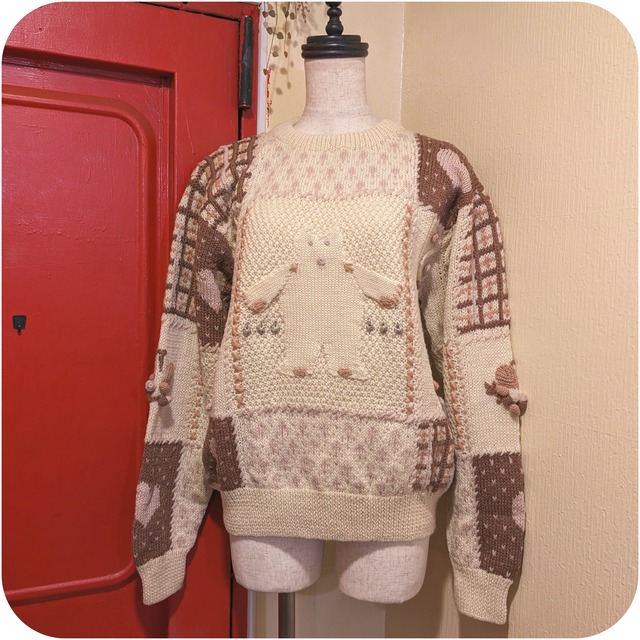 昭和レトロなブラック×レッド×グリーンのメルヘン柄ニット