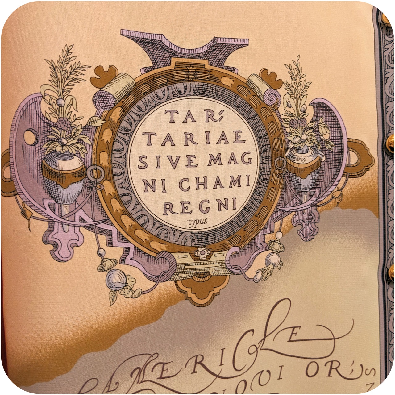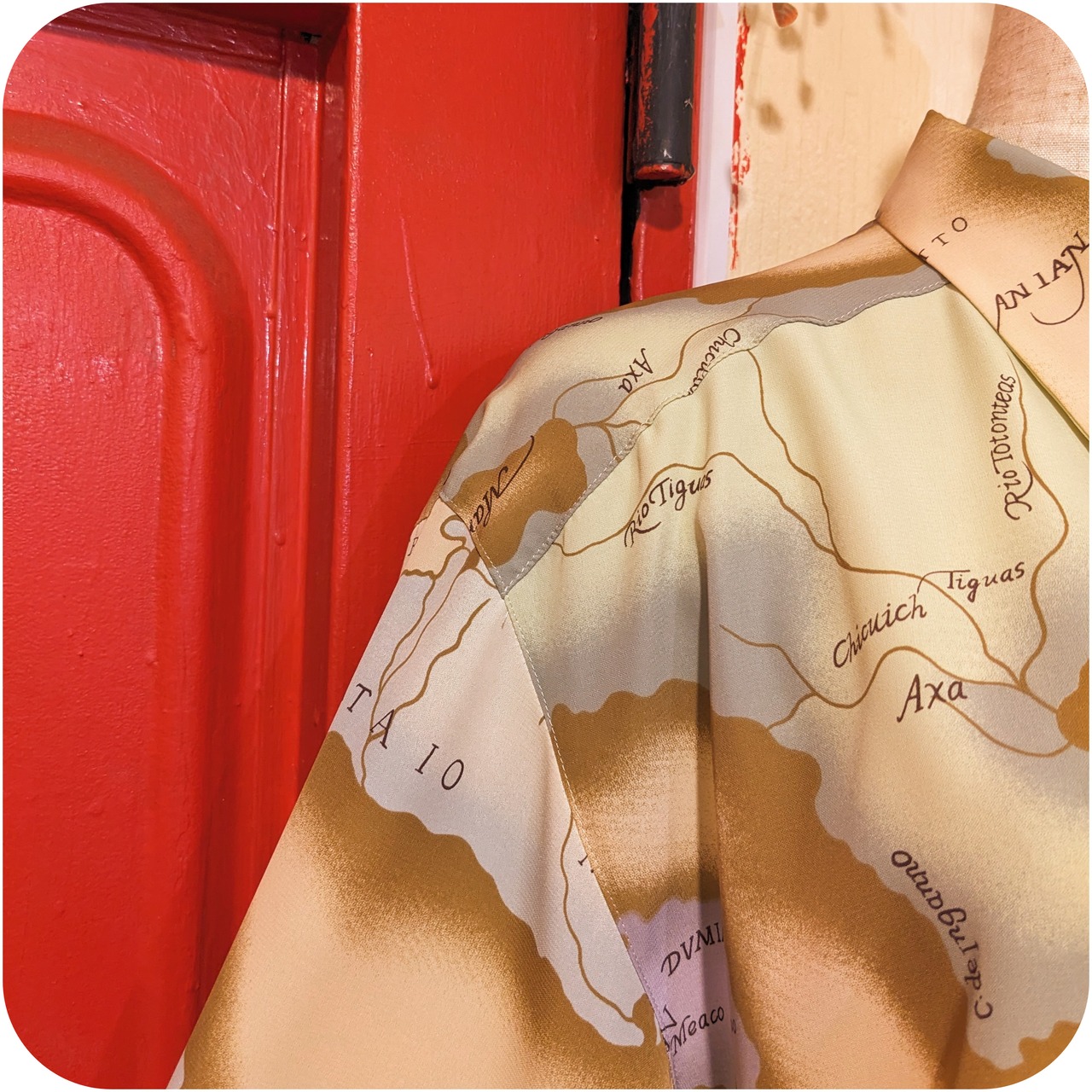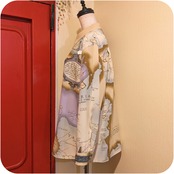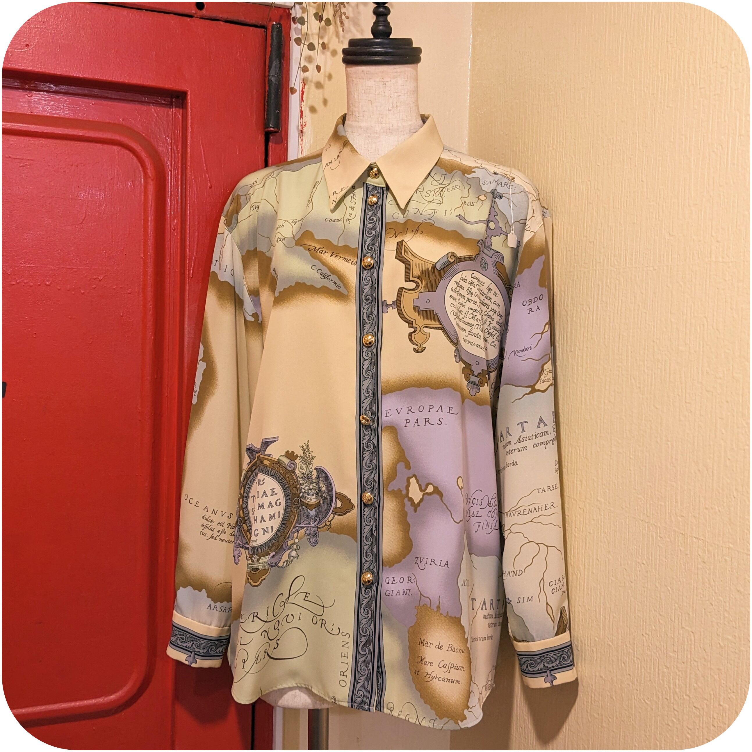モードなライトベージュ×ラベンダーのマップ柄ブラウスです。
