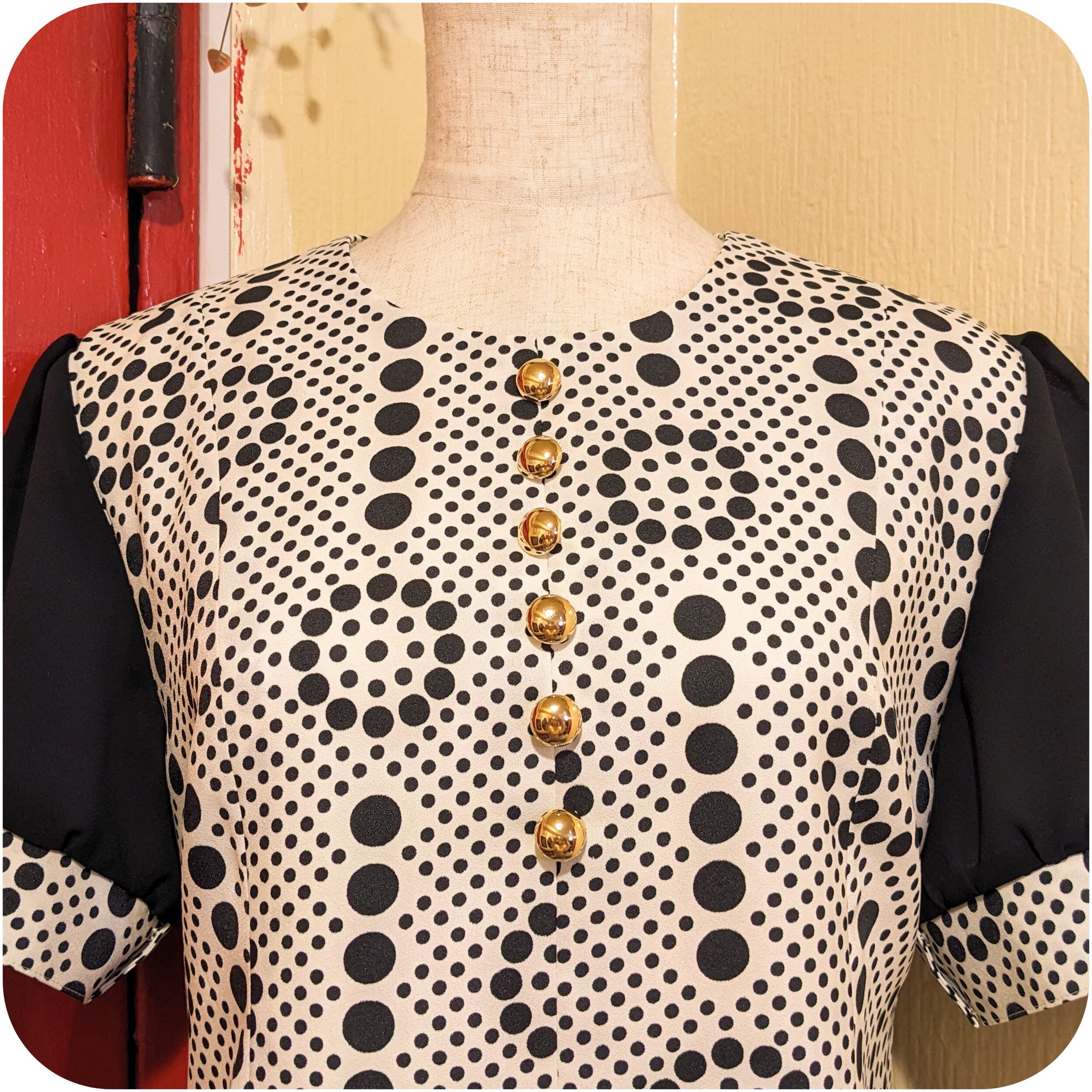 昭和レトロなホワイト×ブラックのドット柄パフスリーブワンピース