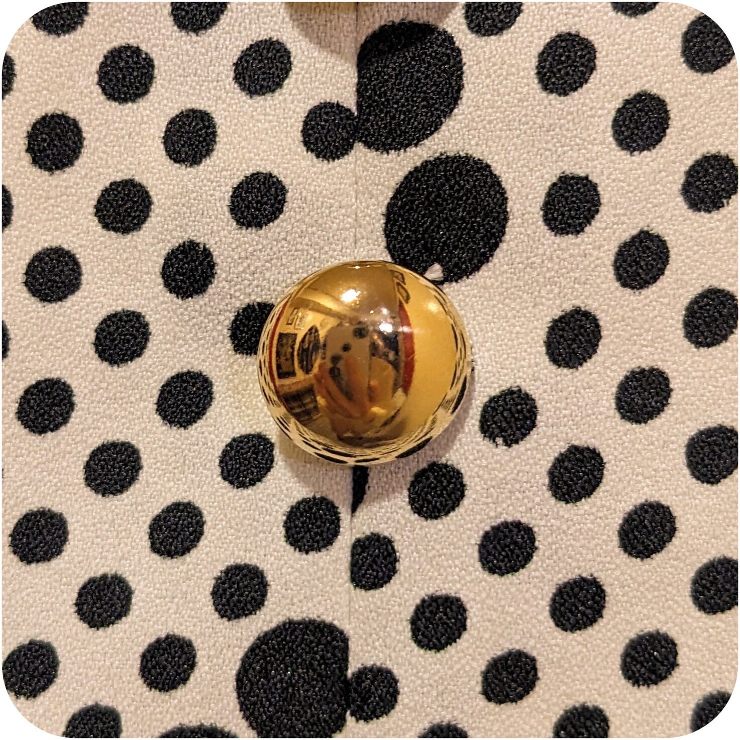 古着ならではのユニークなプリント柄と、フロントにあしらわれたスペイシーなゴールドボタンがとっても素敵。