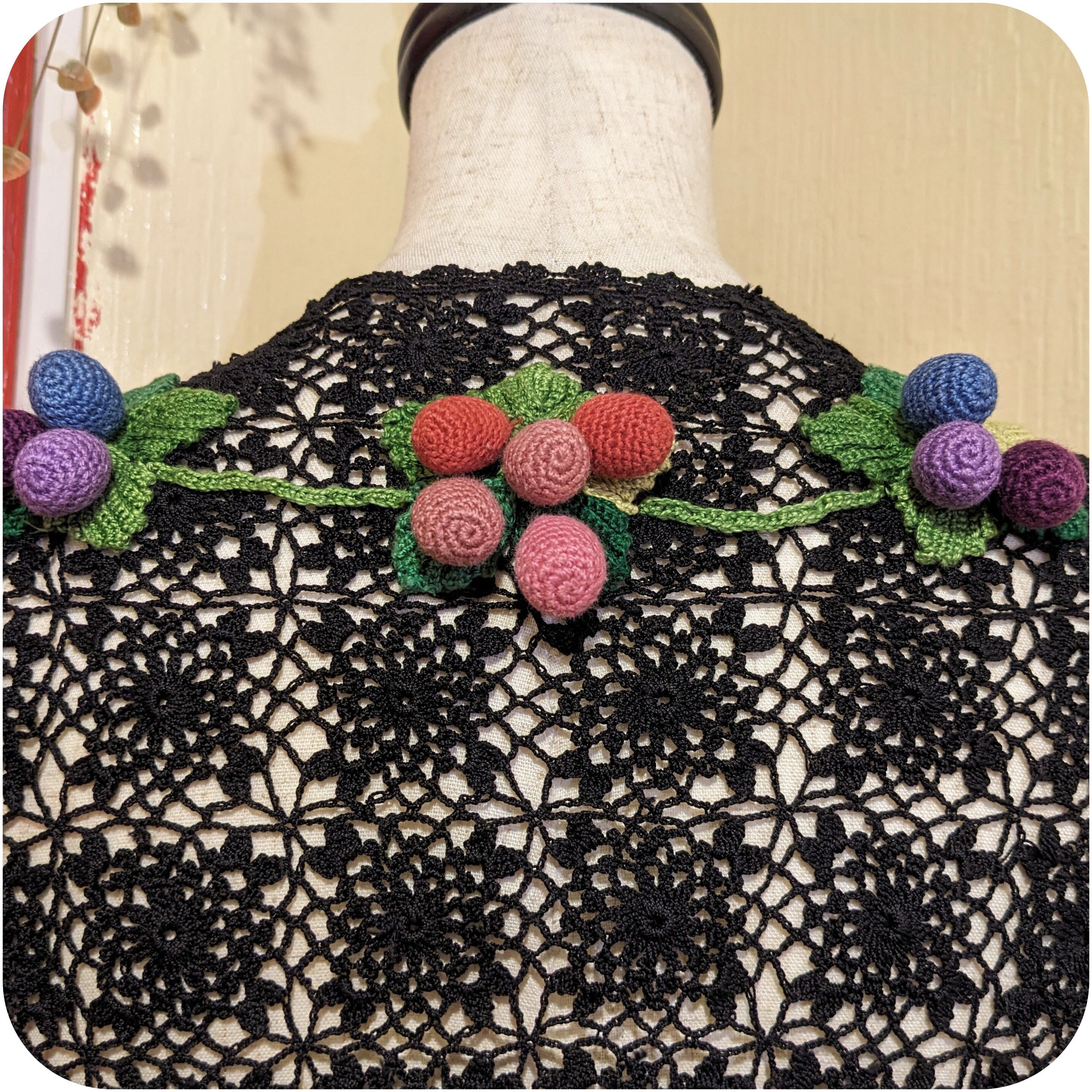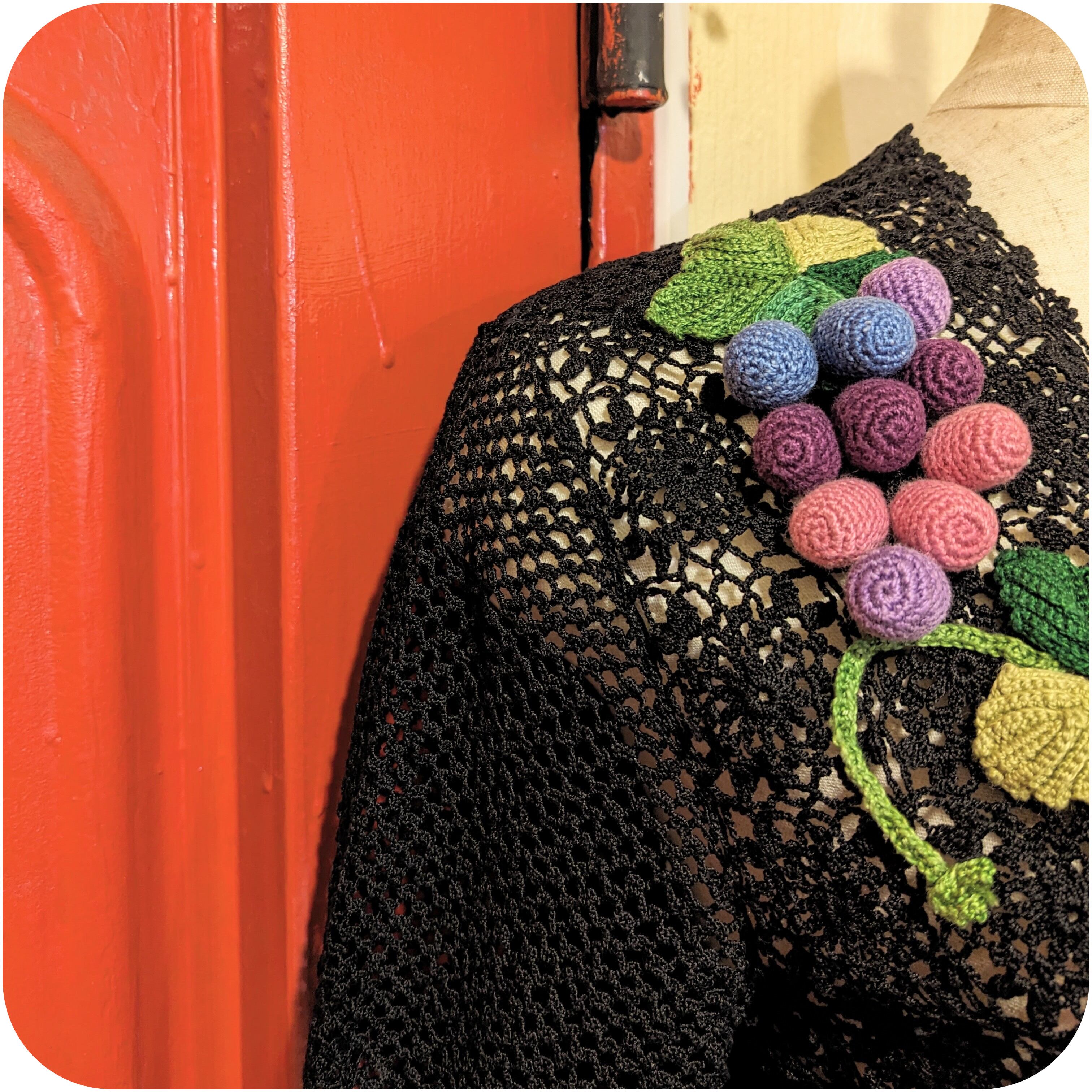 昭和レトロなブラック×スモーキーピンク×グリーンの葡萄モチーフクロシェカーディガン