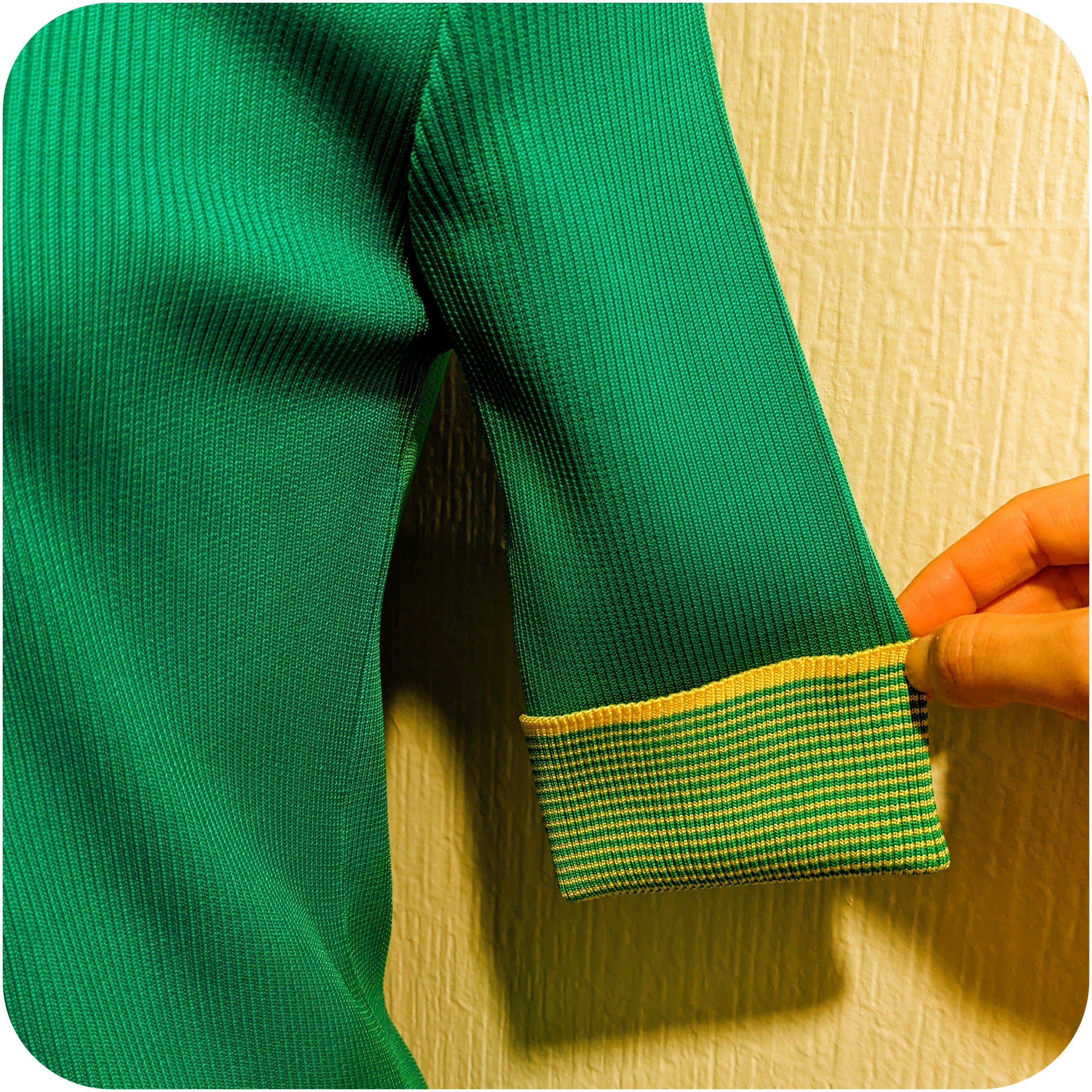 昭和レトロなグリーン×イエローのリブカーディガンです。