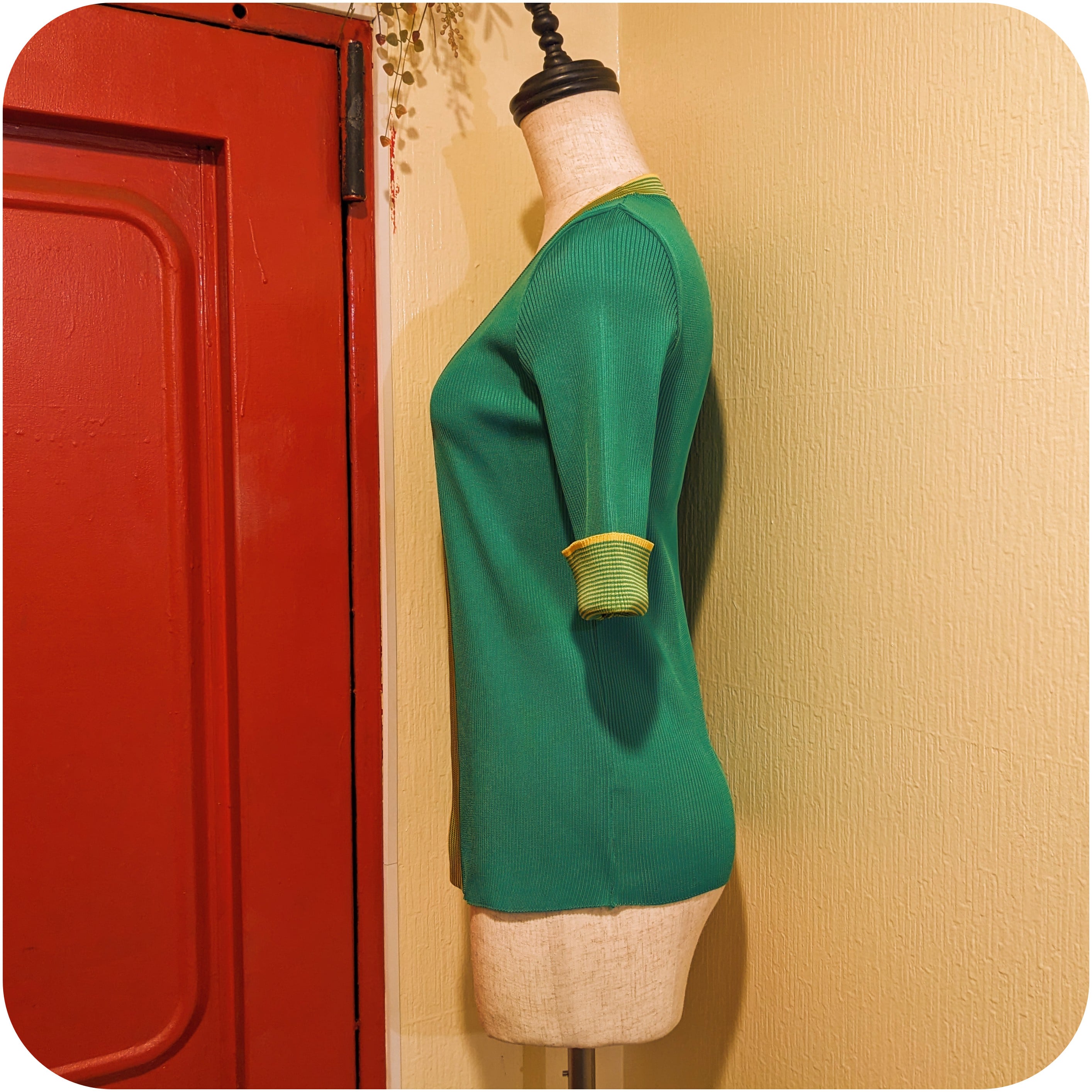 昭和レトロなグリーン×イエローのリブカーディガン