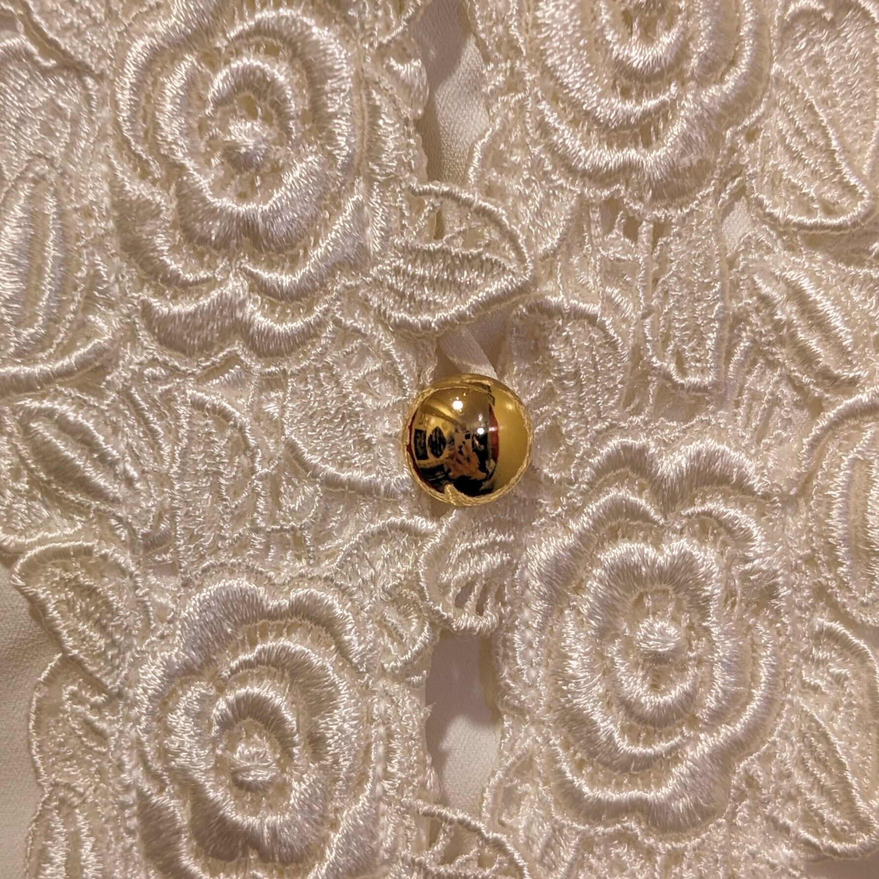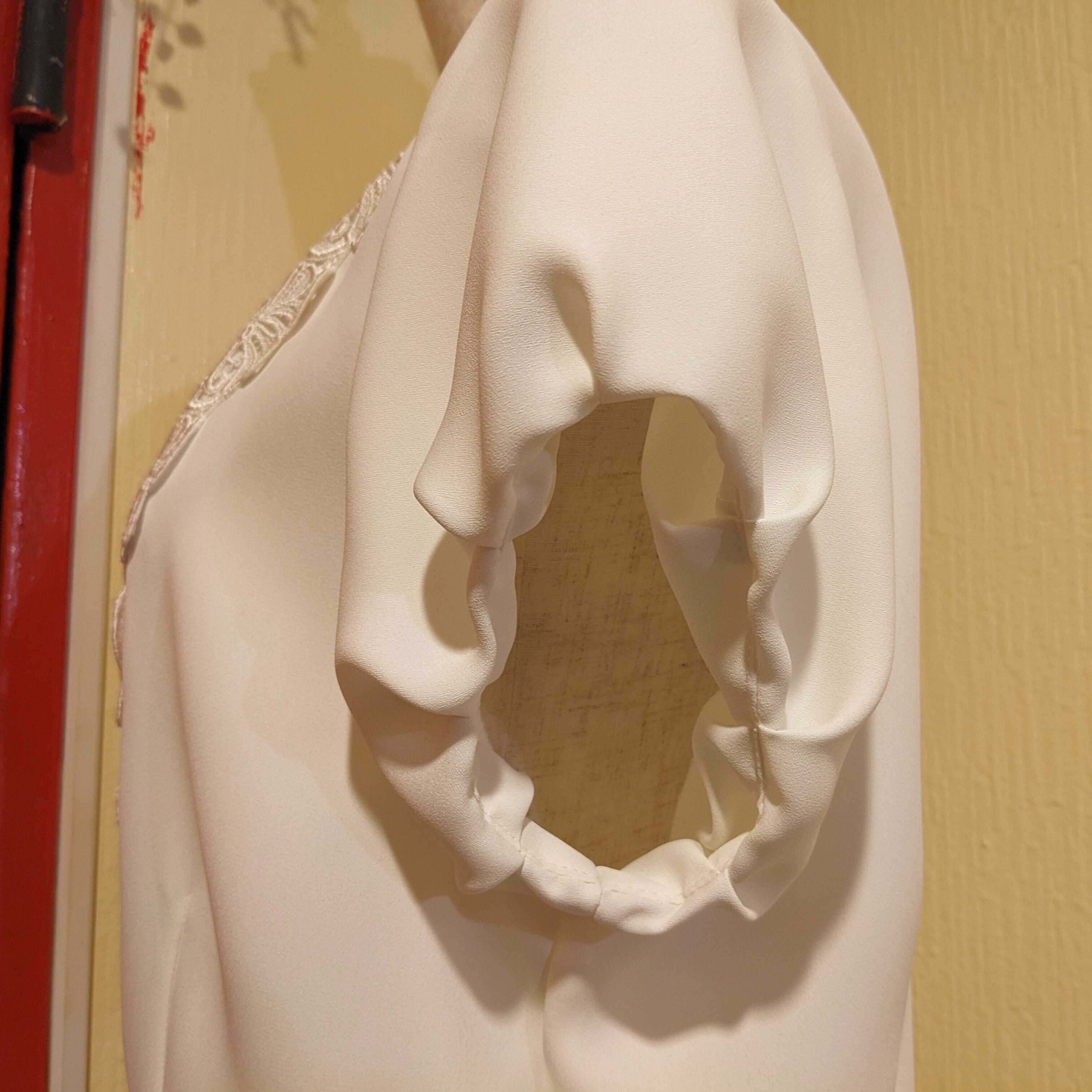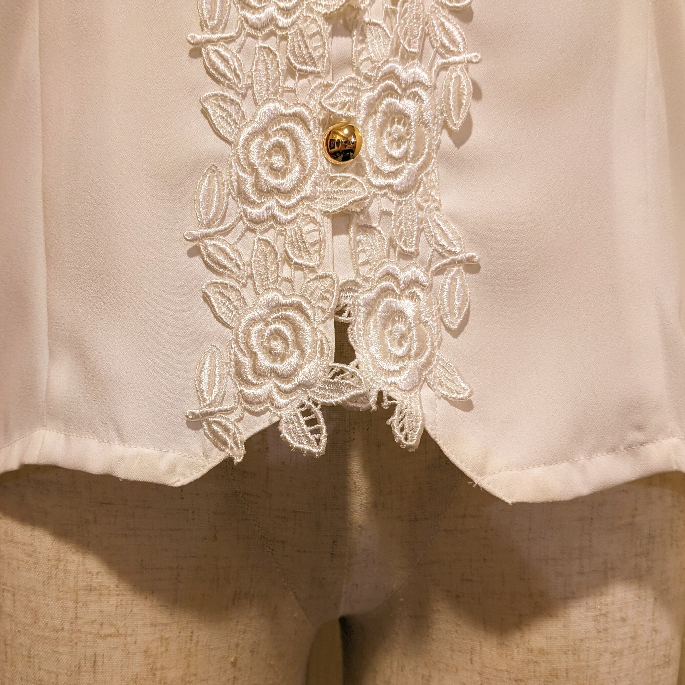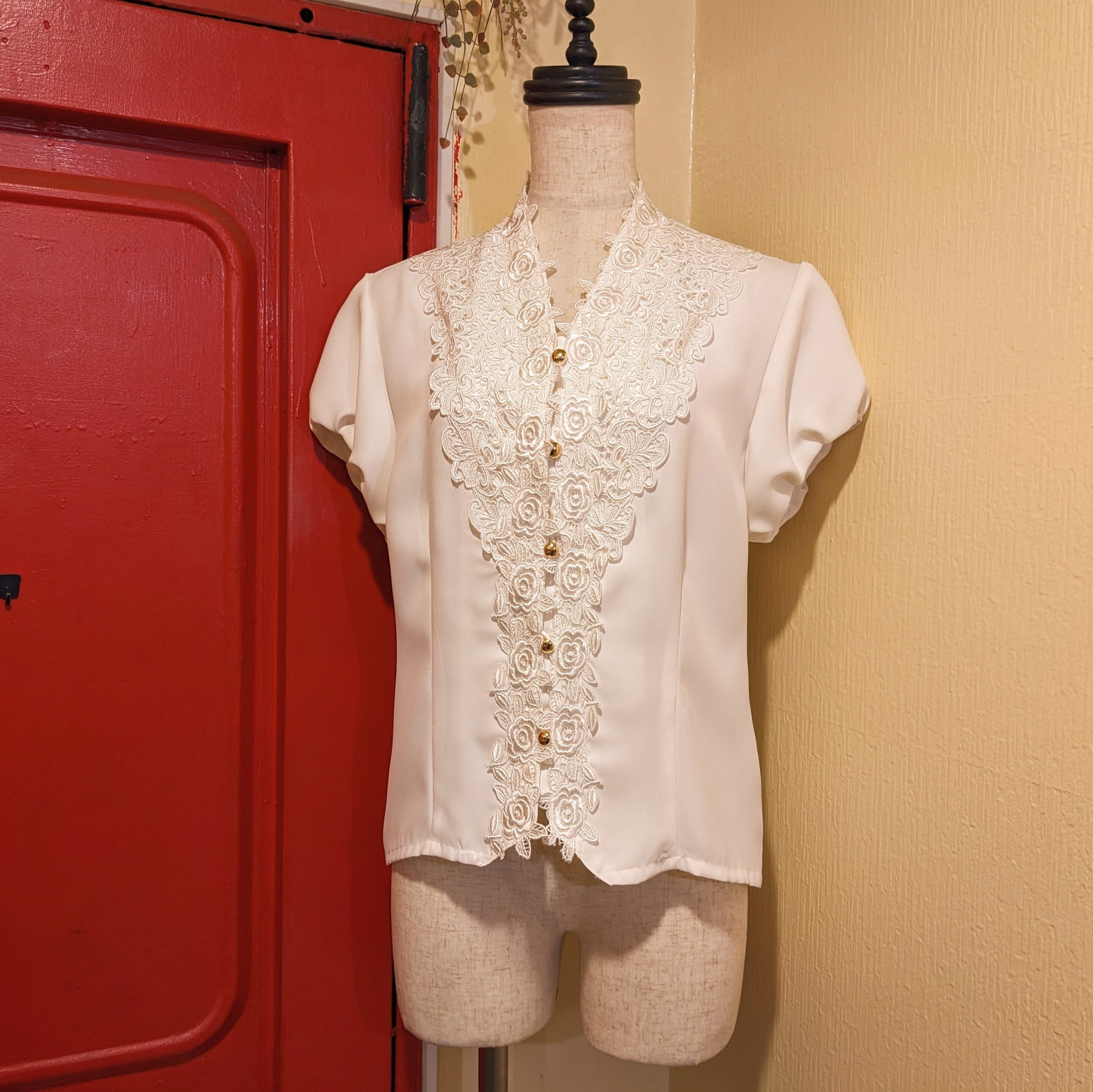 モードなホワイトのフラワーレースバルーンスリーブブラウス
