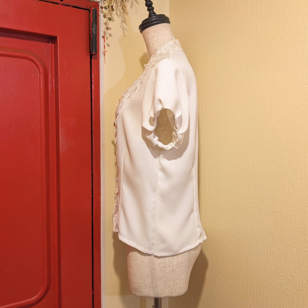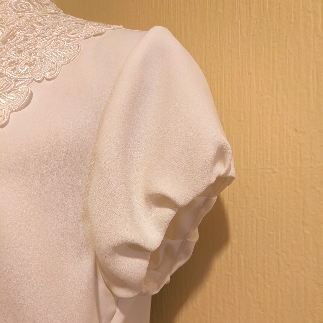 モードなホワイトのフラワーレースバルーンスリーブブラウスです。