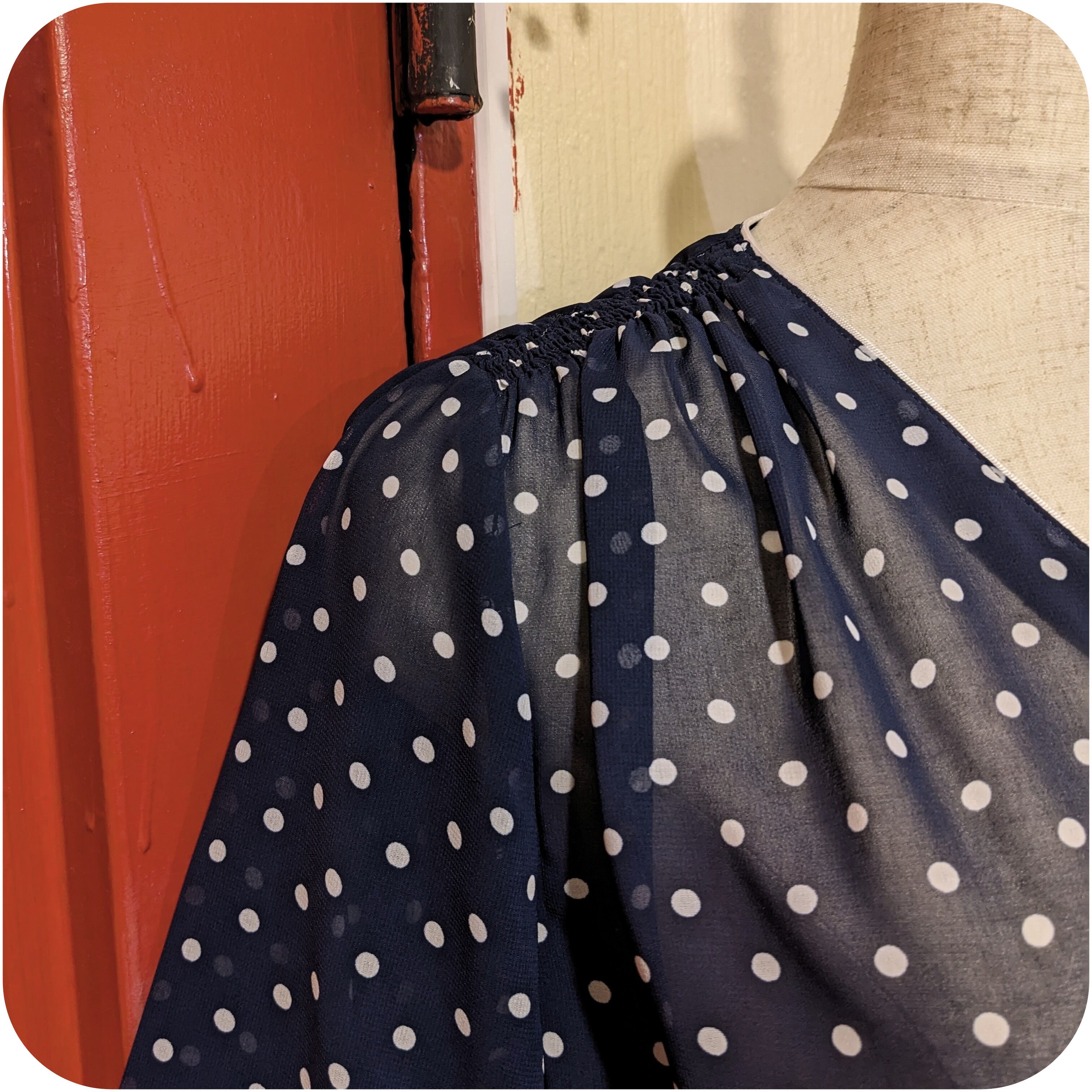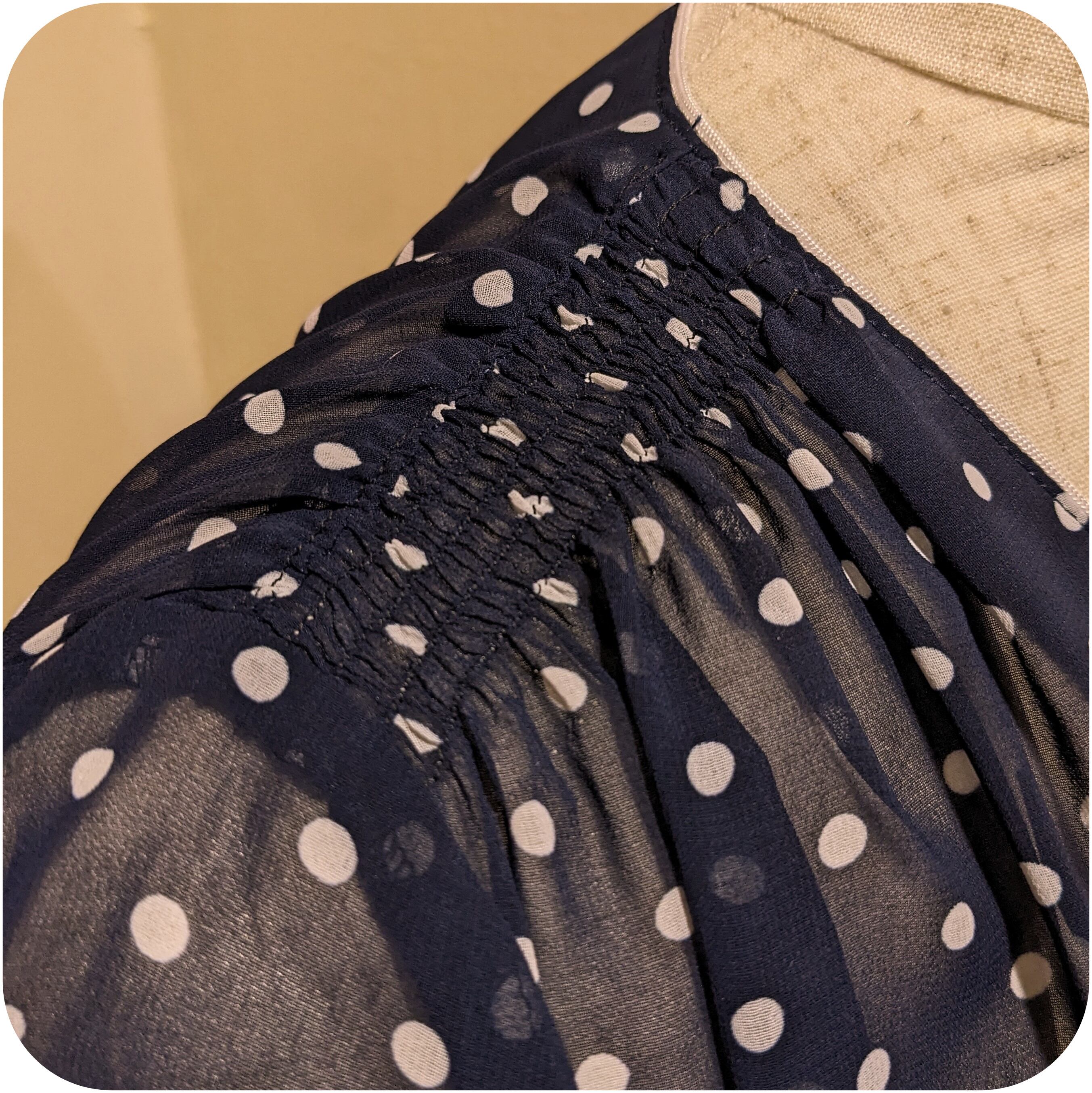 肩にあしらわれたノスタルジックなシャーリングデザインと、さわやかなホワイトのパイピングがとっても素敵。