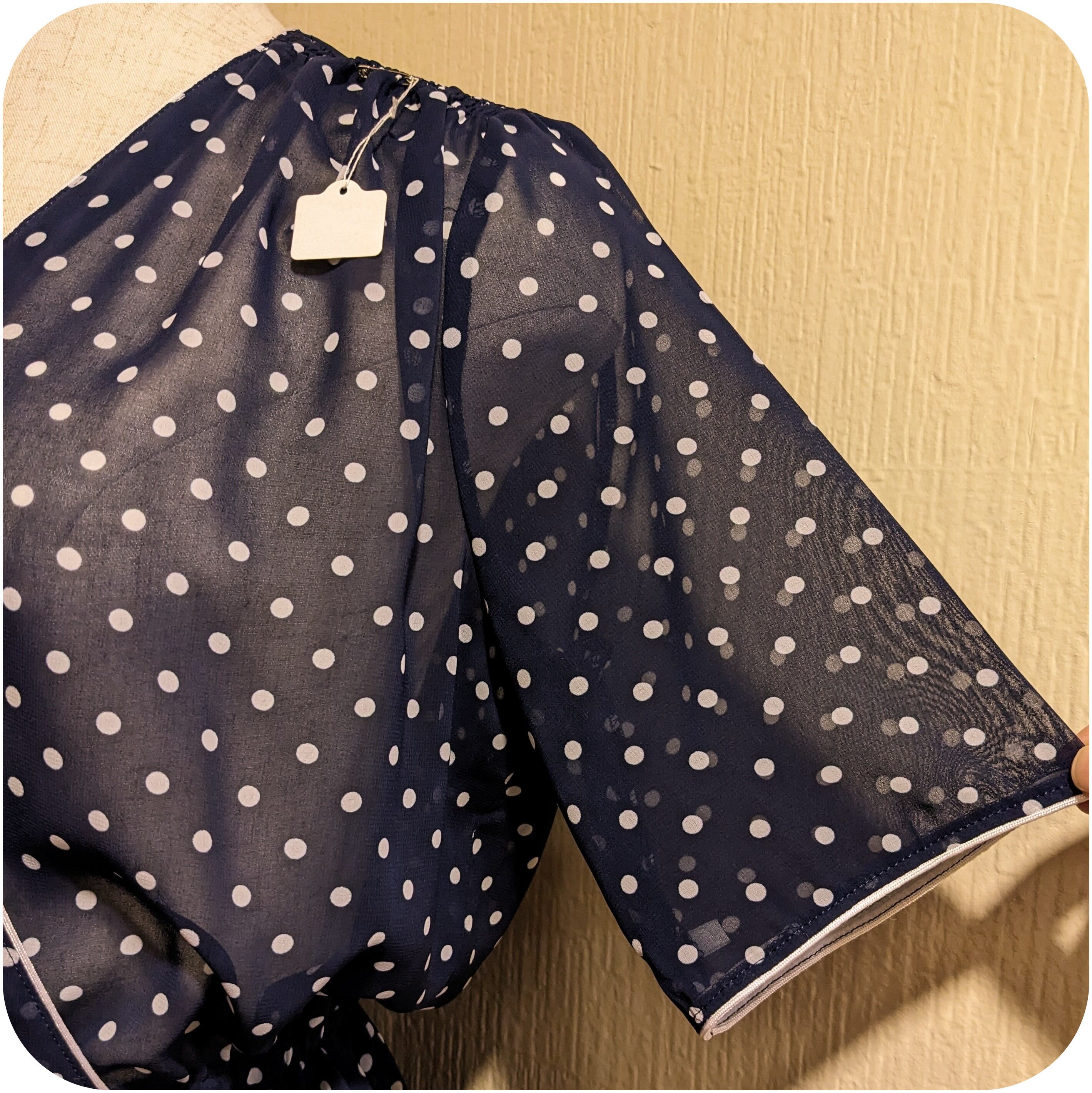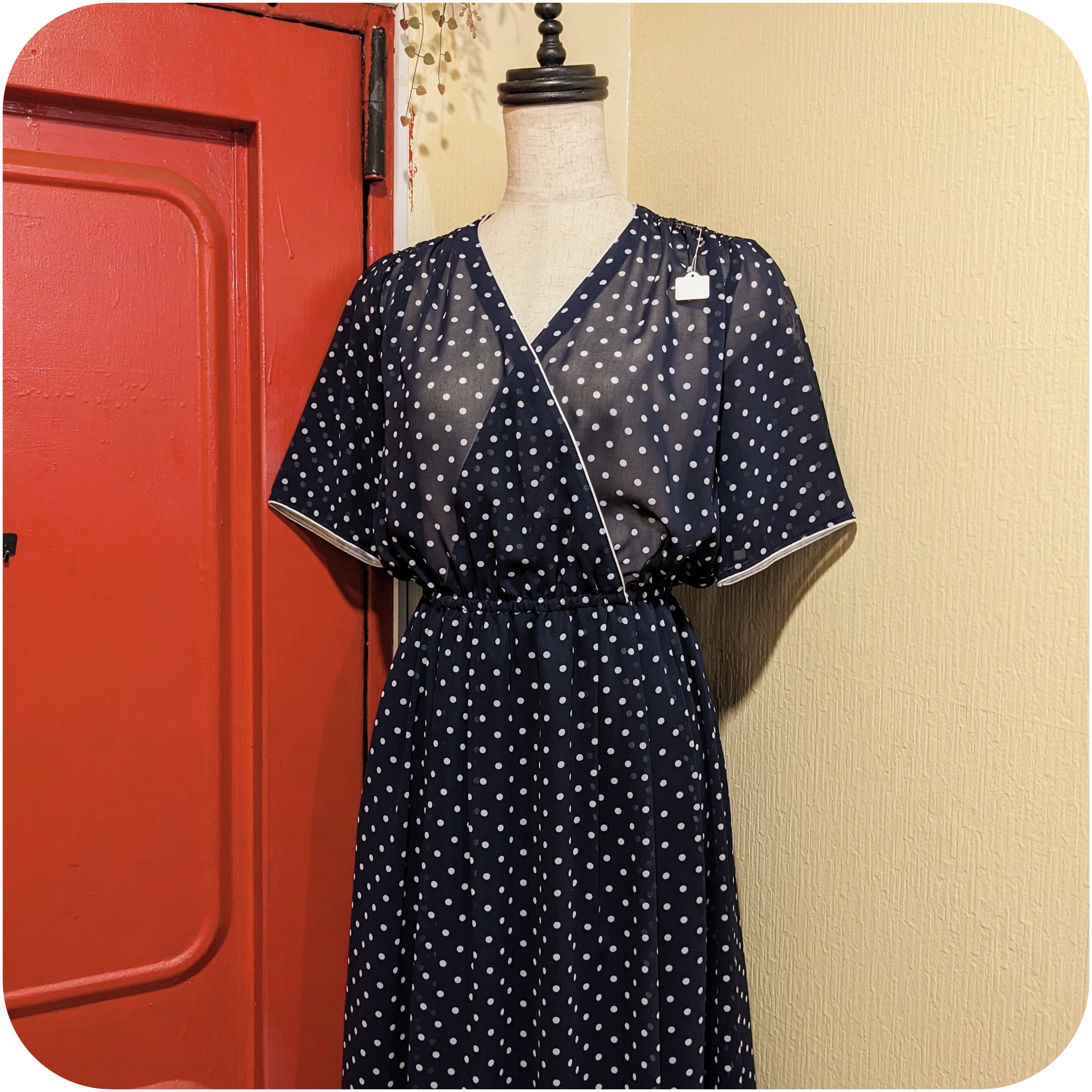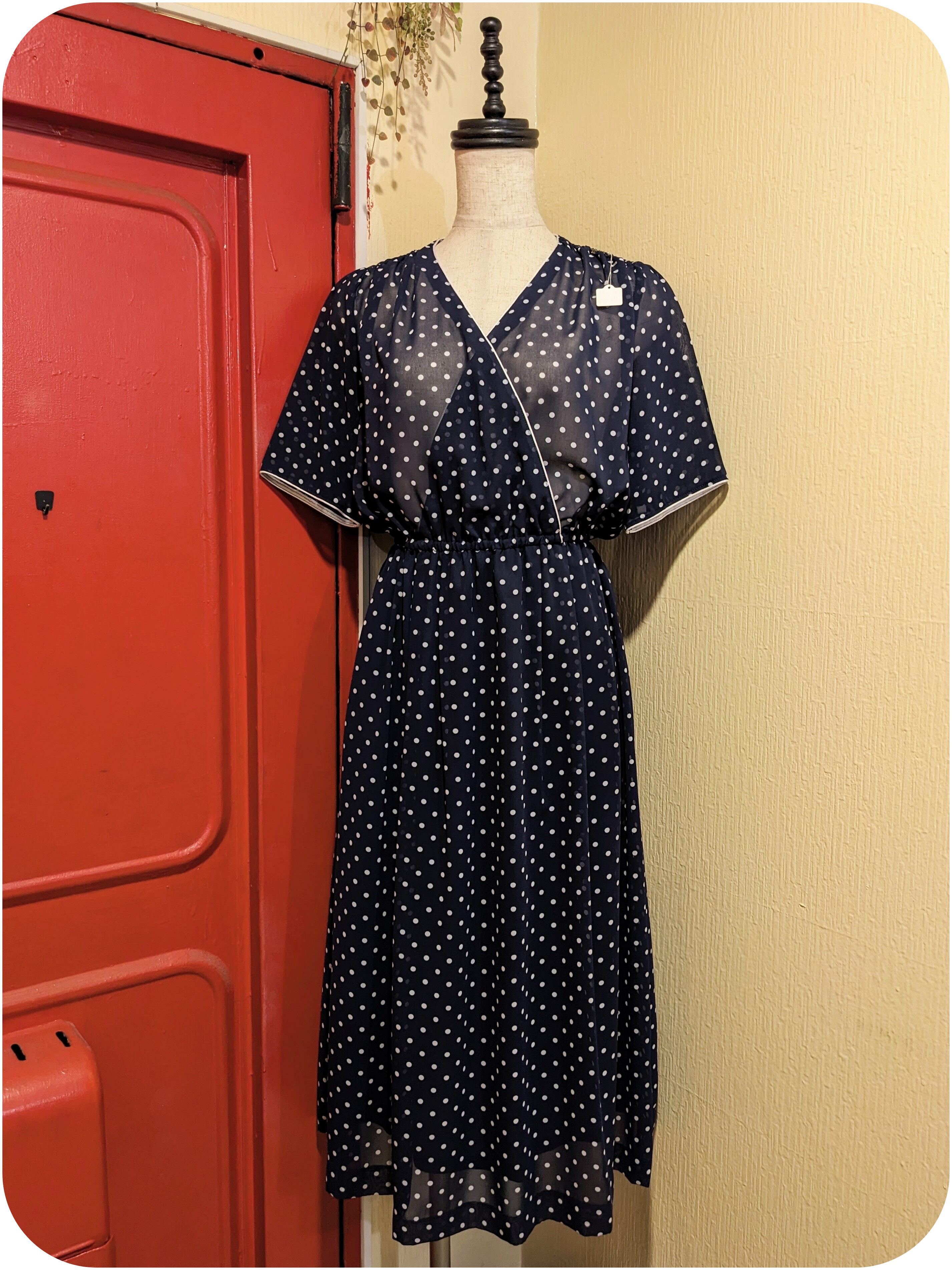 クラシカルなネイビー×ホワイトのドット柄カシュクールワンピースです。