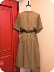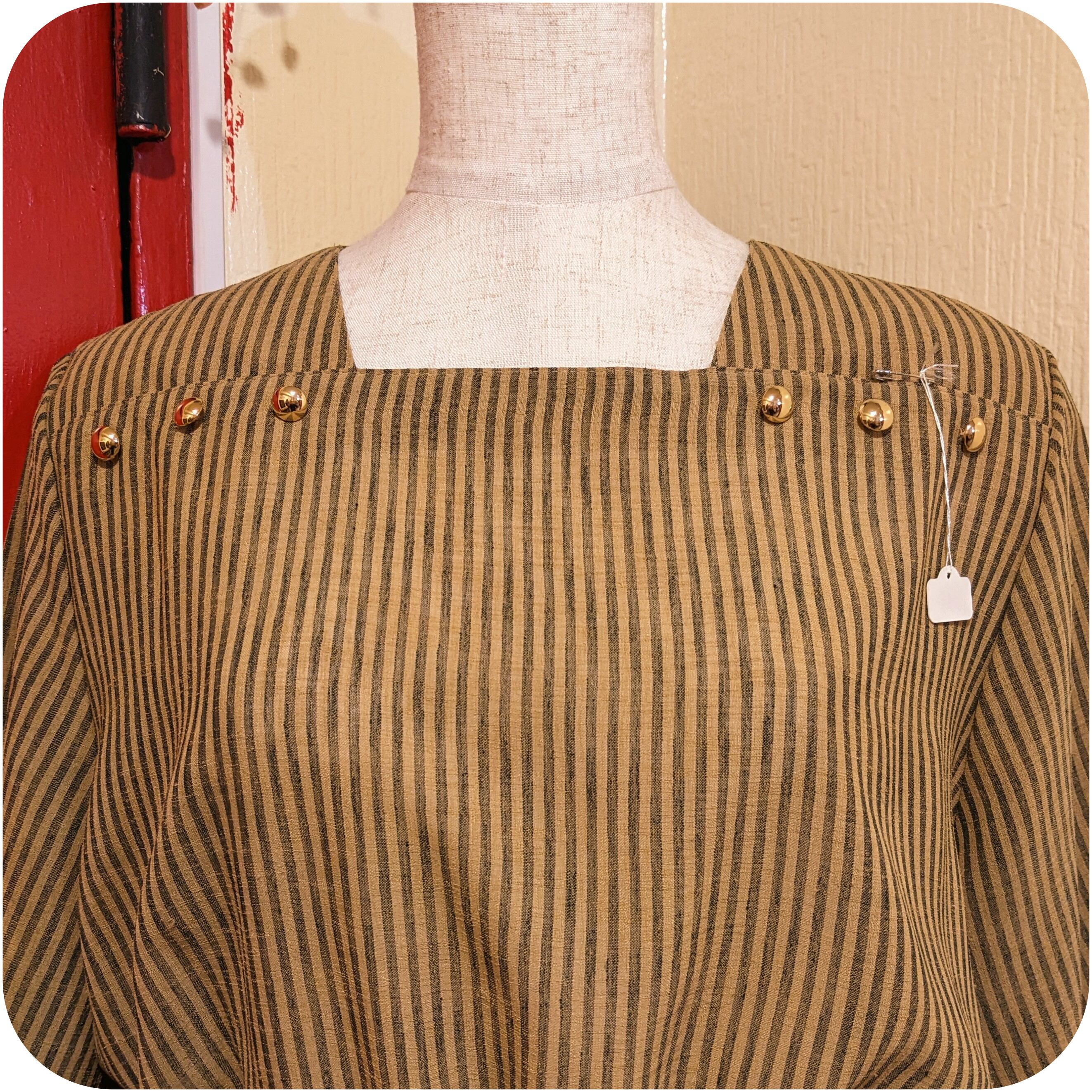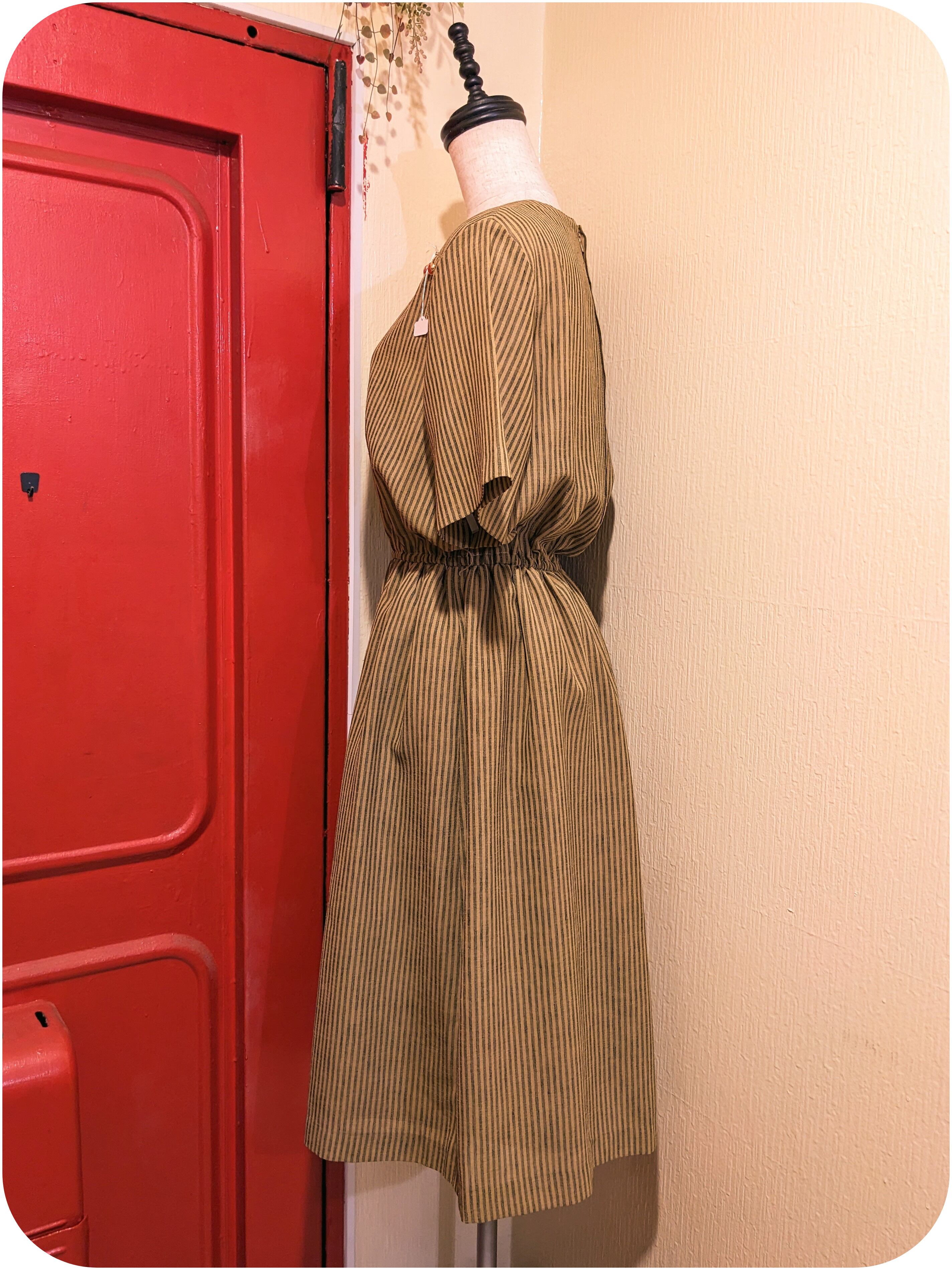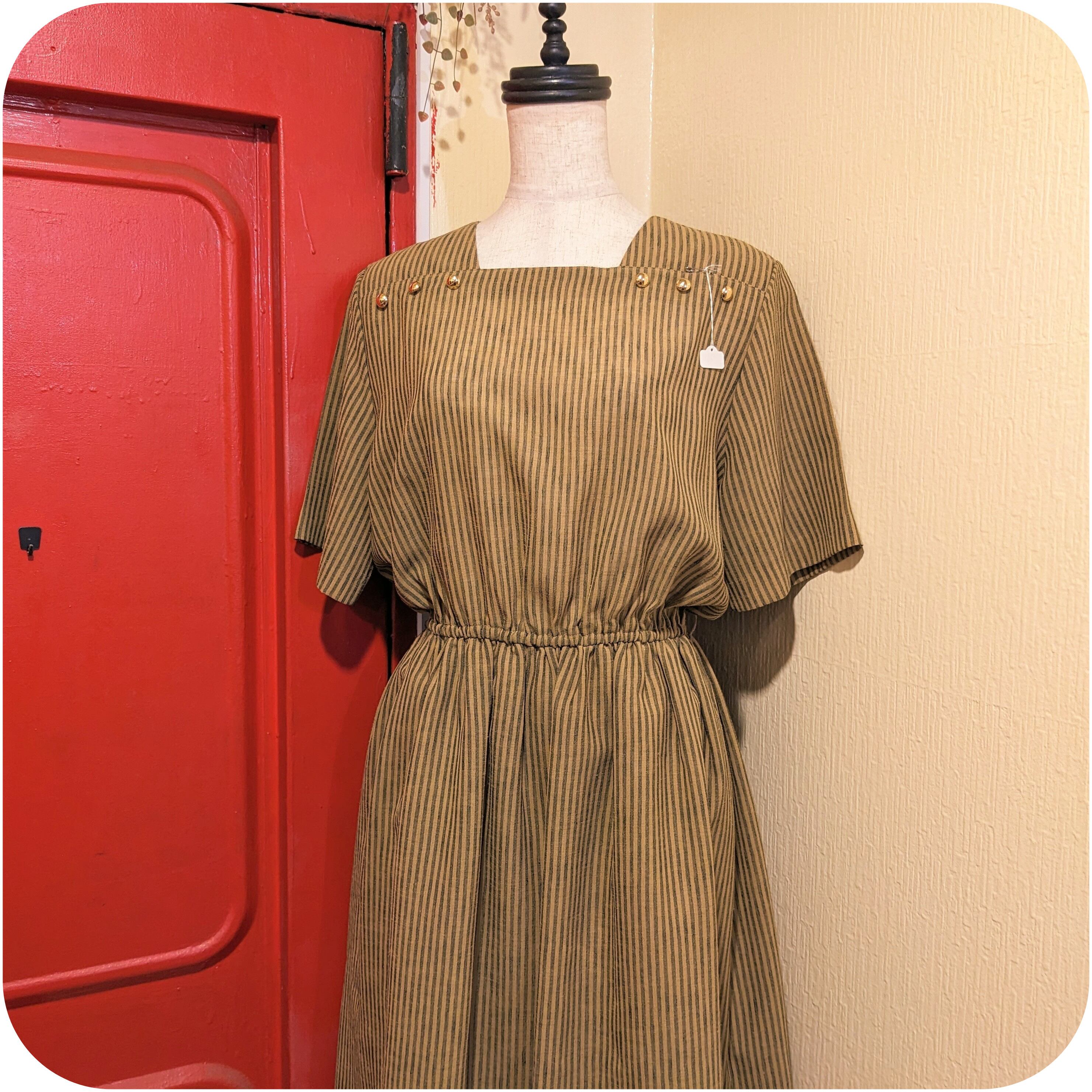 シックなマスタード×ダークグレーのストライプ柄ワンピースです。