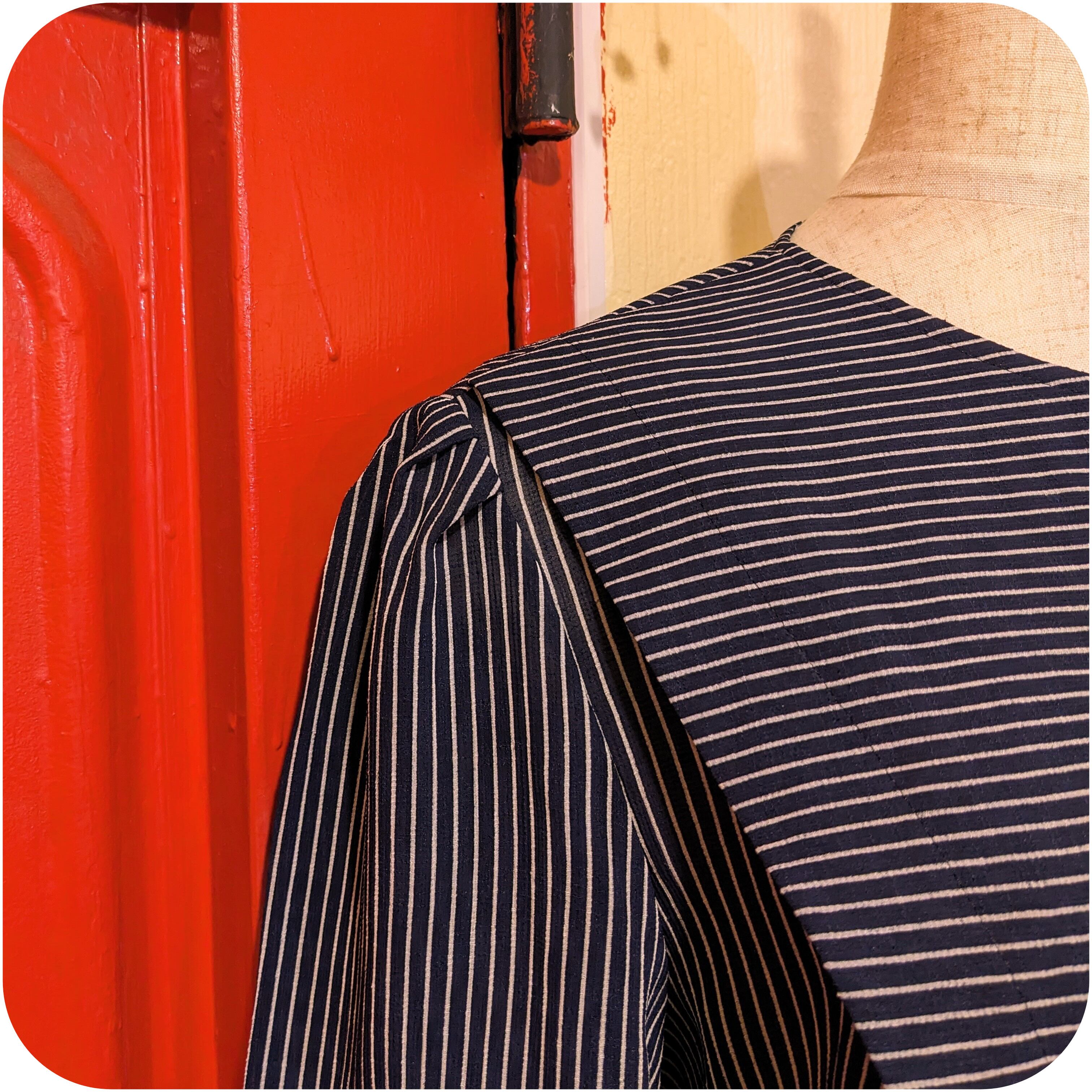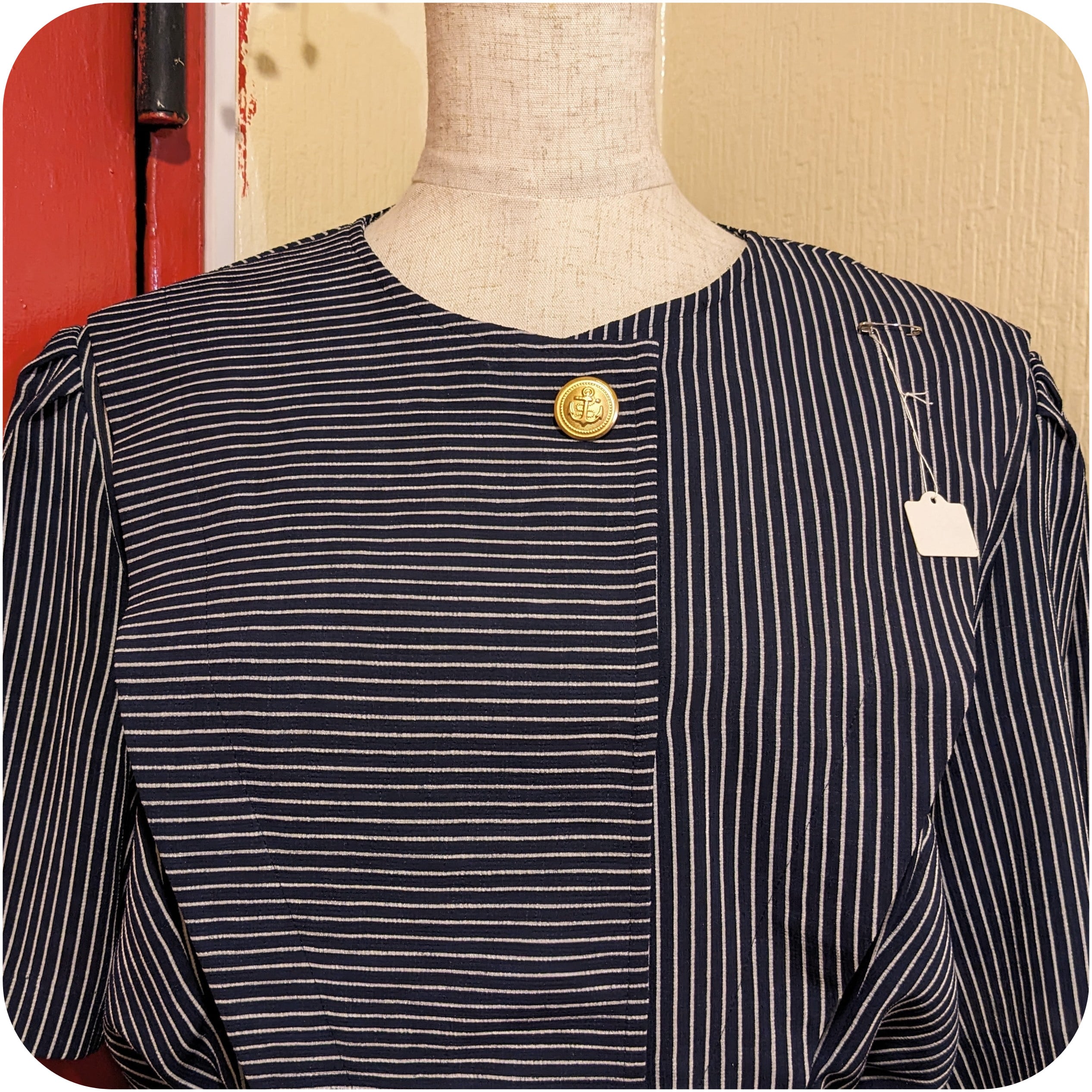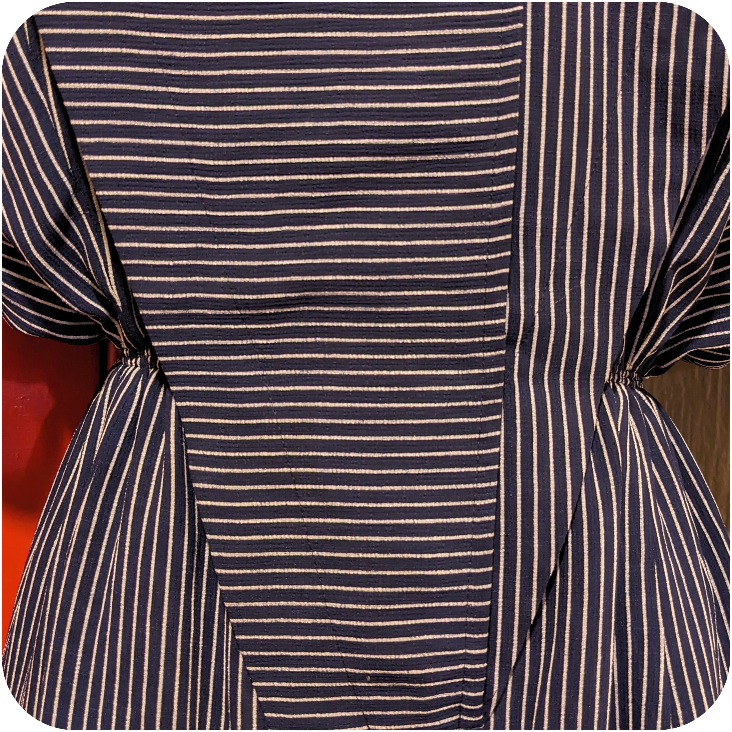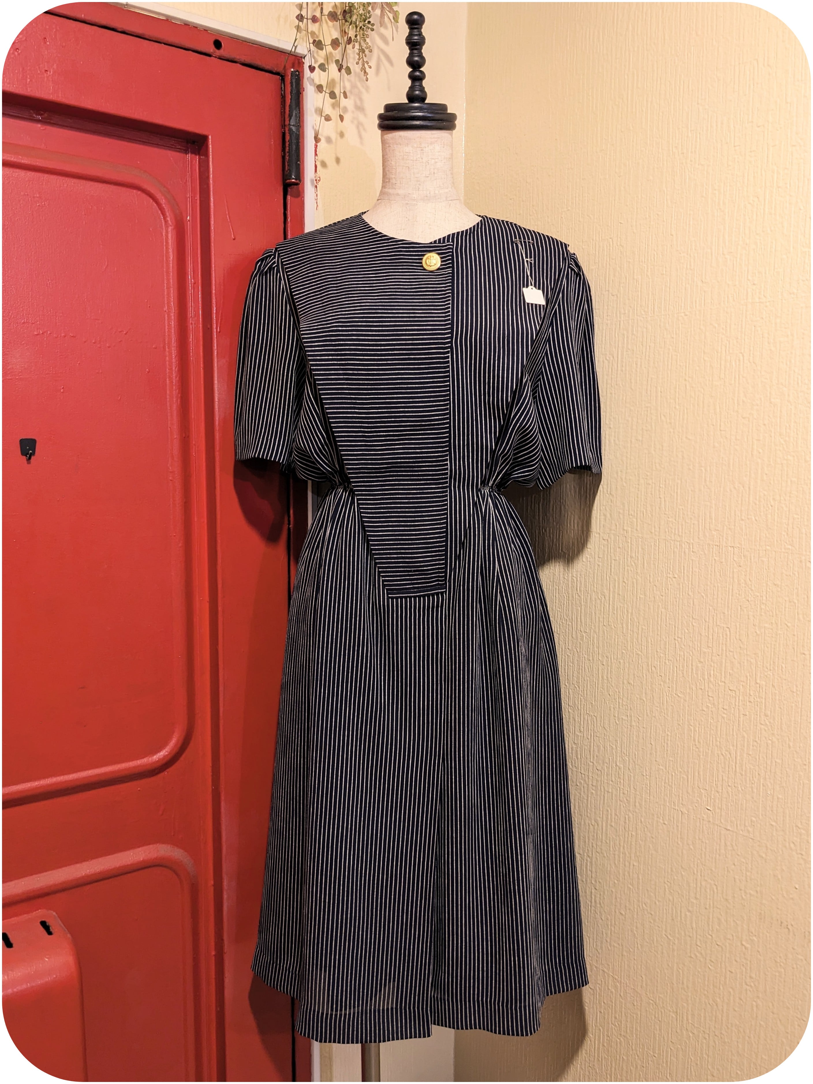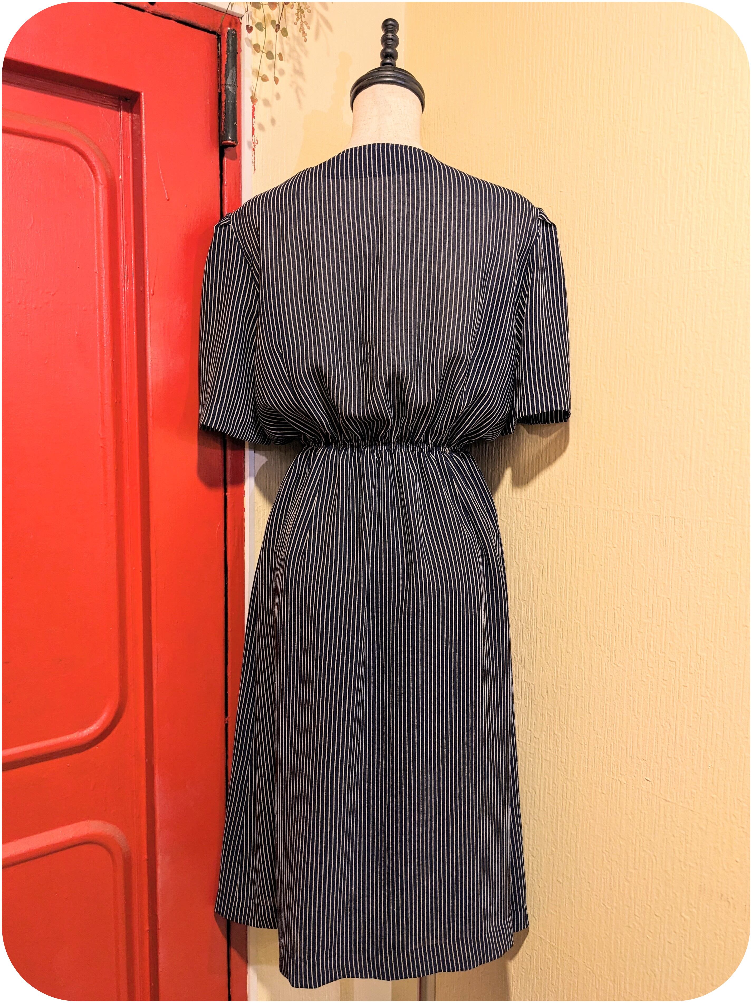 モードなネイビー×ホワイトのストライプ柄アシンメトリーデザインワンピース