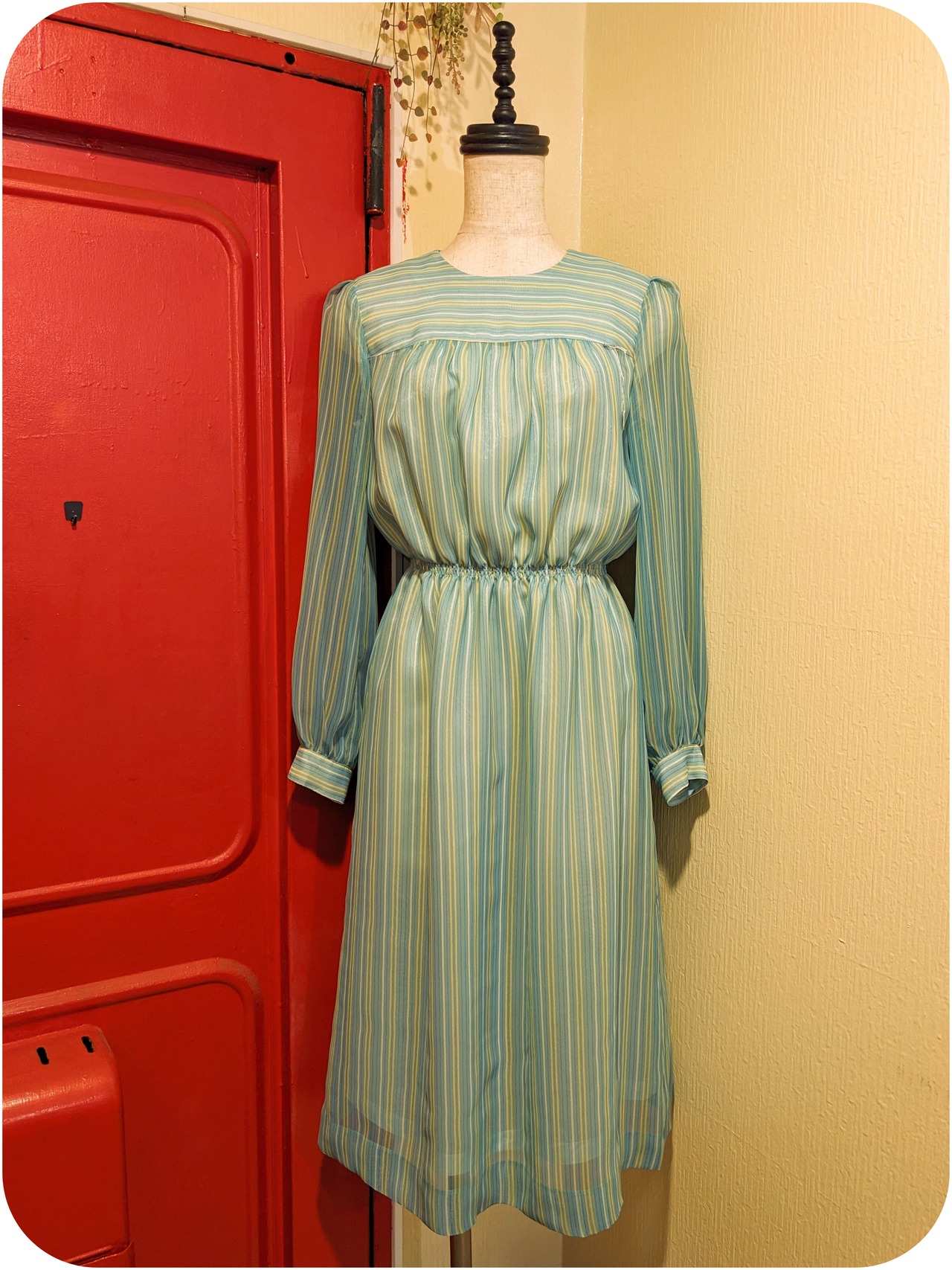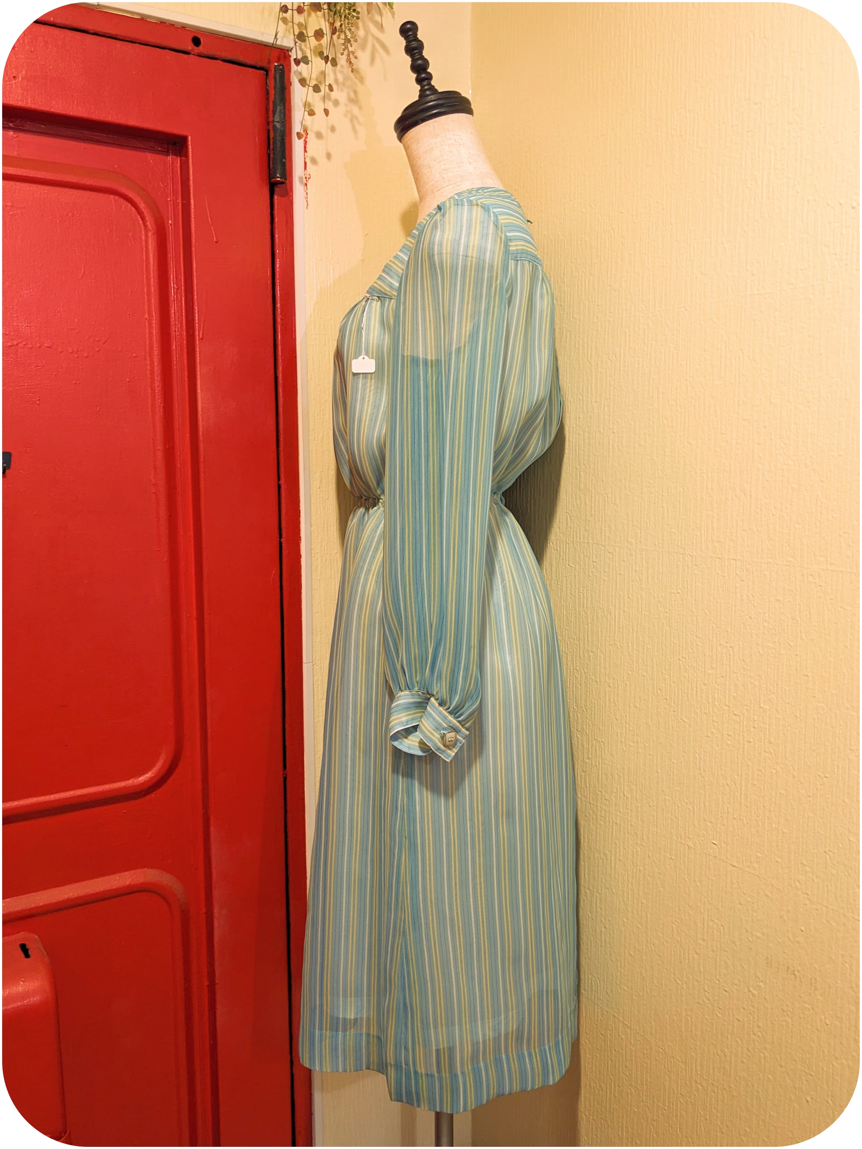 レトロなアイスグリーン×ホワイト×イエローのストライプ柄シアーワンピースです。