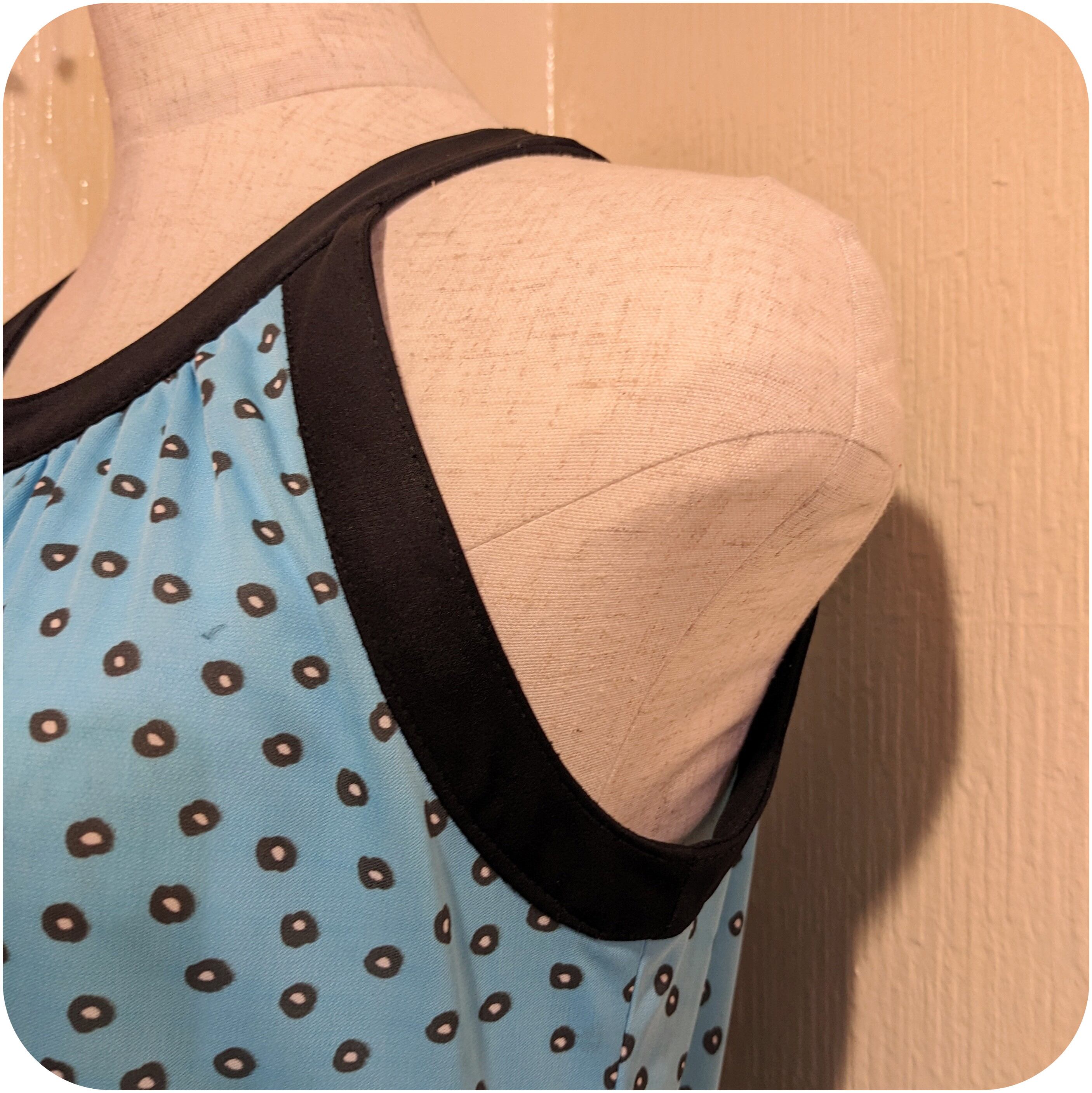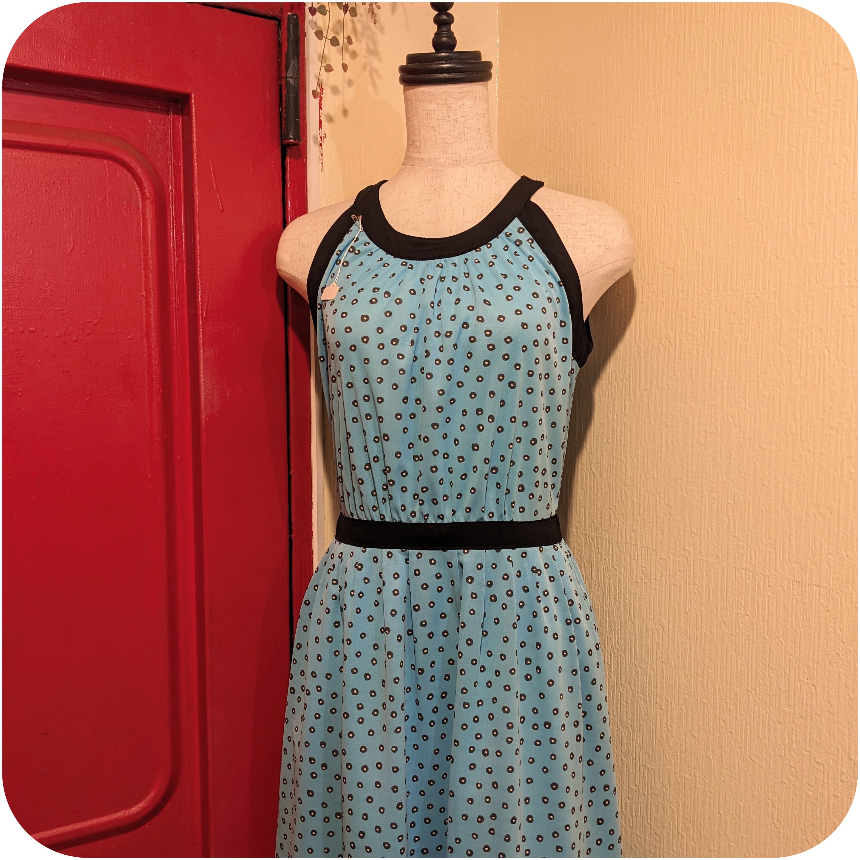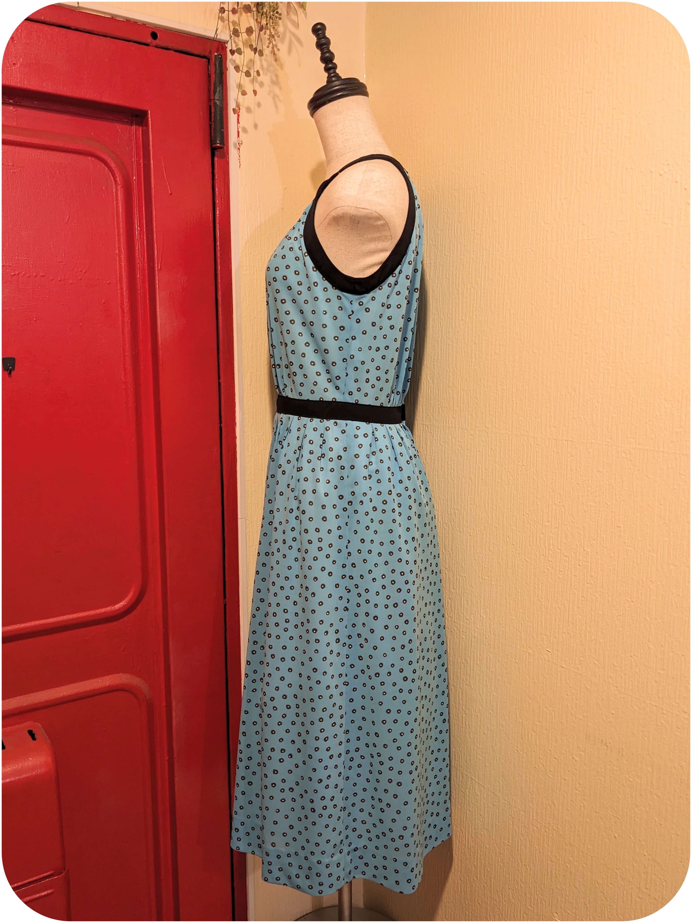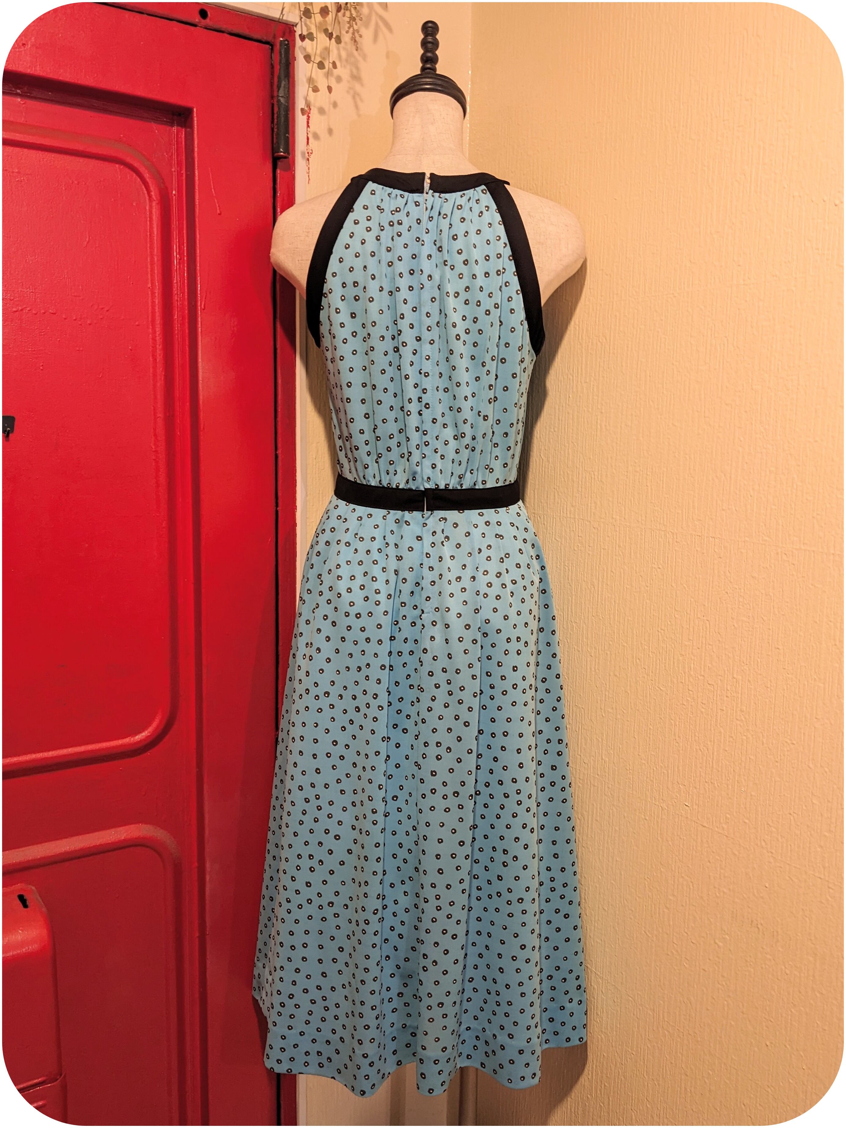 レトロなスカイブルー×ブラックのドット柄ワンピース
