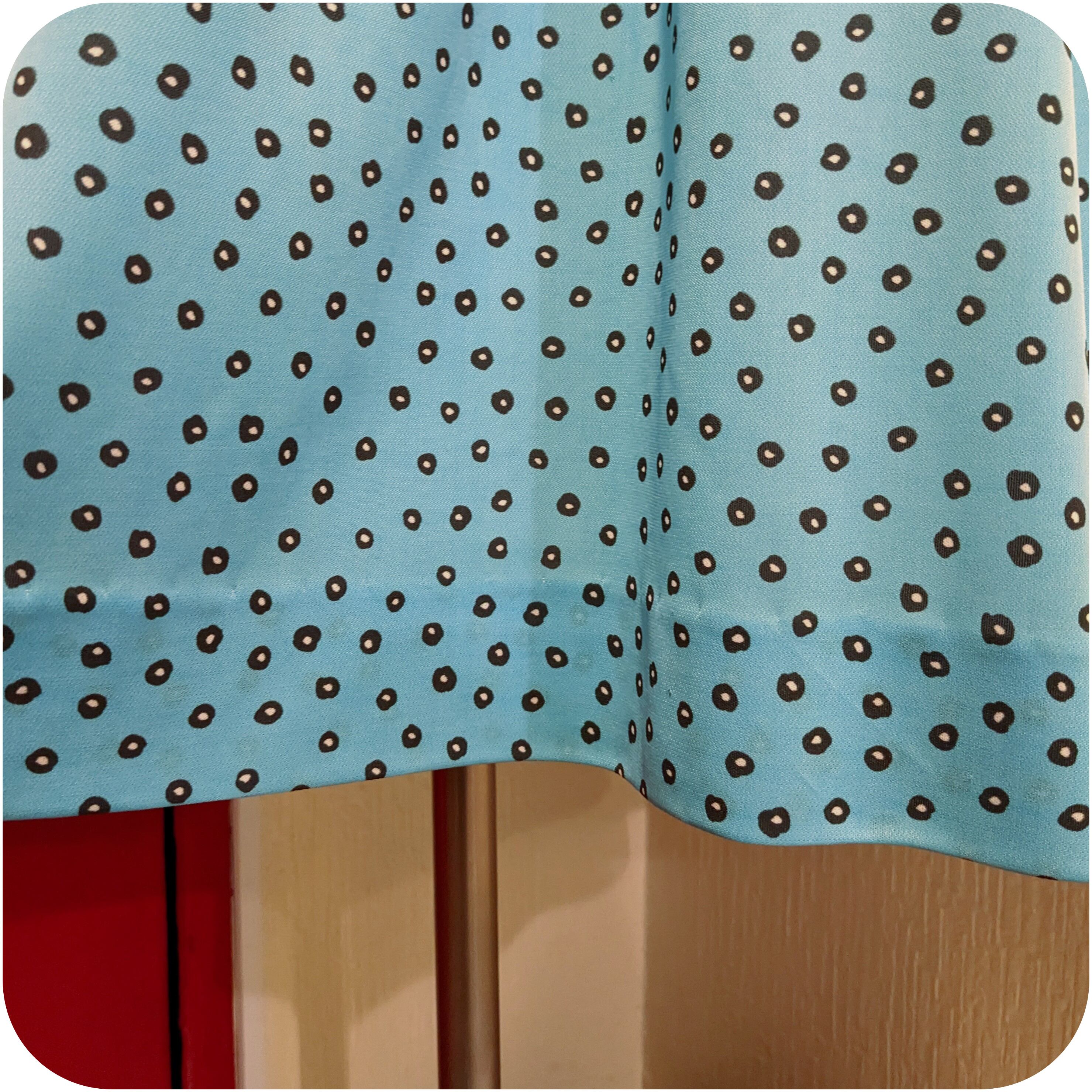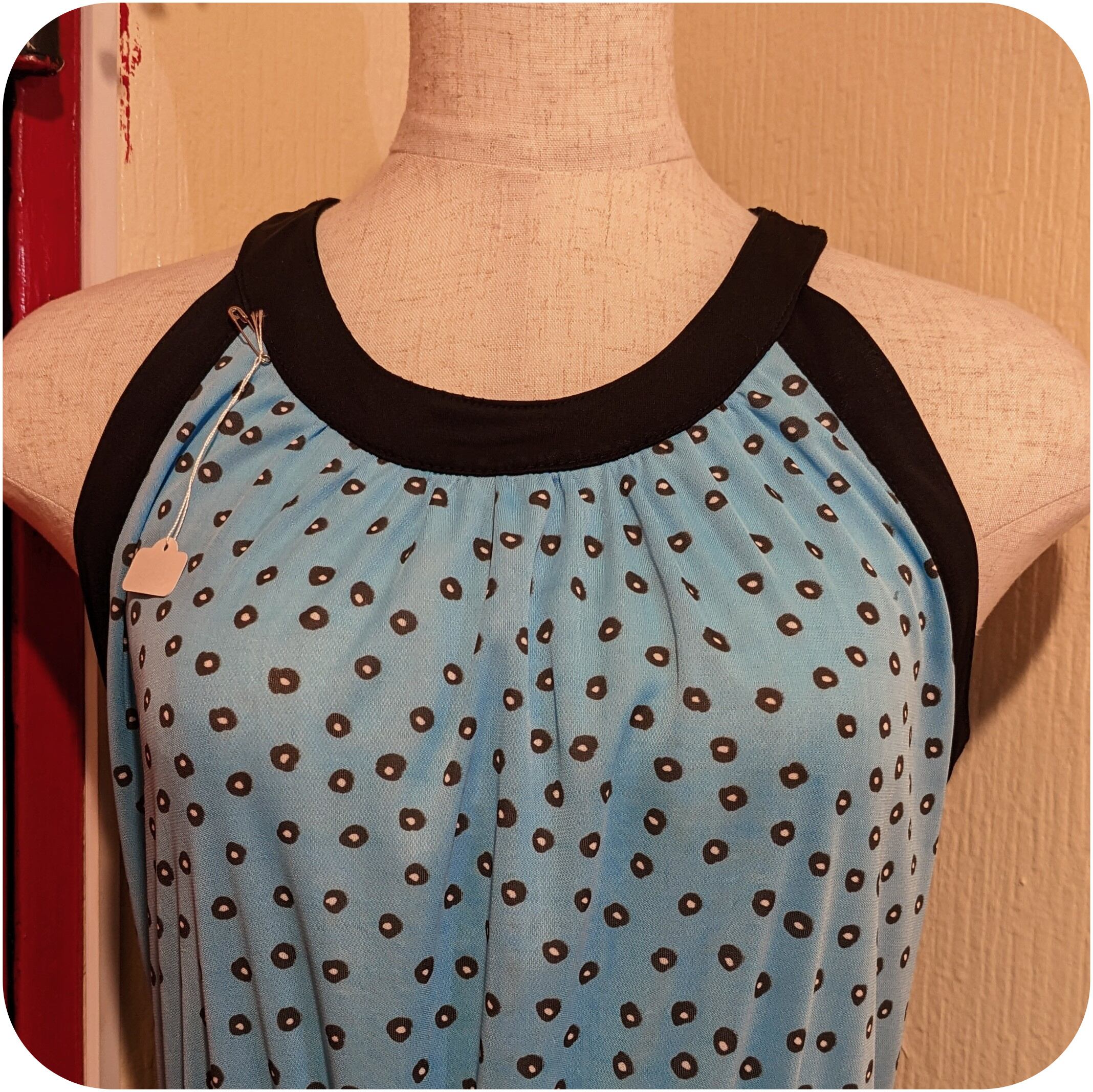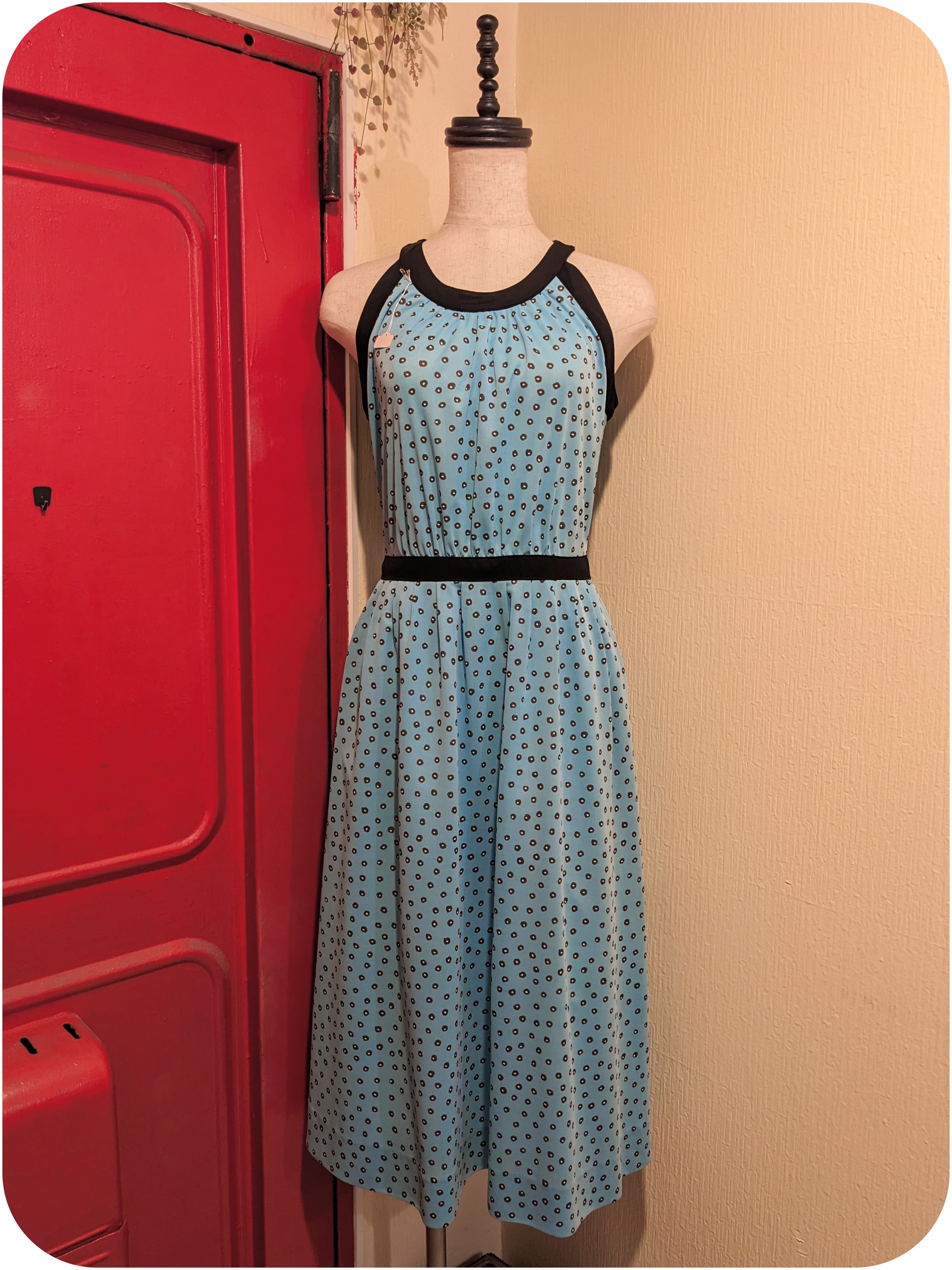 レトロなスカイブルー×ブラックのドット柄ワンピースです。