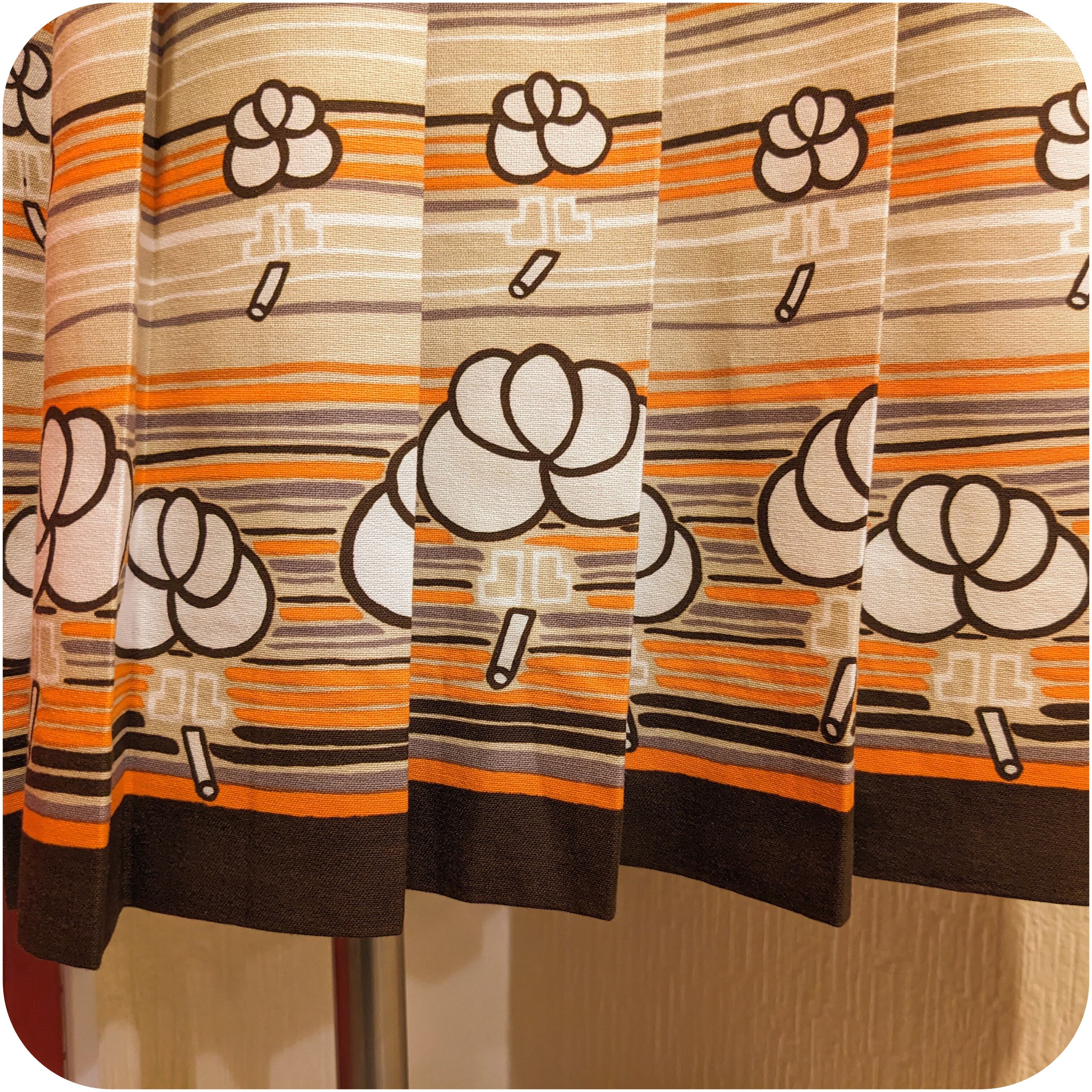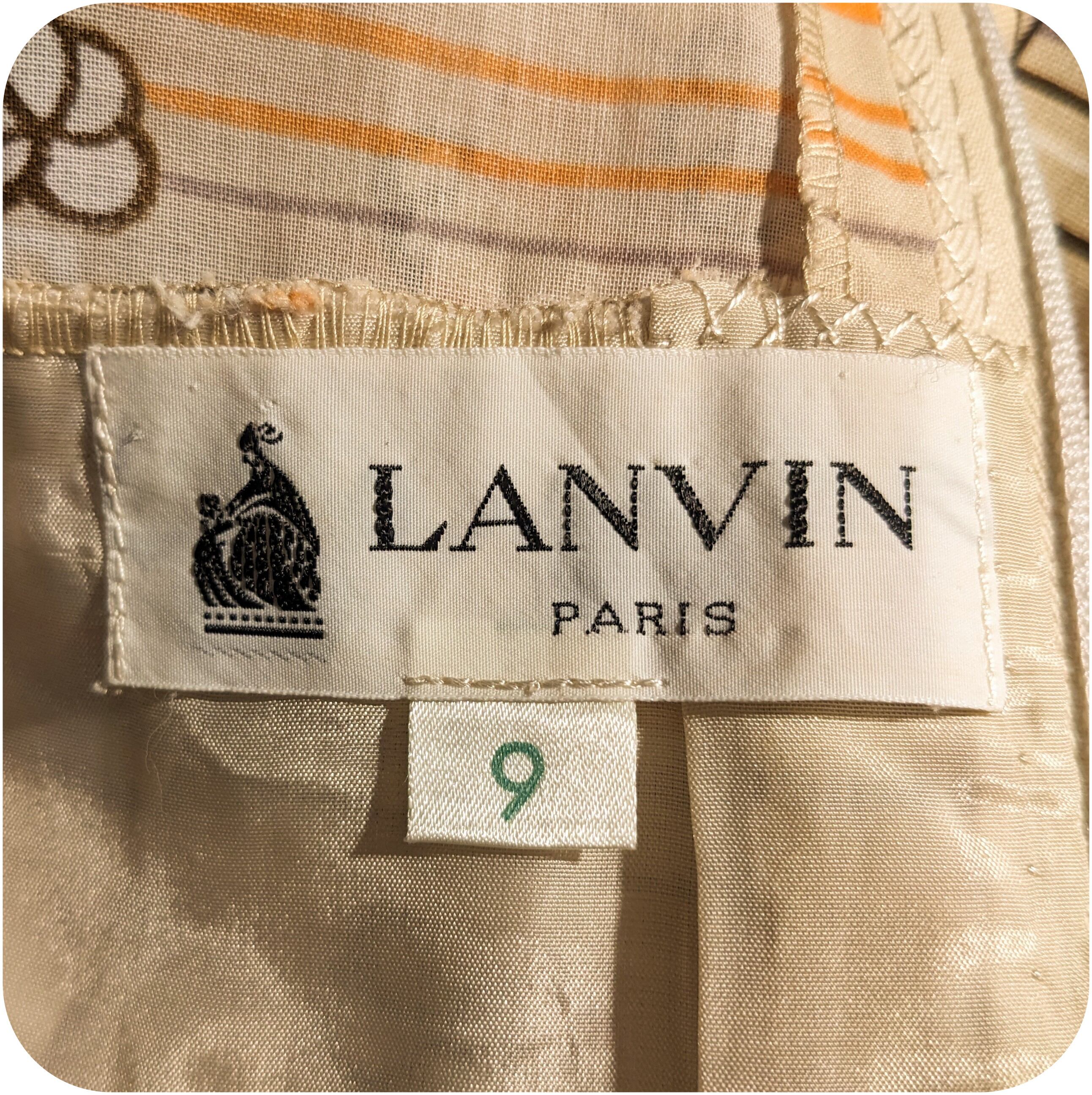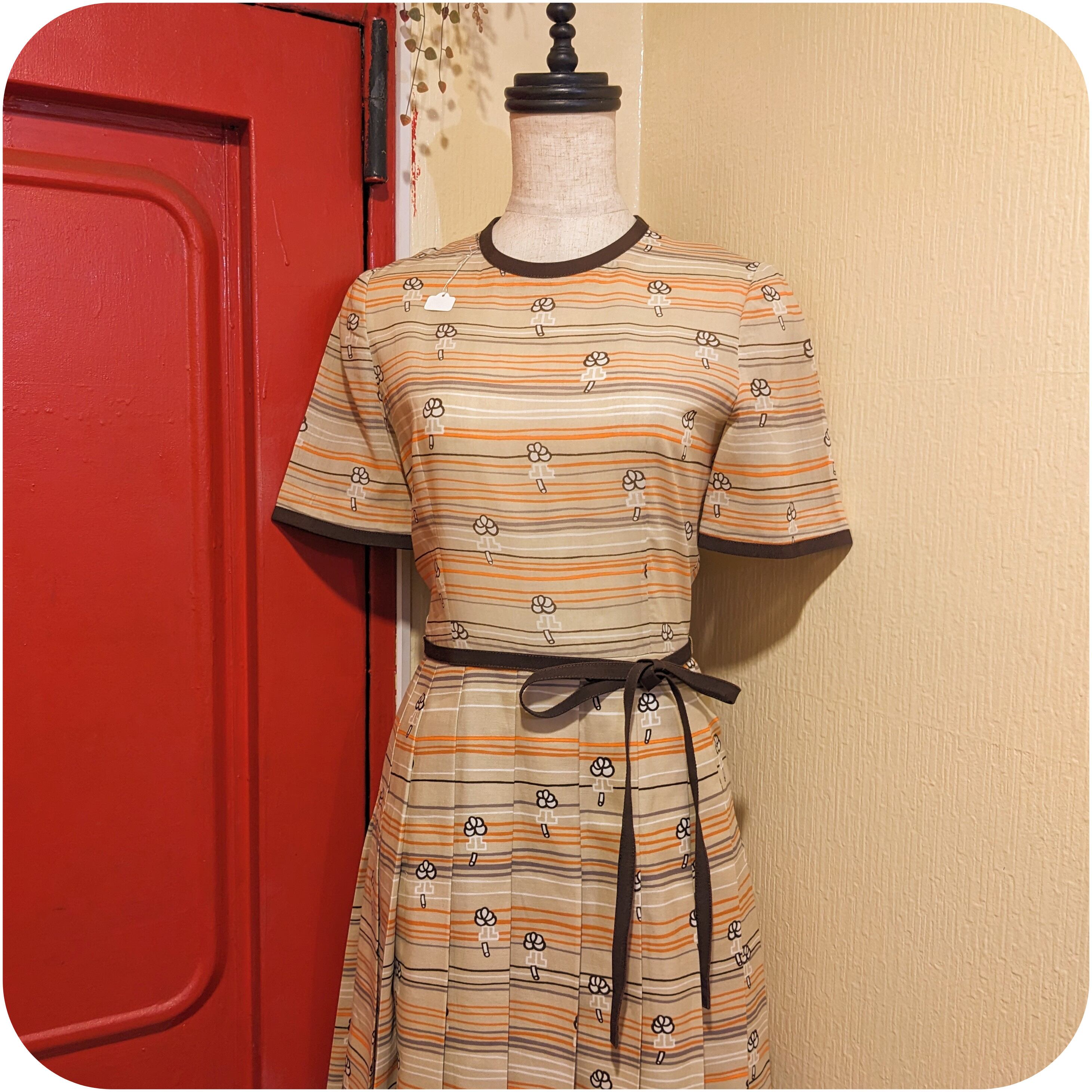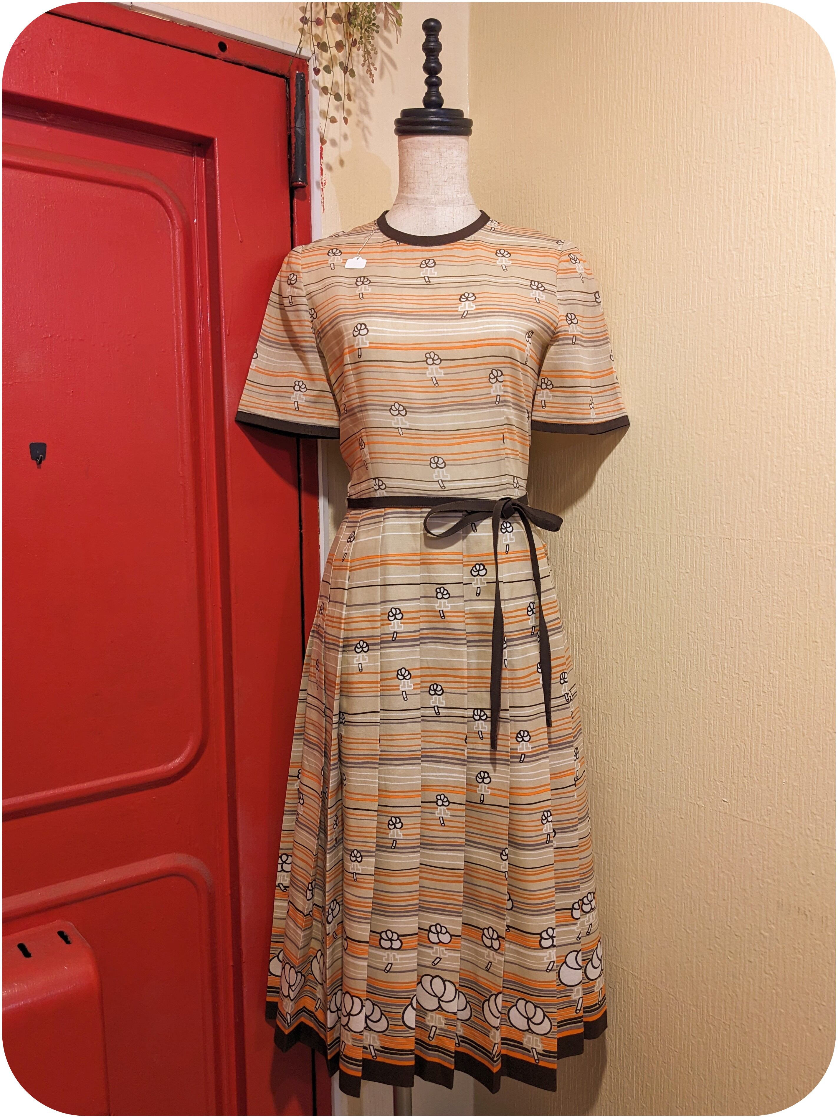 LANVIN レトロなベージュ×オレンジ×ブラウンのフラワーボーダー柄ワンピースです。