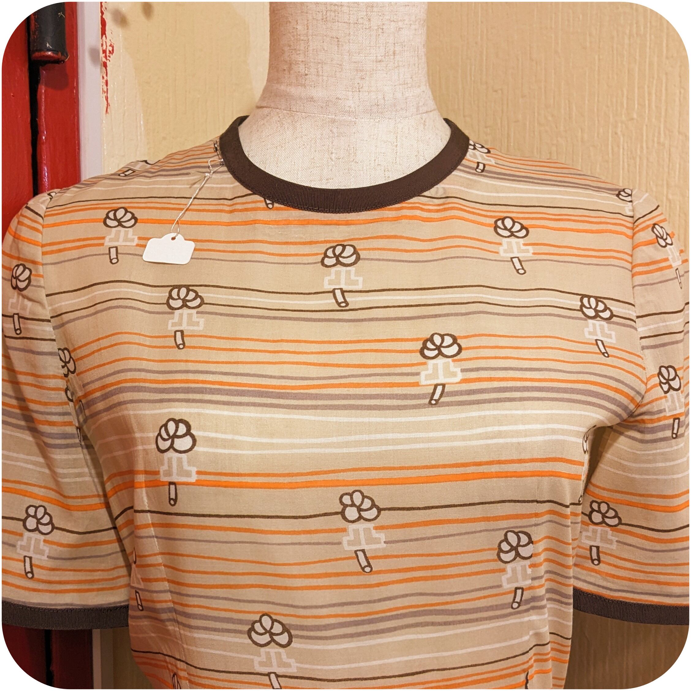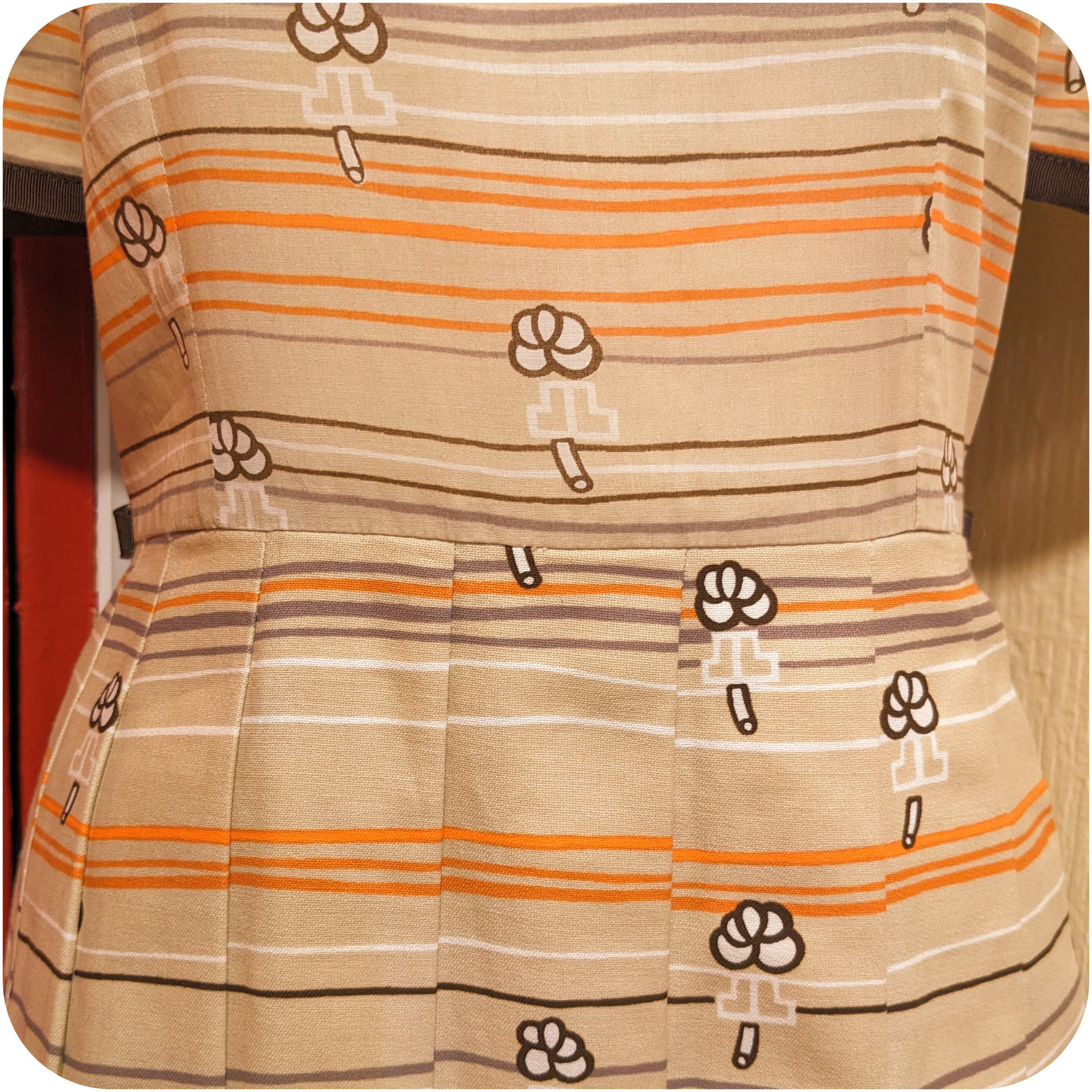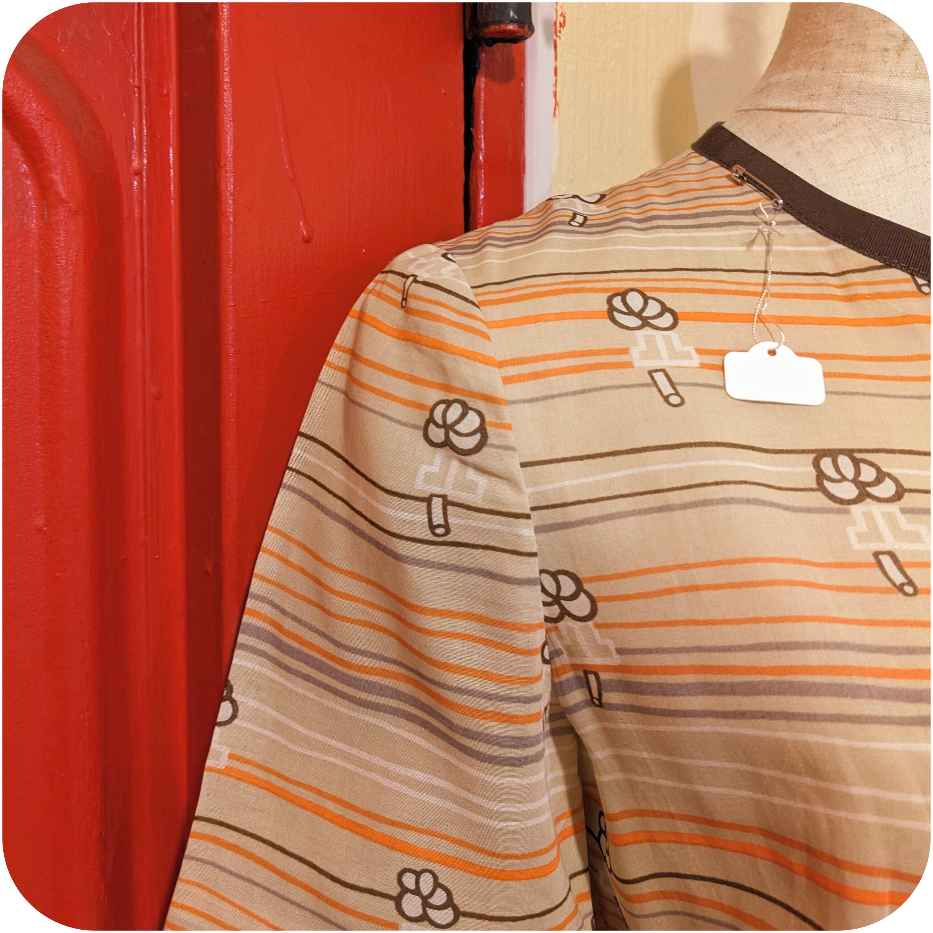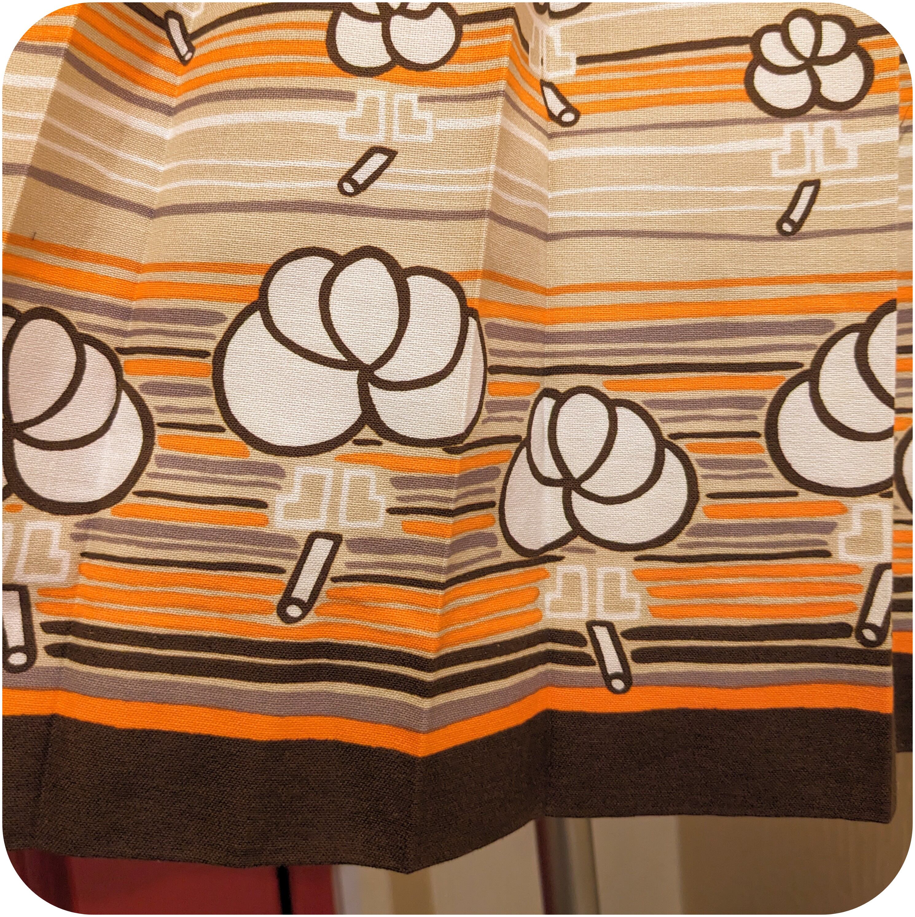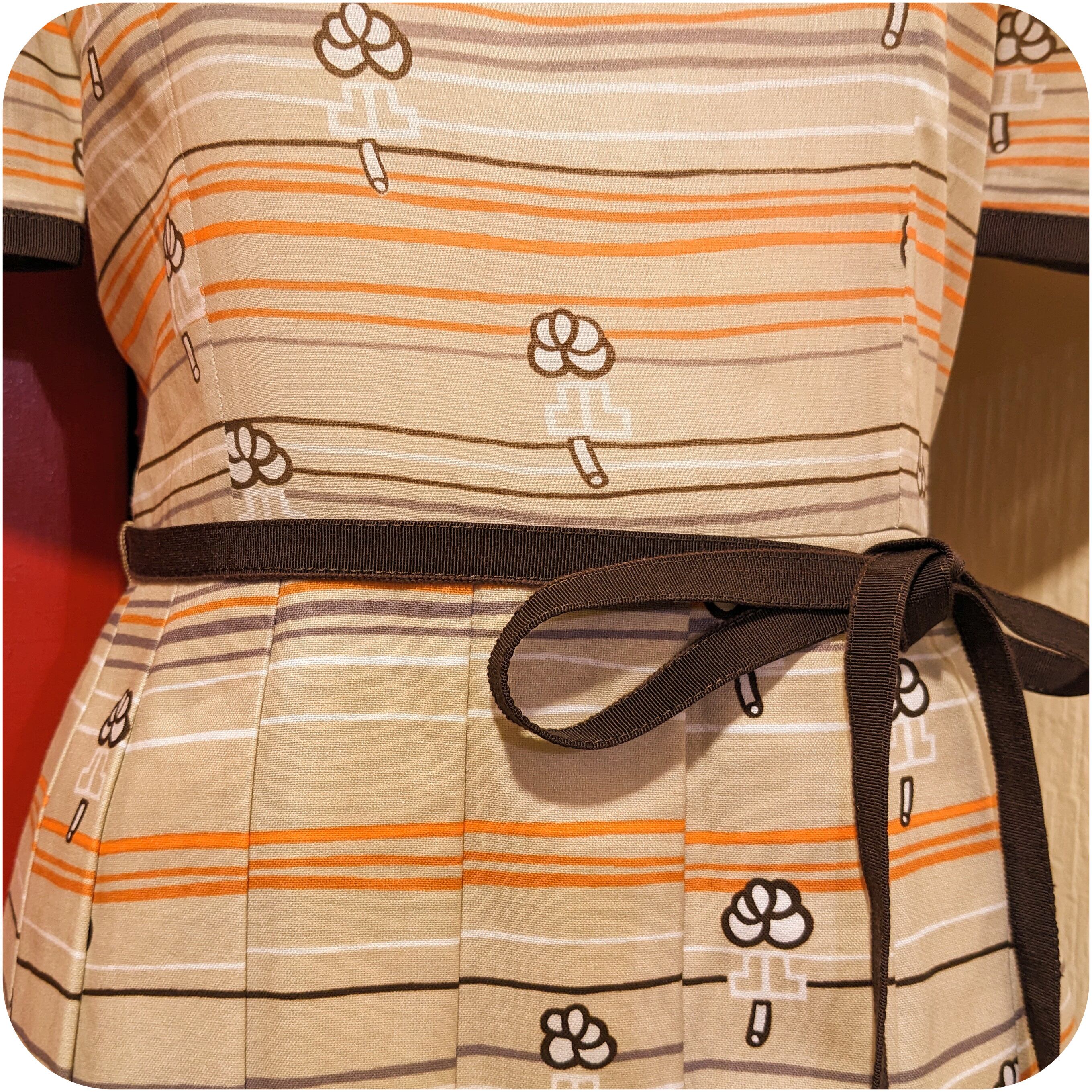 LANVIN レトロなベージュ×オレンジ×ブラウンのフラワーボーダー柄ワンピースです。