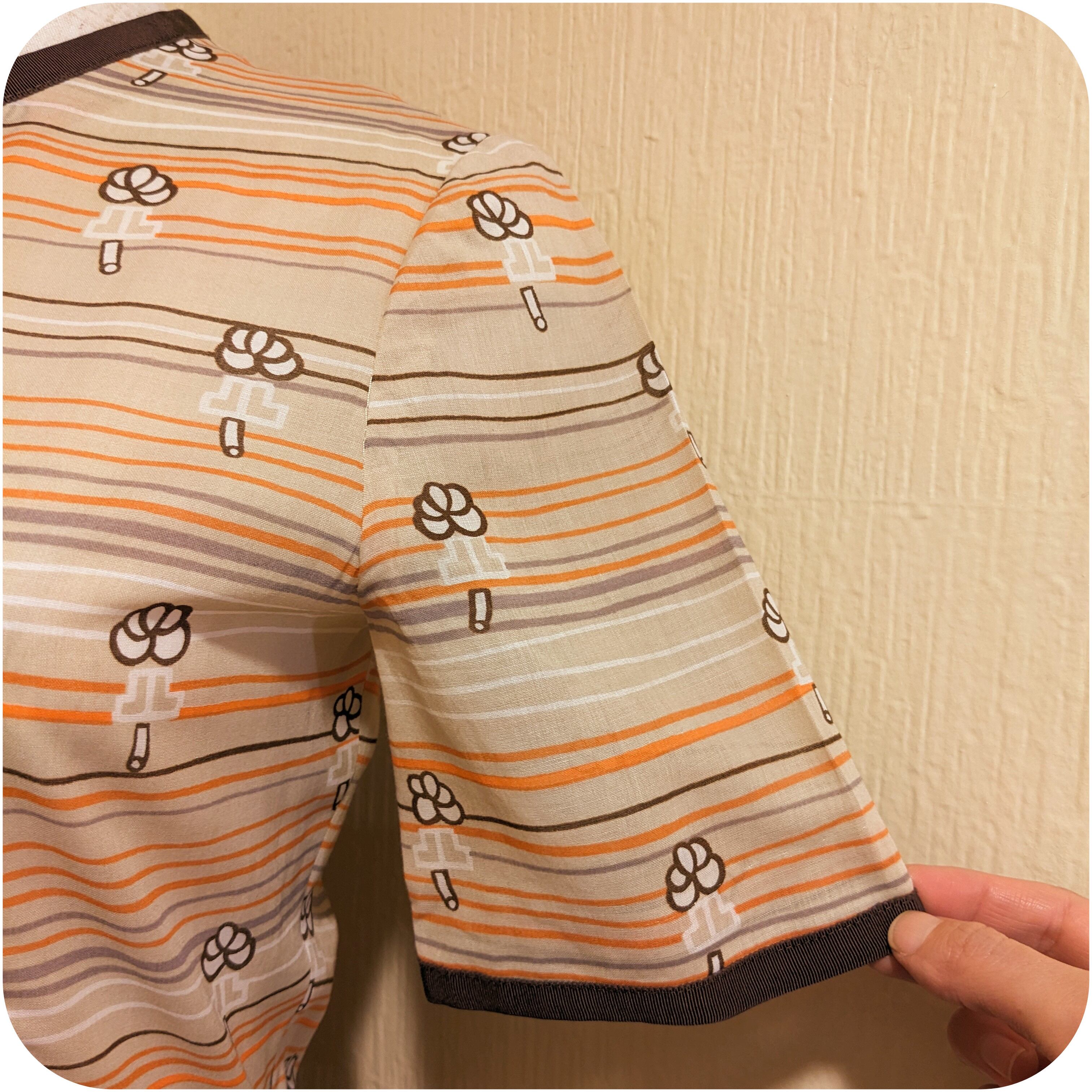 古着ならではのキュートな色合いのパネル柄と、ボディラインにほどよくフィットする美しいシルエットがとっても素敵。