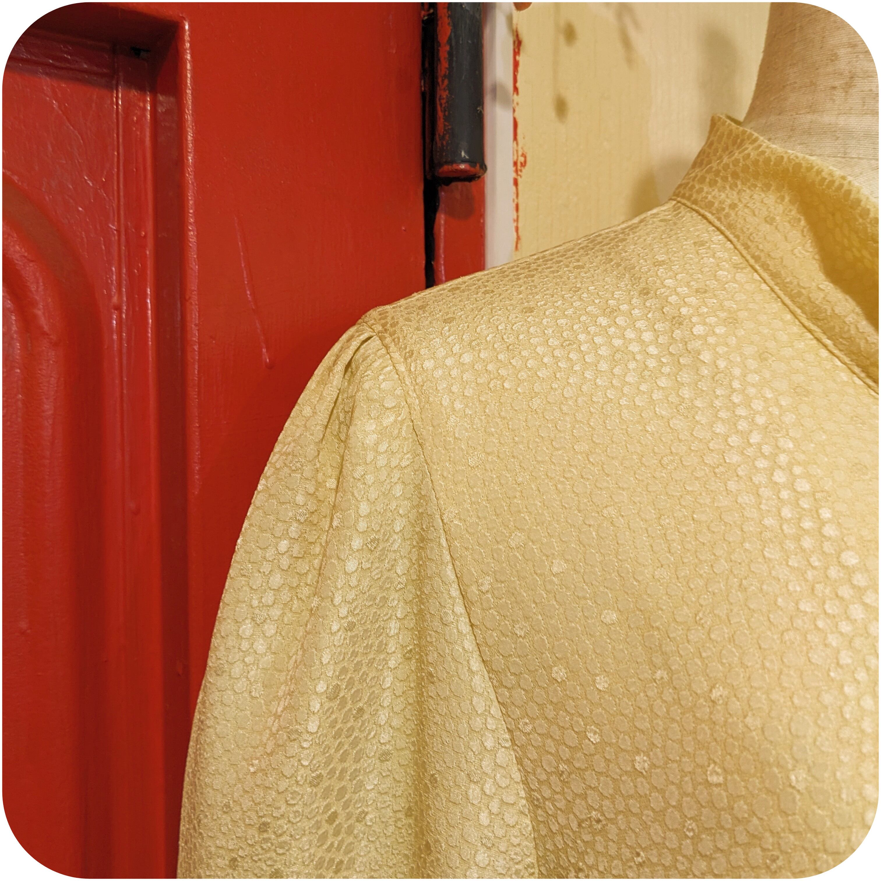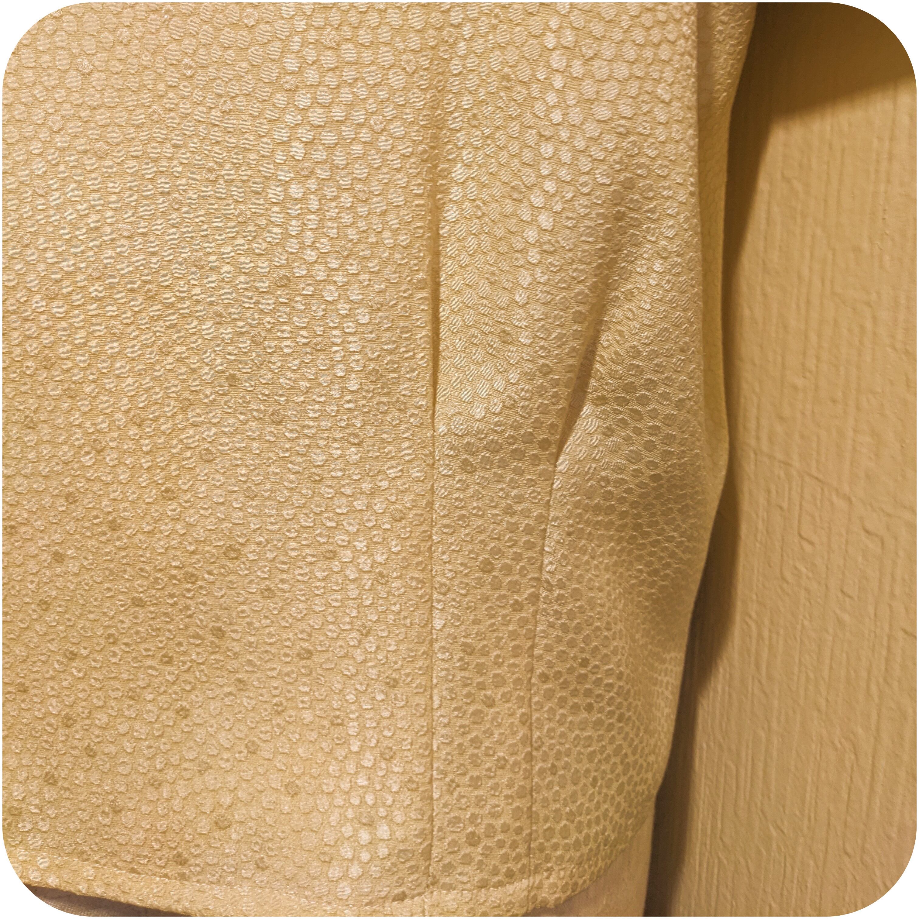 ポコポコとしたサークルモチーフが織り込まれた光沢感のあるユニークなマテリアルと、ウエストがほどよくシェイプされた美しいシルエットがとっても素敵。