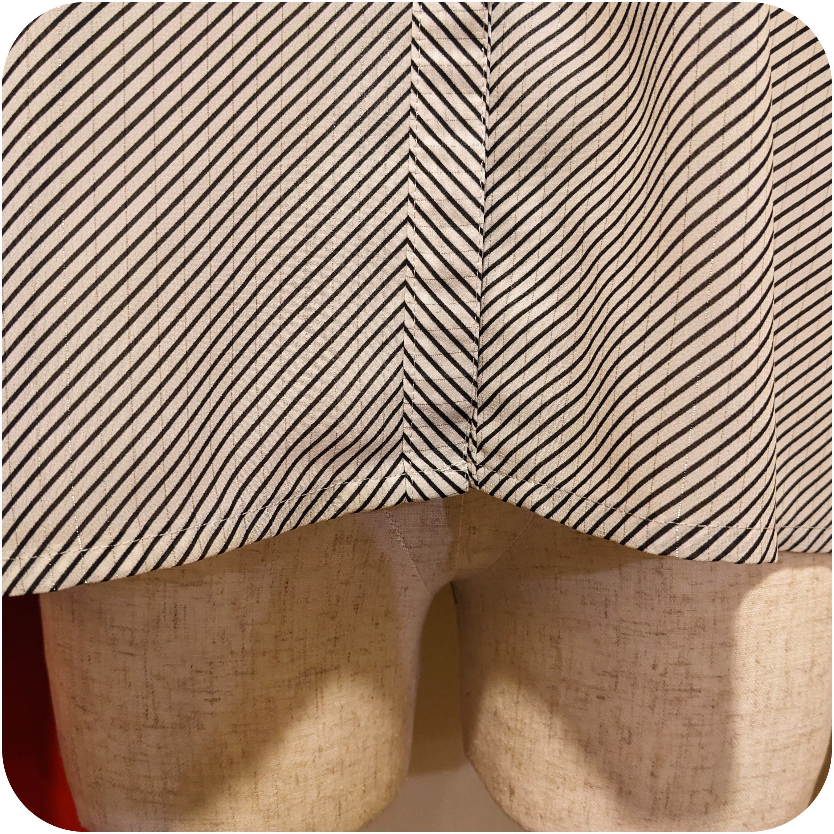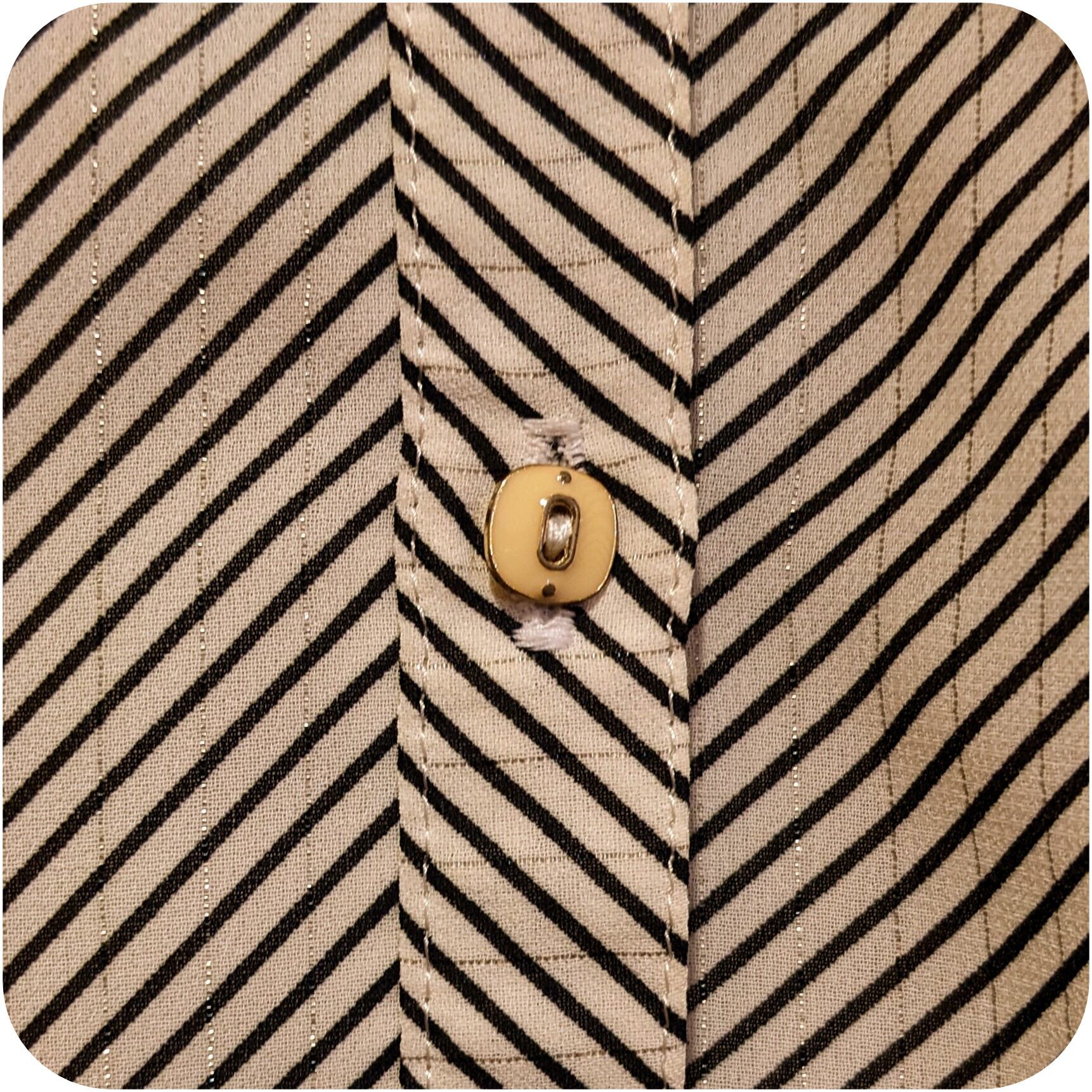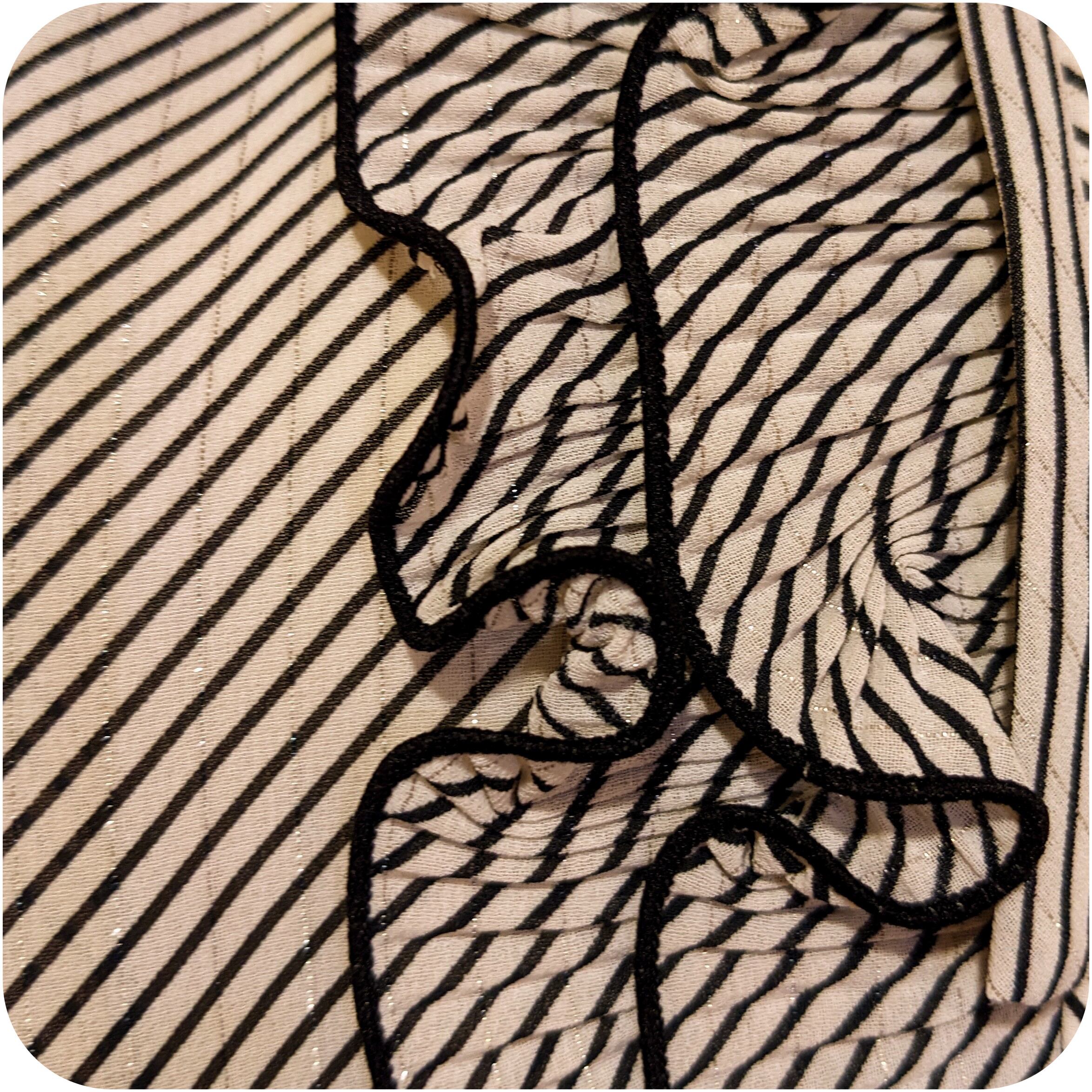エレガントなホワイト×ブラック×シルバーのバイアスストライプ柄フリルブラウス