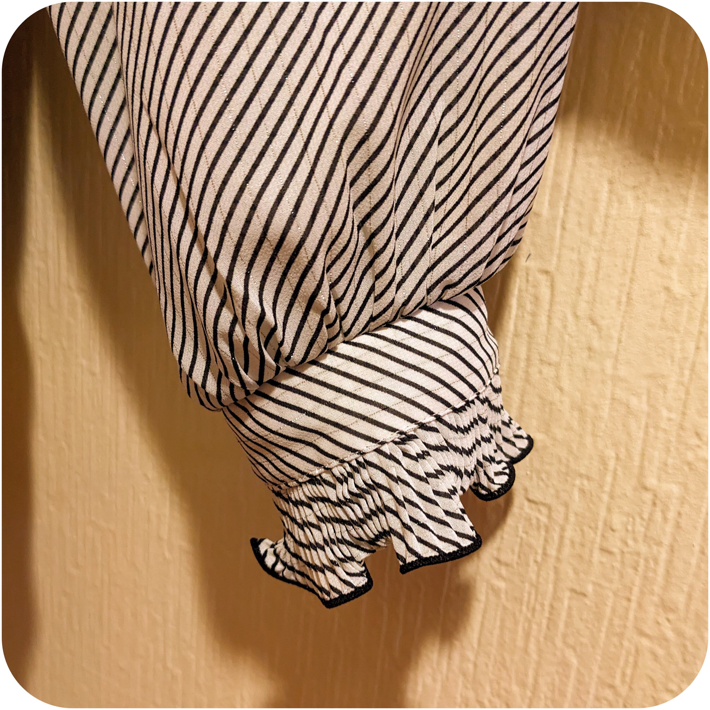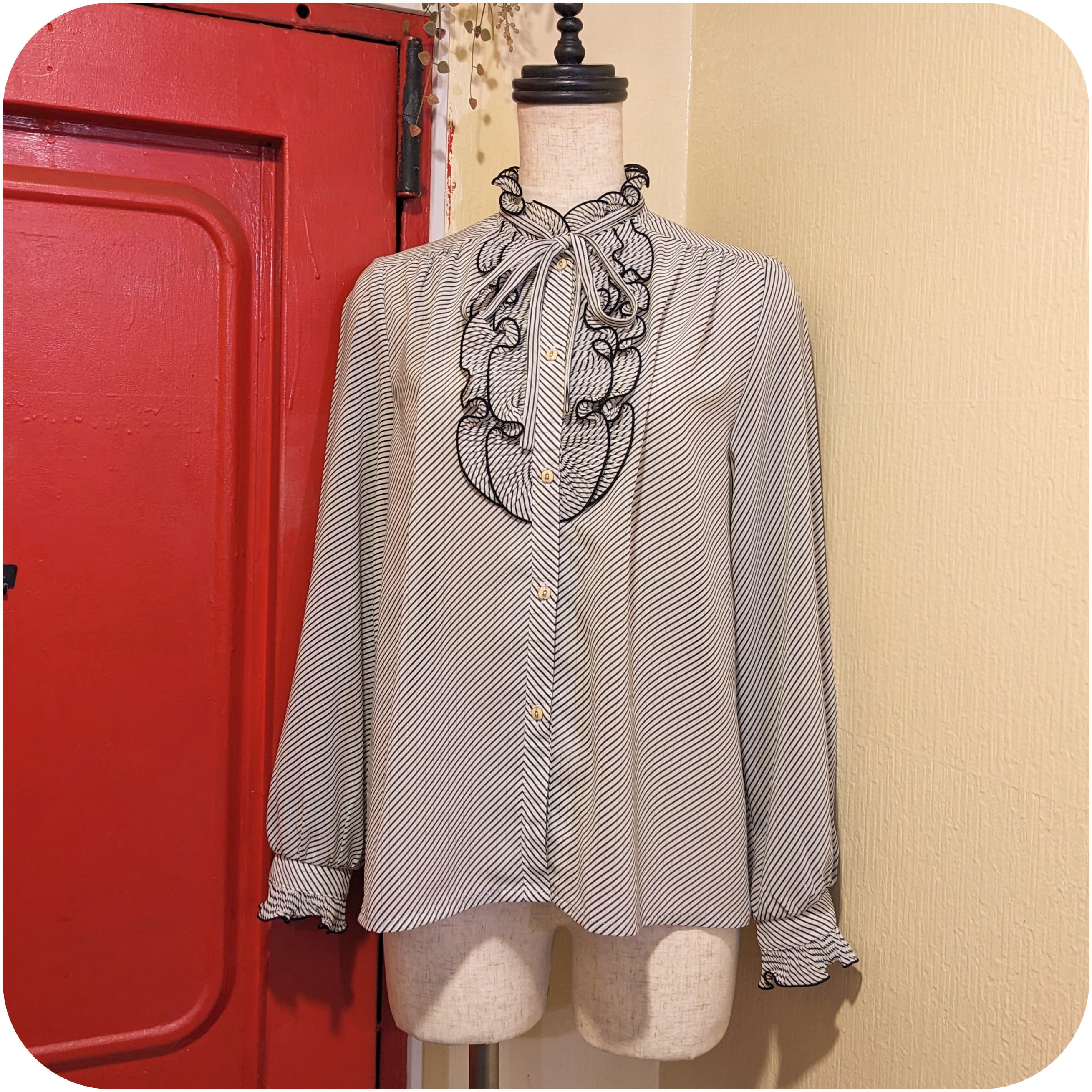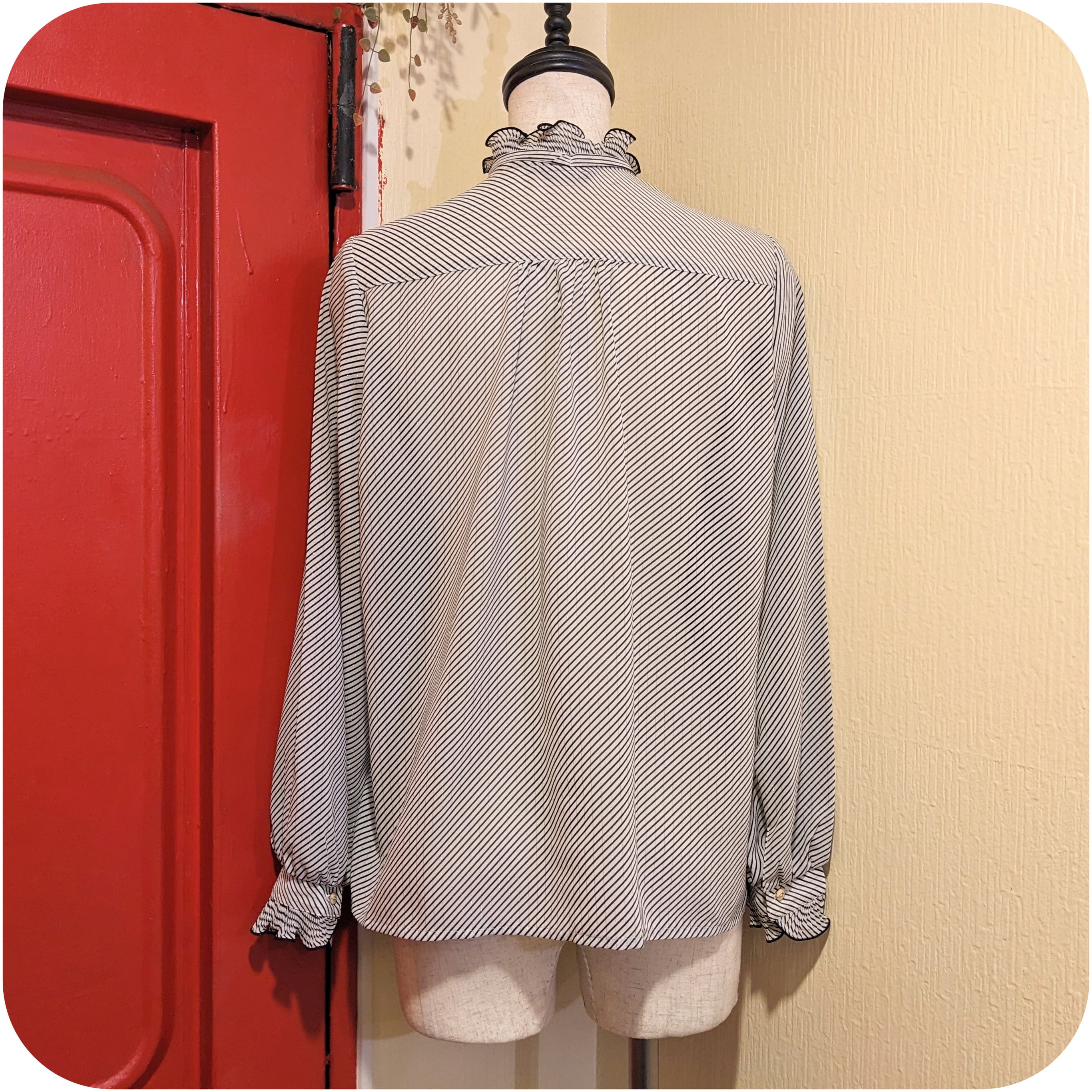 エレガントなホワイト×ブラック×シルバーのバイアスストライプ柄フリルブラウスです。
