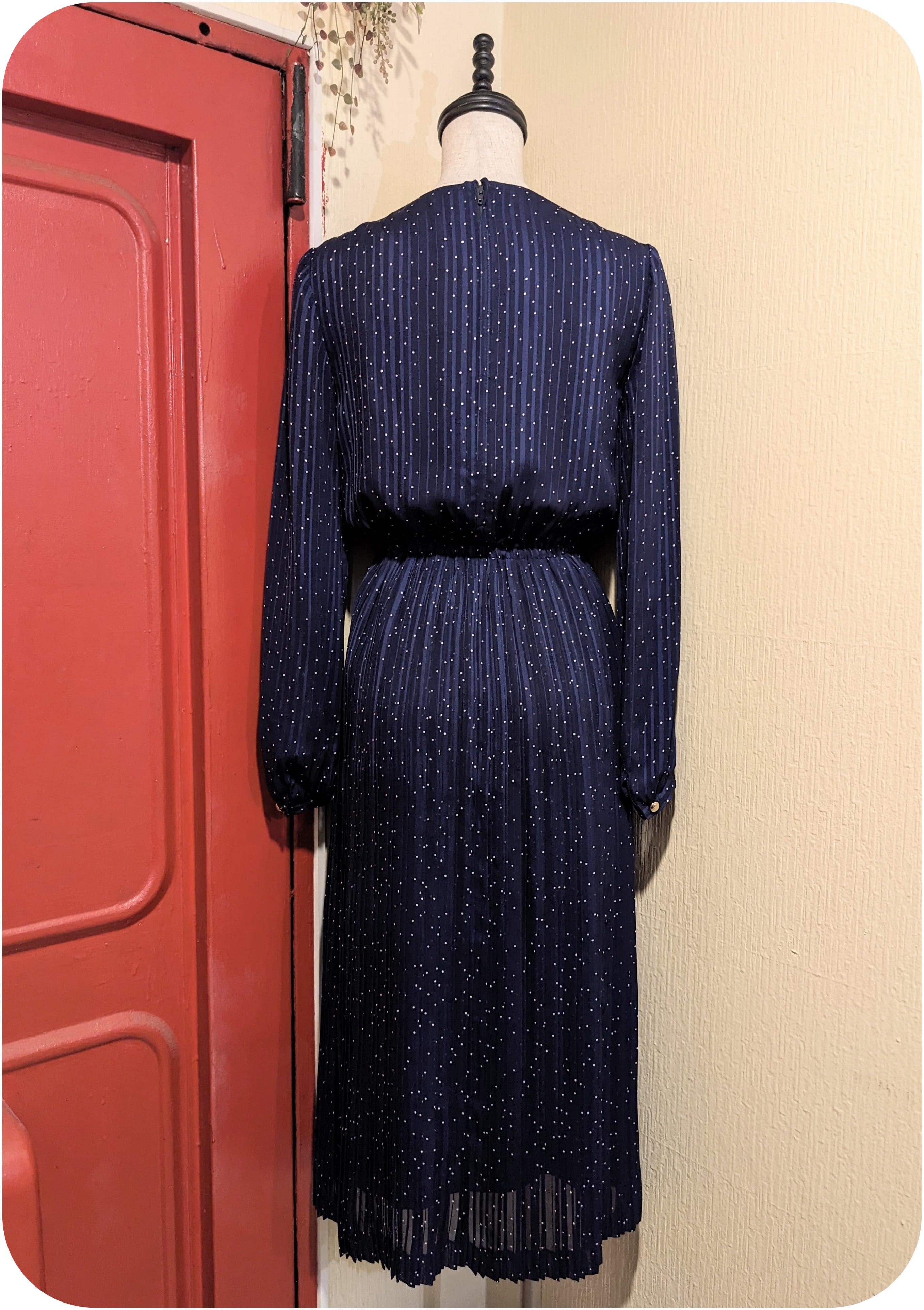 クラシカルなネイビー×ホワイトのドット柄カシュクールワンピースです。