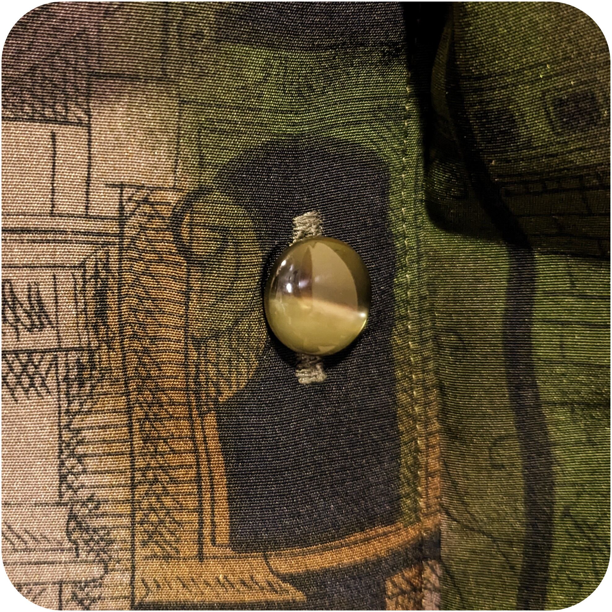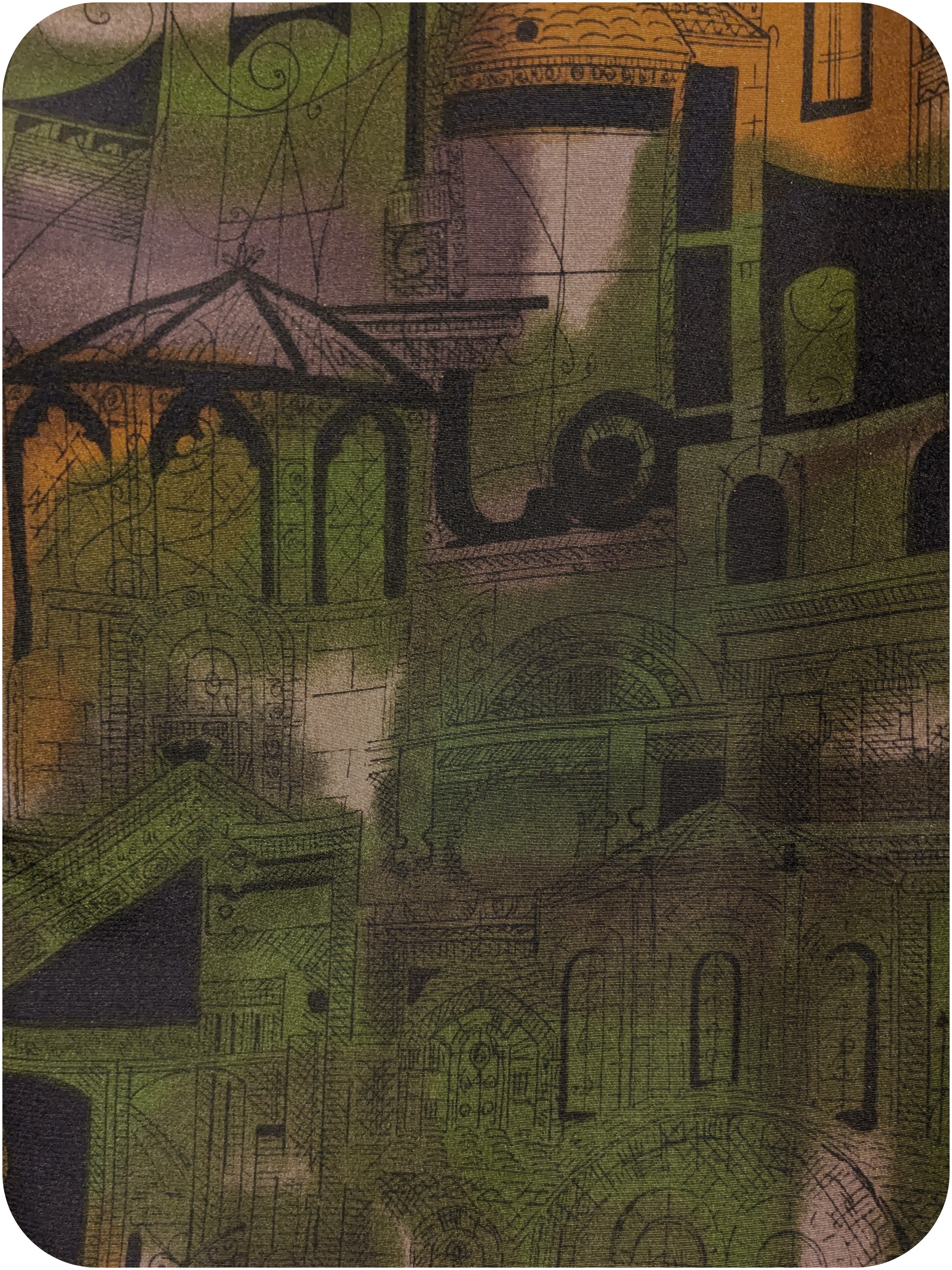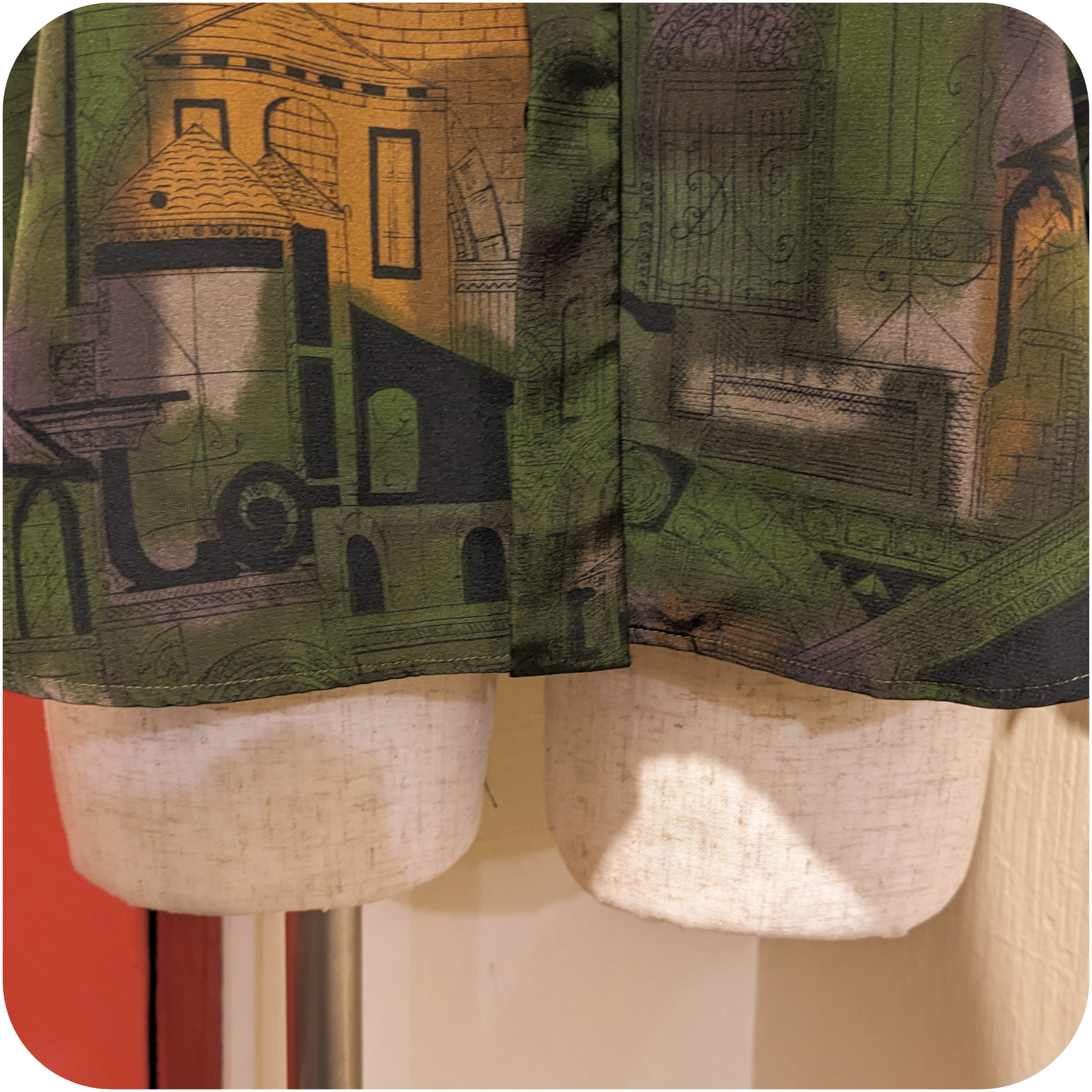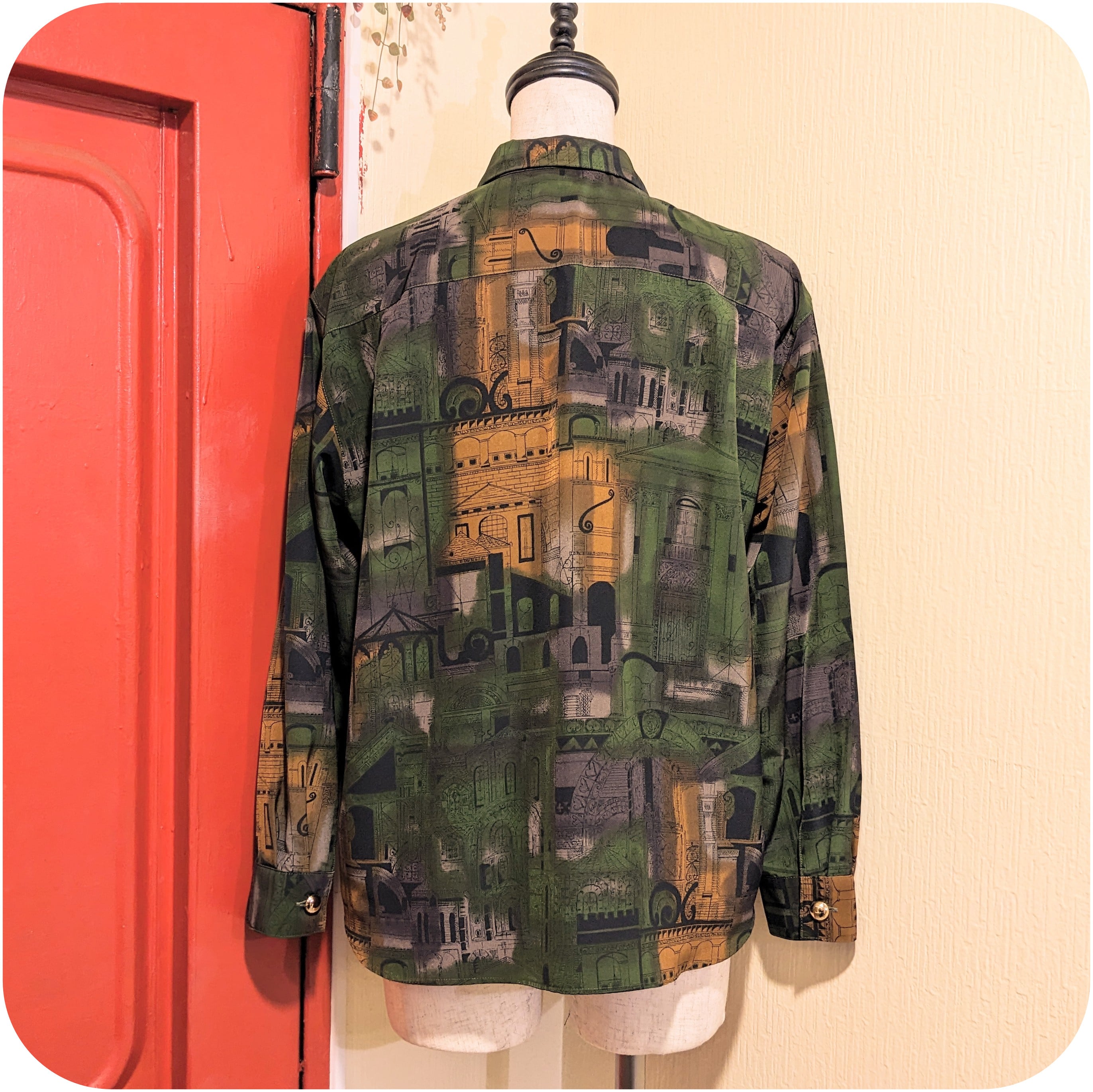 モードなダークグリーン×スモーキーオレンジの街並み柄ブラウス
