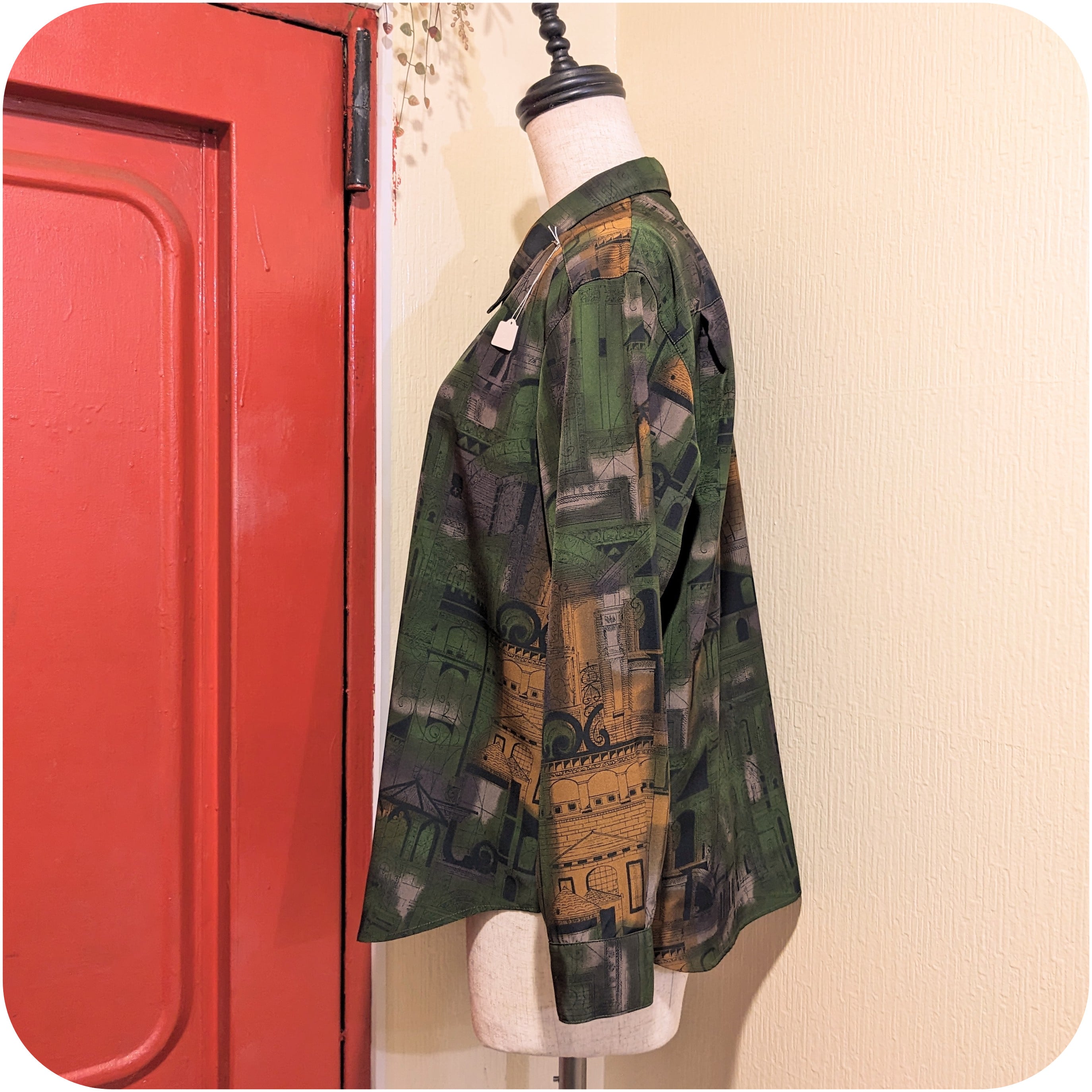 モードなダークグリーン×スモーキーオレンジの街並み柄ブラウスです。