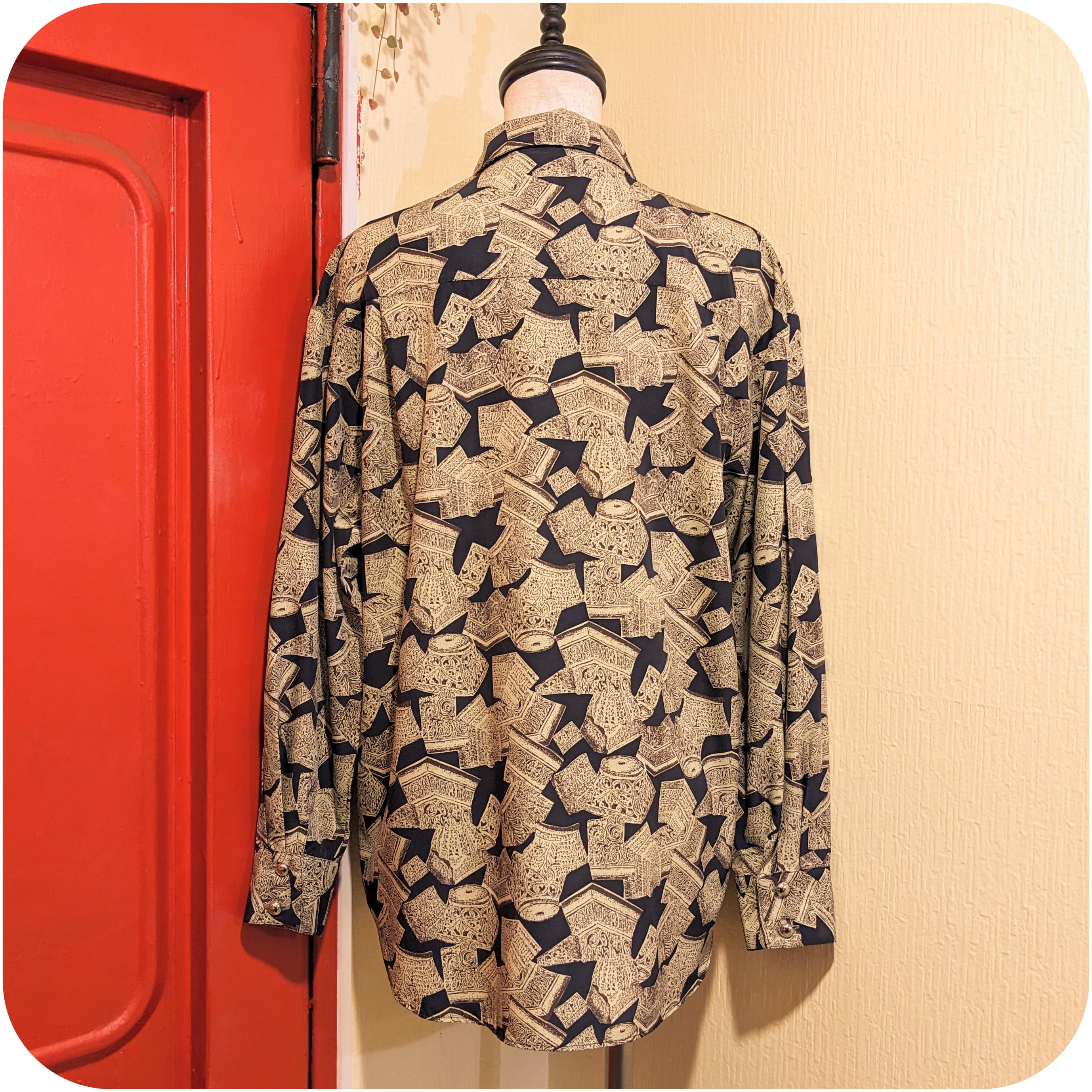 モードなサンドベージュ×ブラックのプランター柄ブラウス
