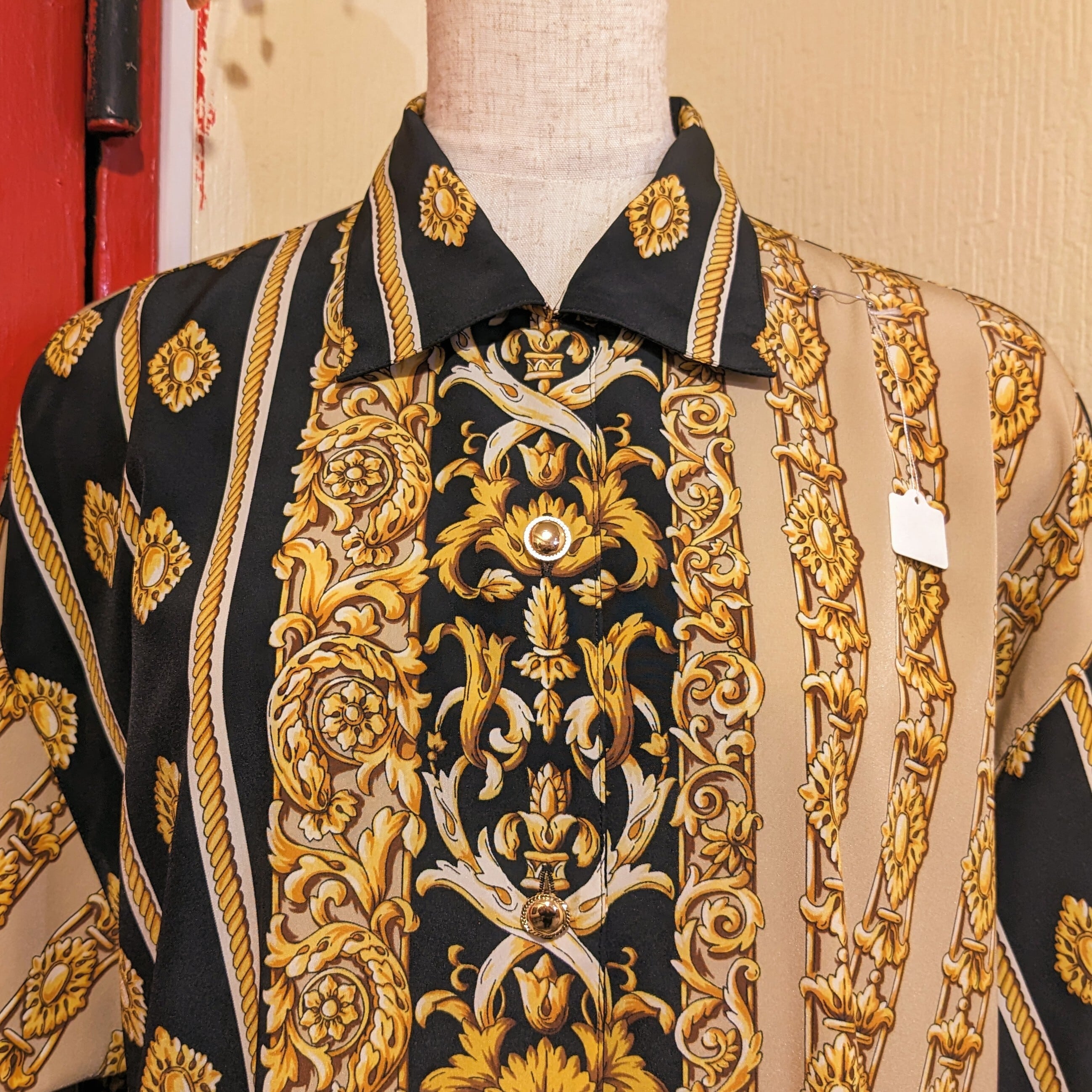 モードなブラック×ベージュ×スモーキーイエローのスカーフ柄ブラウスです。