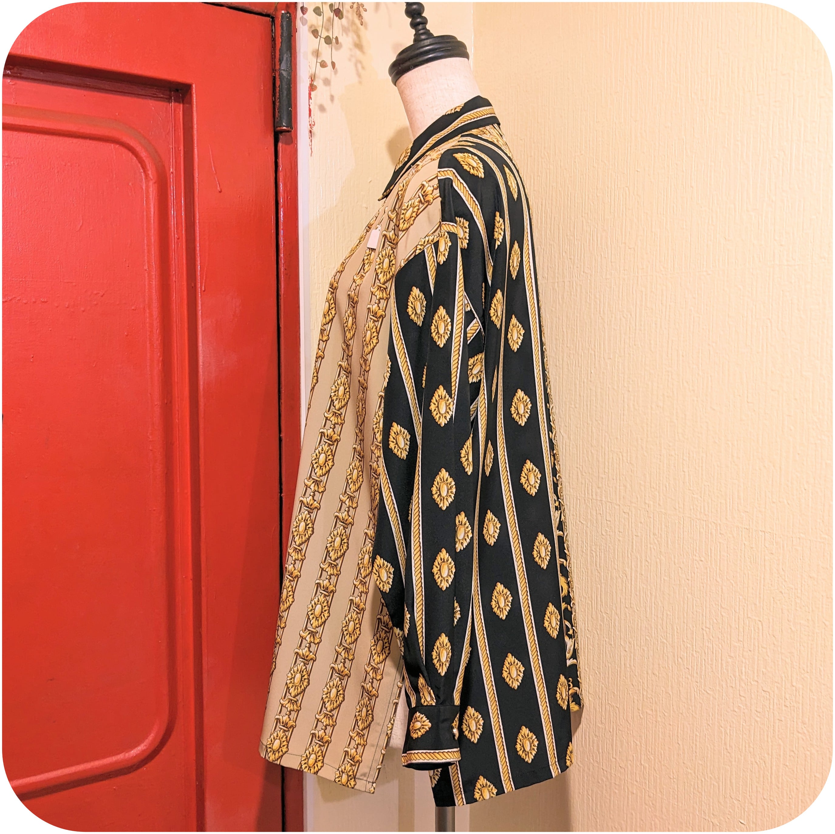 古着ならではのユニークなパネル柄と、肩の落ちたほどよいリラックス感のあるシルエットがとっても素敵。