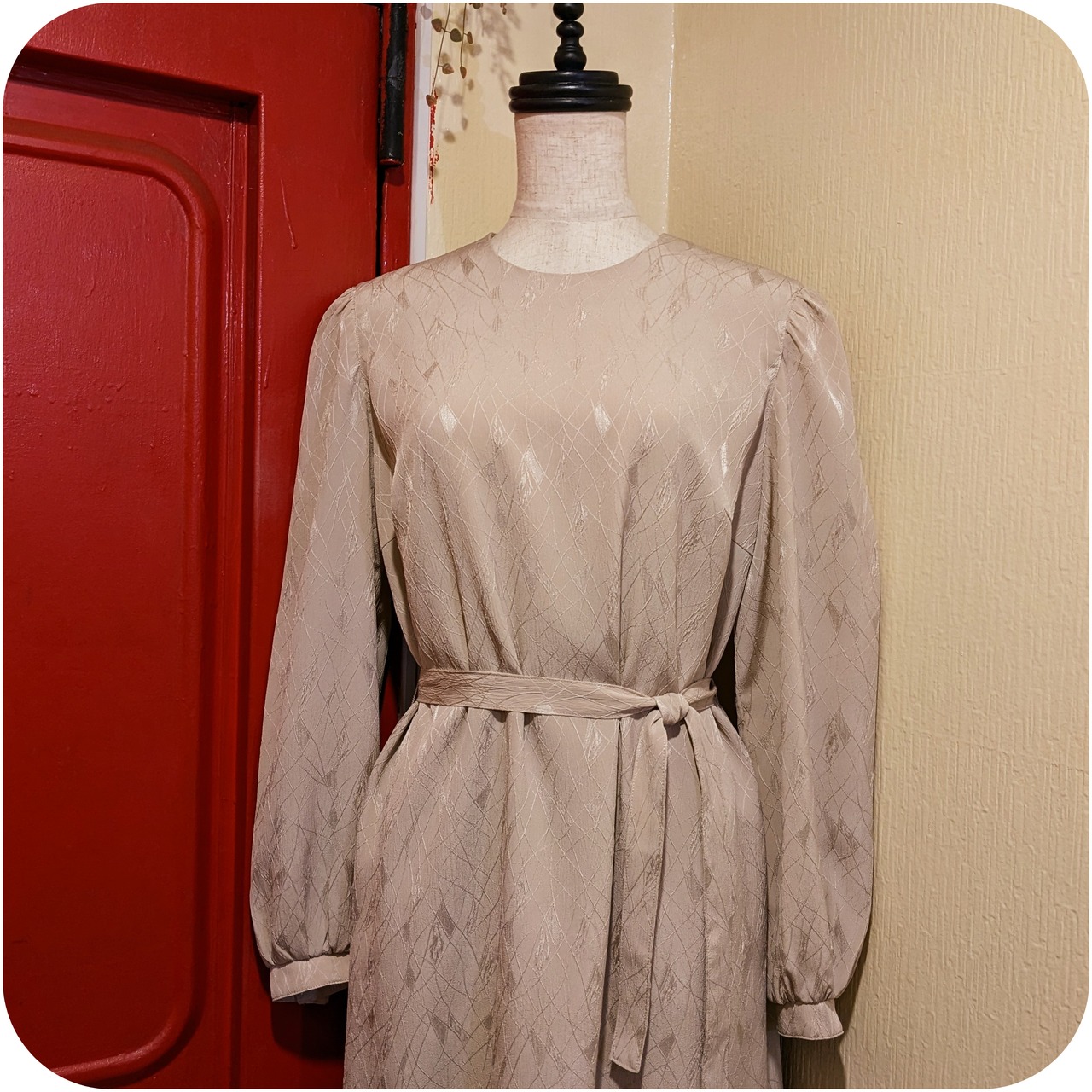 ジオメトリック柄が織り込まれた滑らかな光沢感のあるマテリアルと、ふんわりとしながらもスカートが広がりすぎない大人っぽいシルエットがとっても素敵。