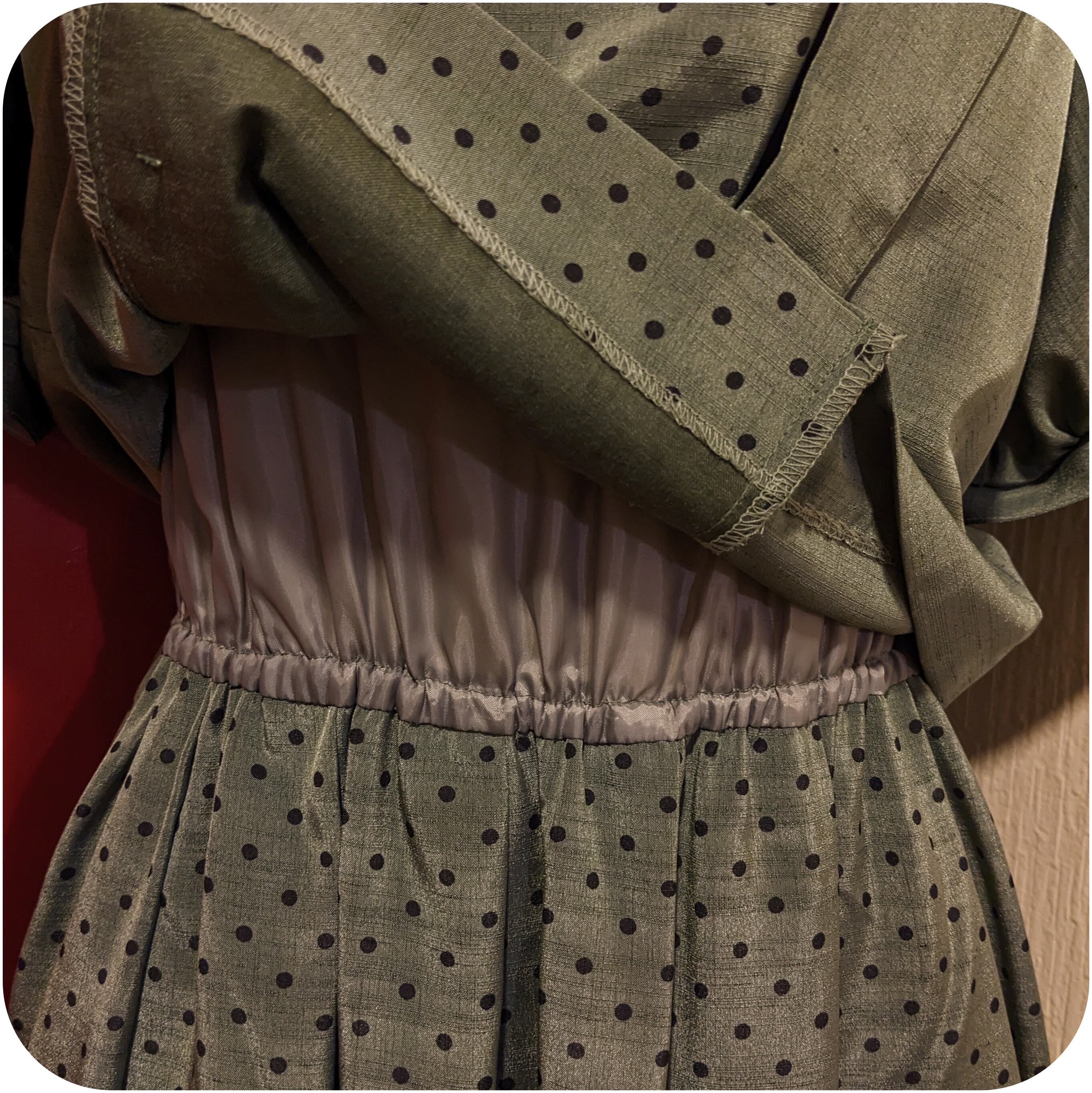 モードなカーキ×ブラックのドット柄ツーピース風ワンピースです。