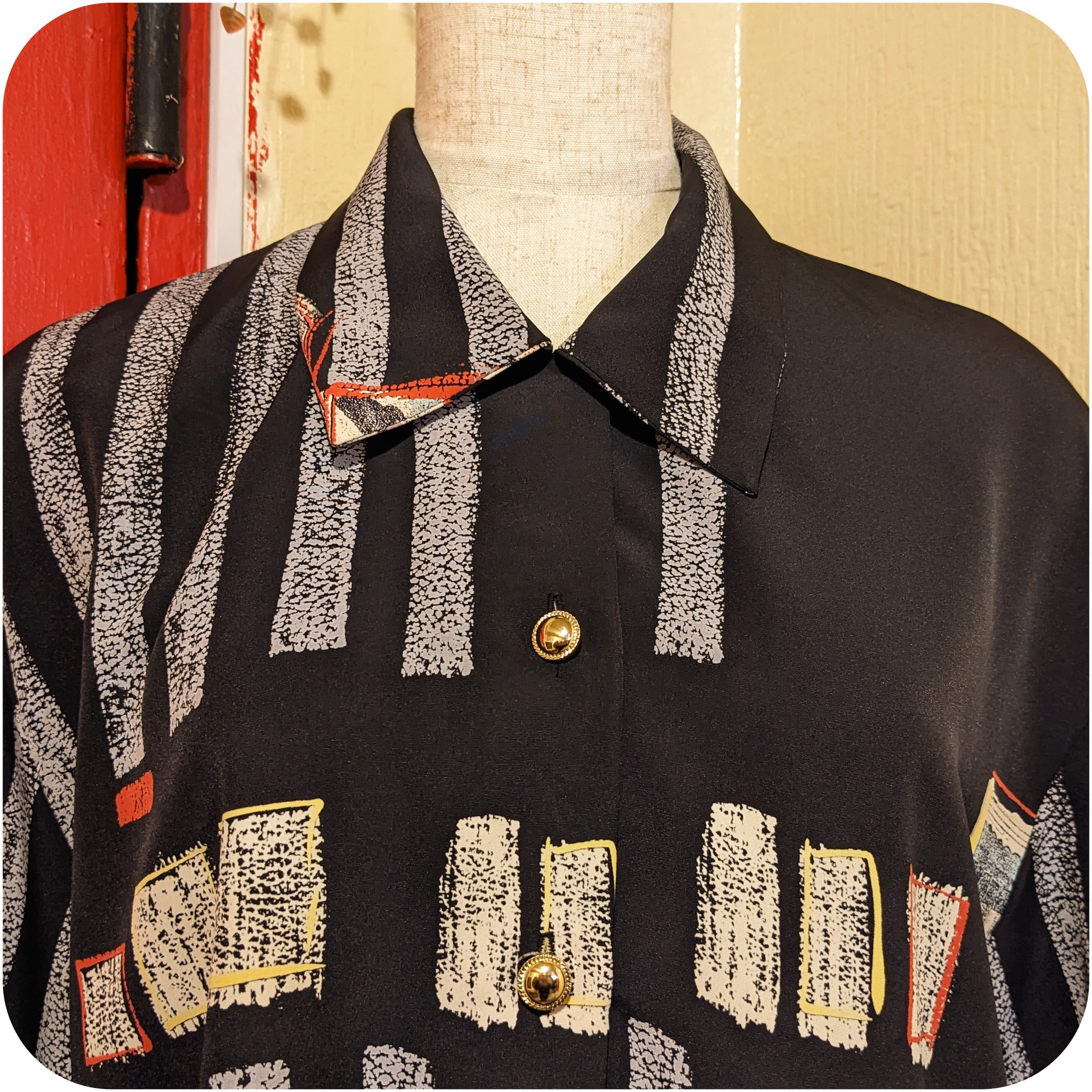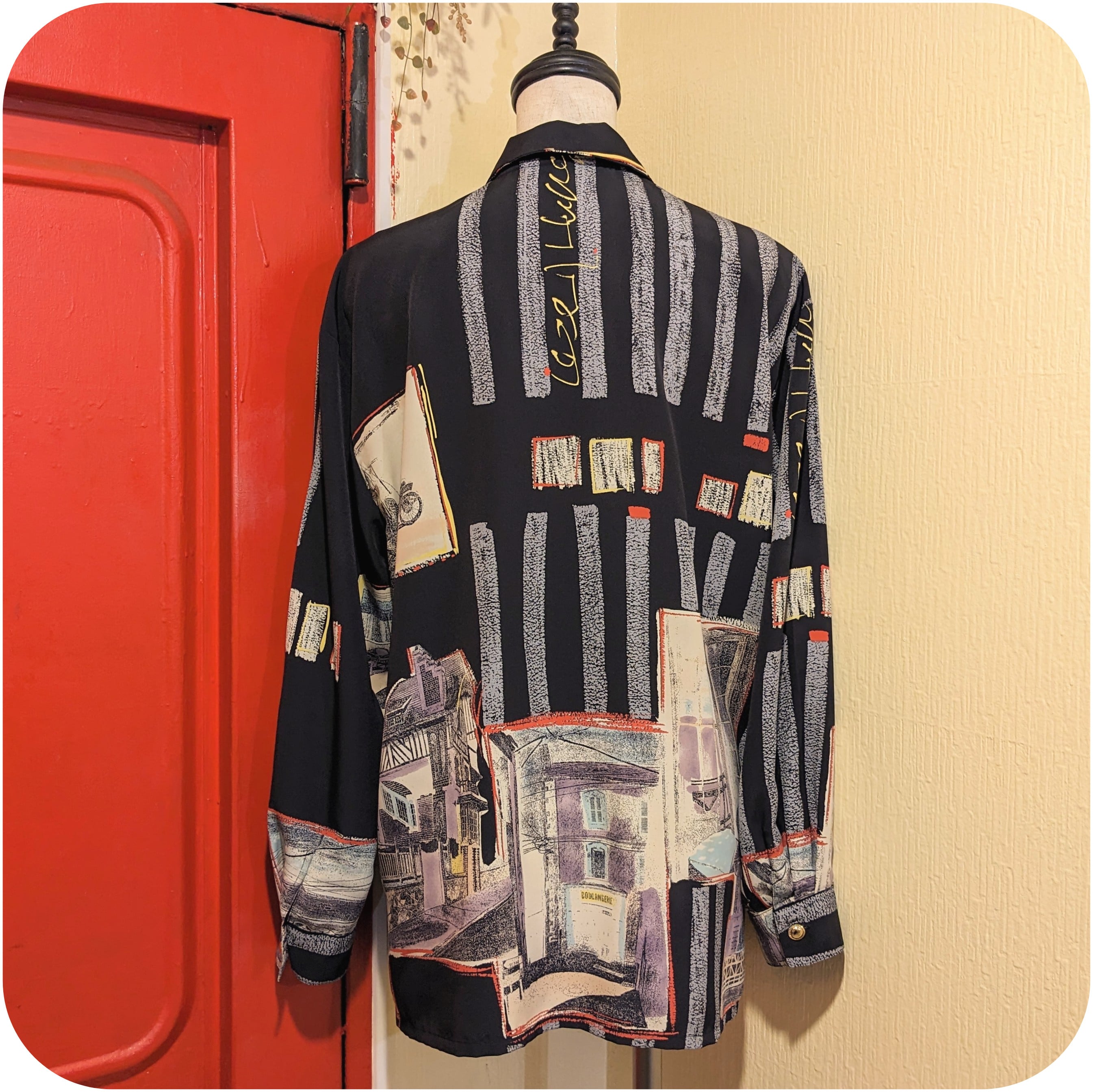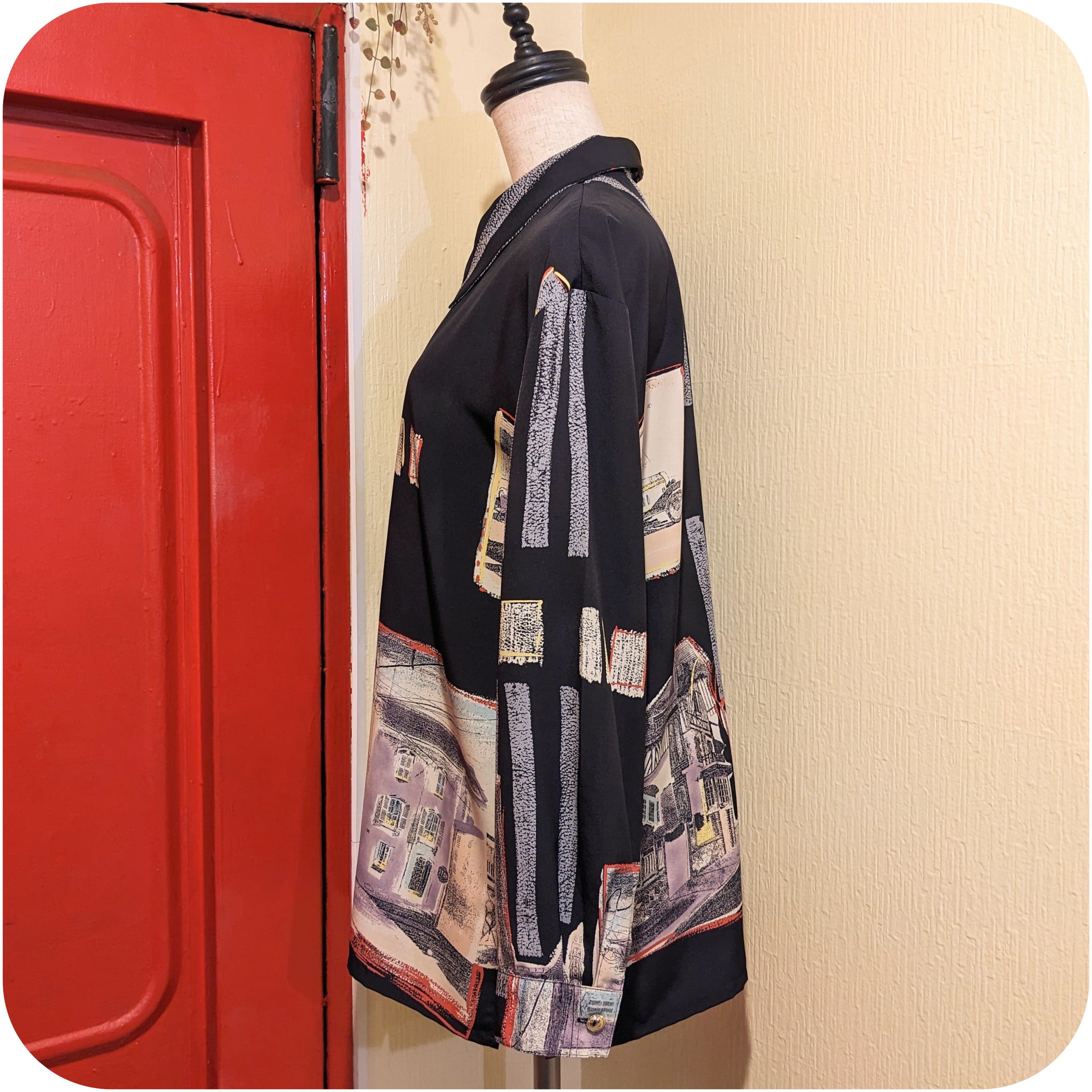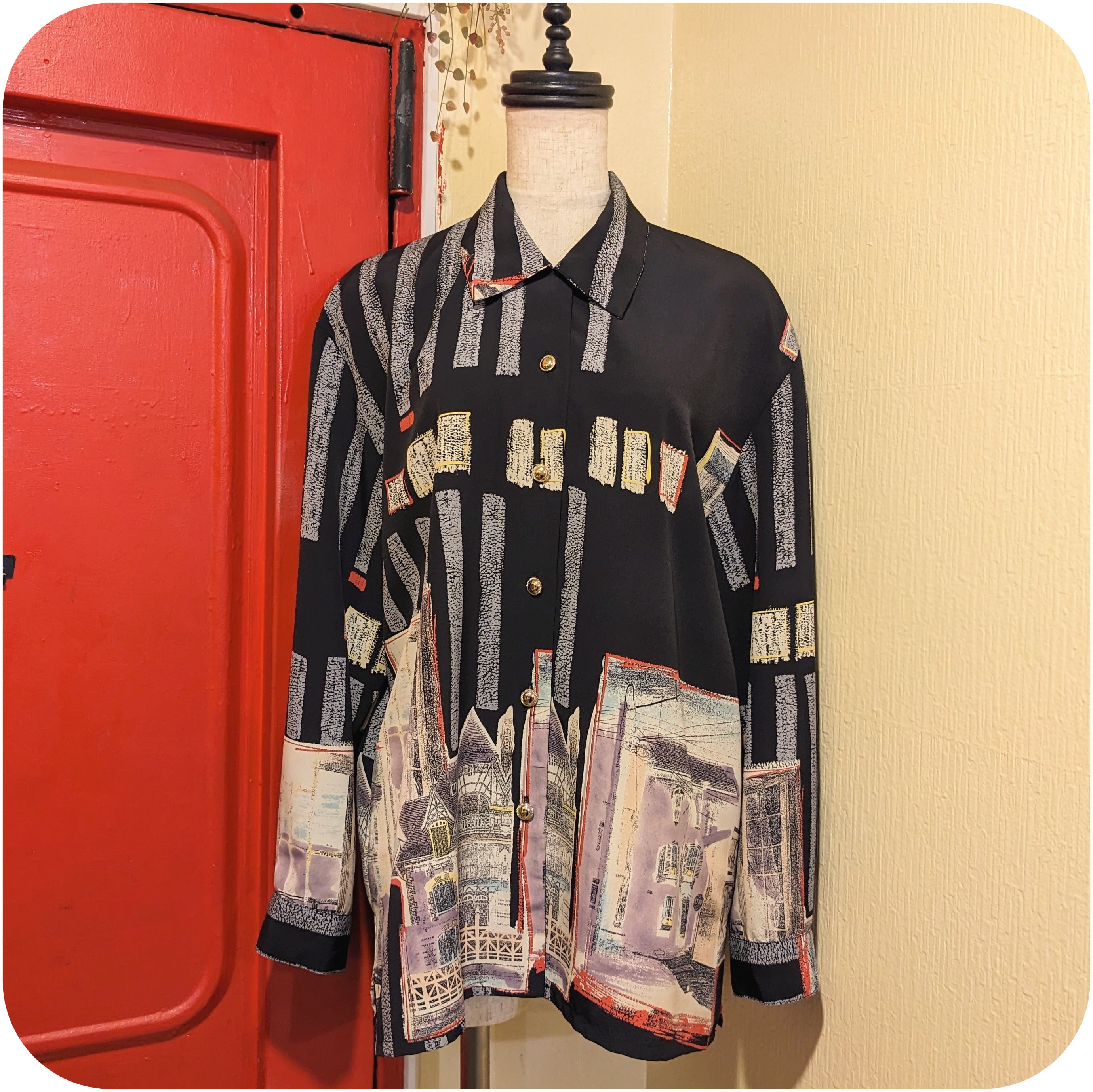 モードなブラック×ラベンダー×ライトグレーの風景柄ブラウス