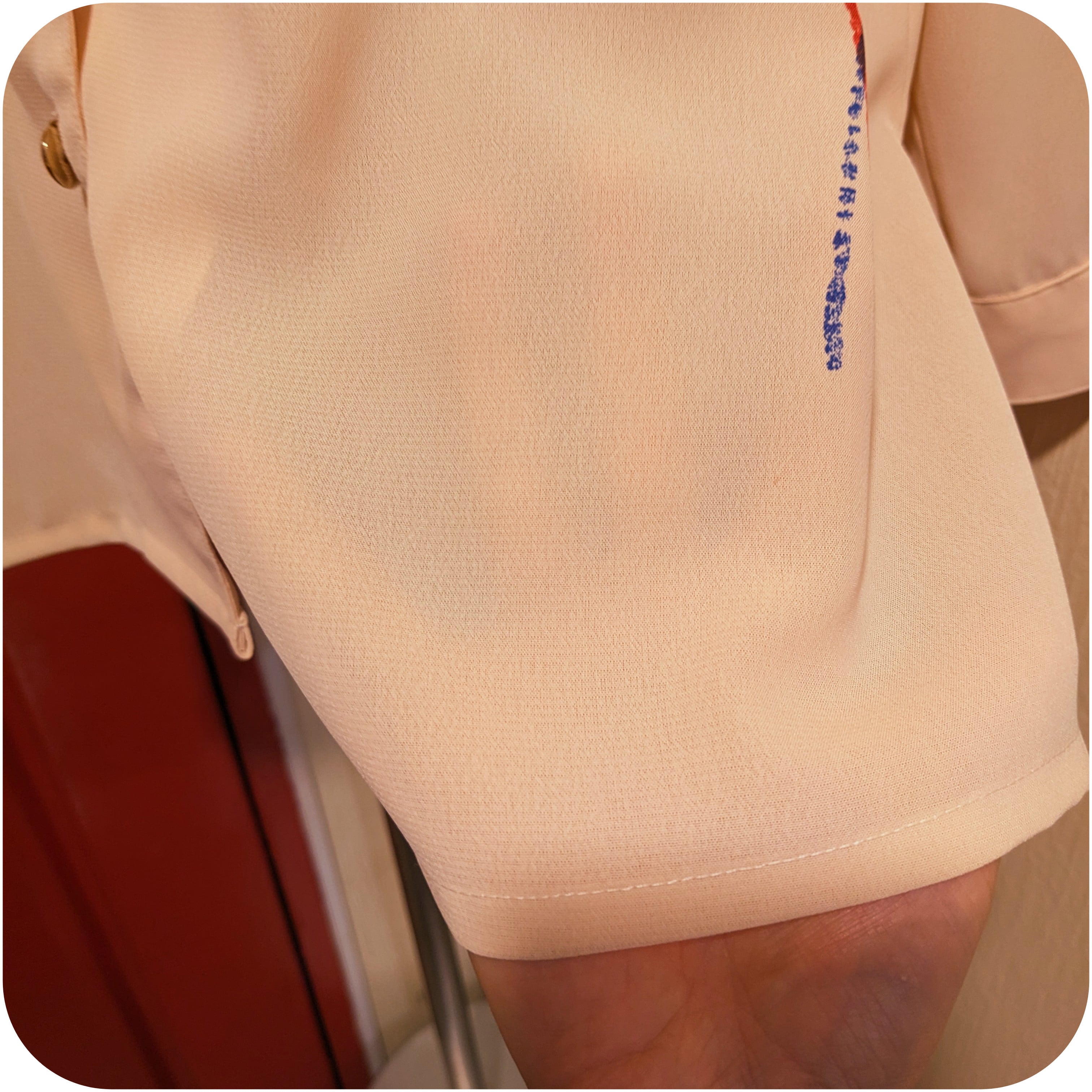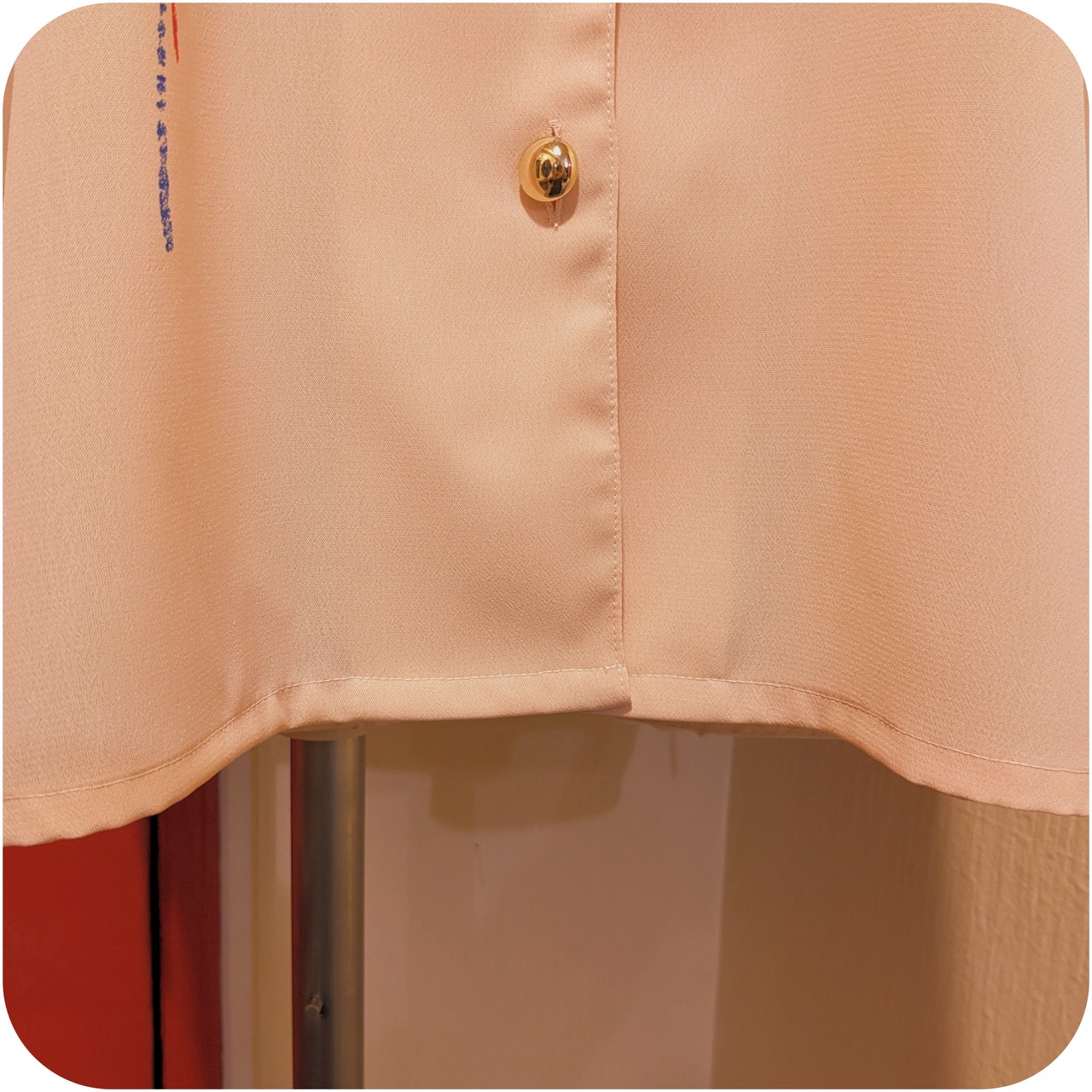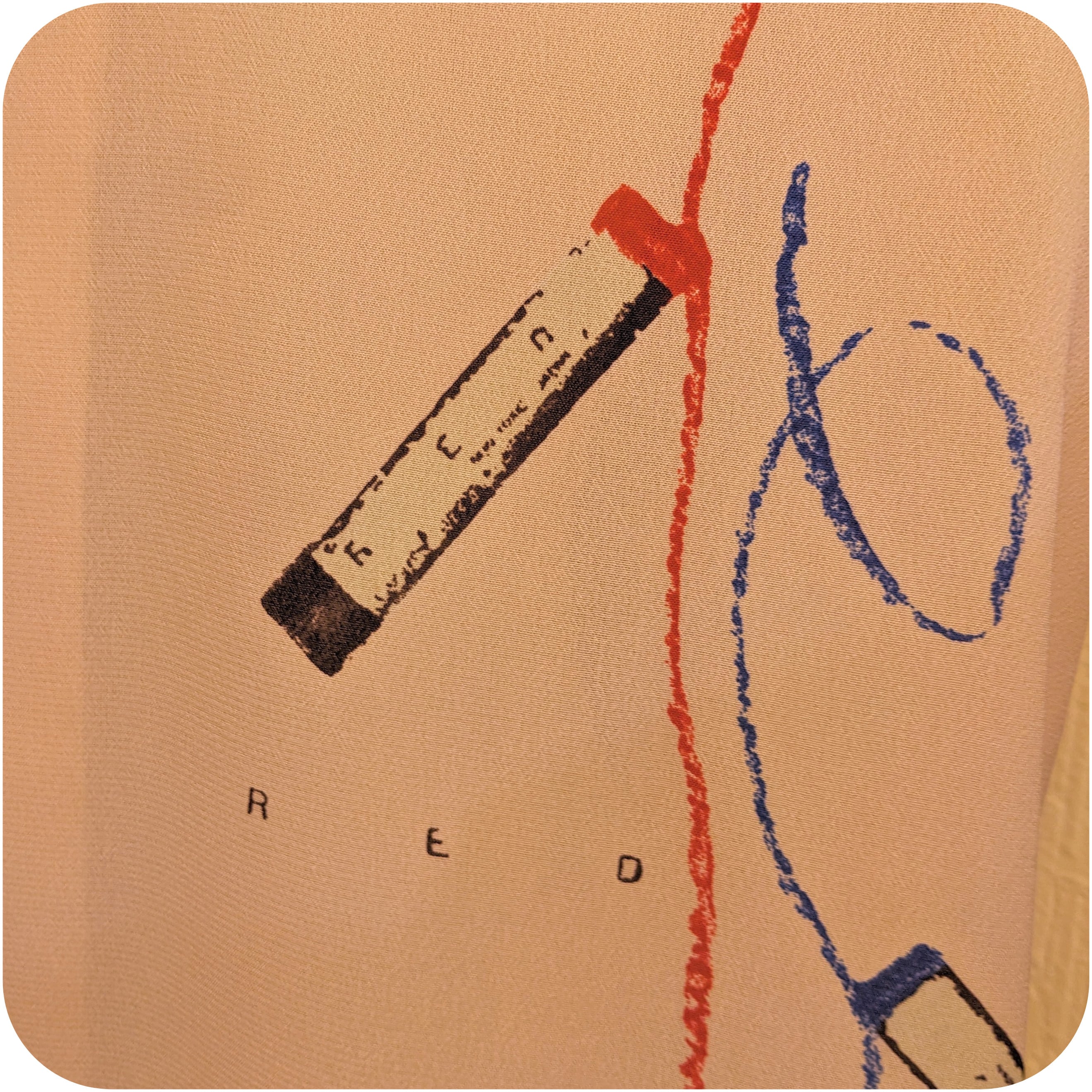 モードなシェルピンク×レッド×ブラウンのクレヨン柄ブラウス
