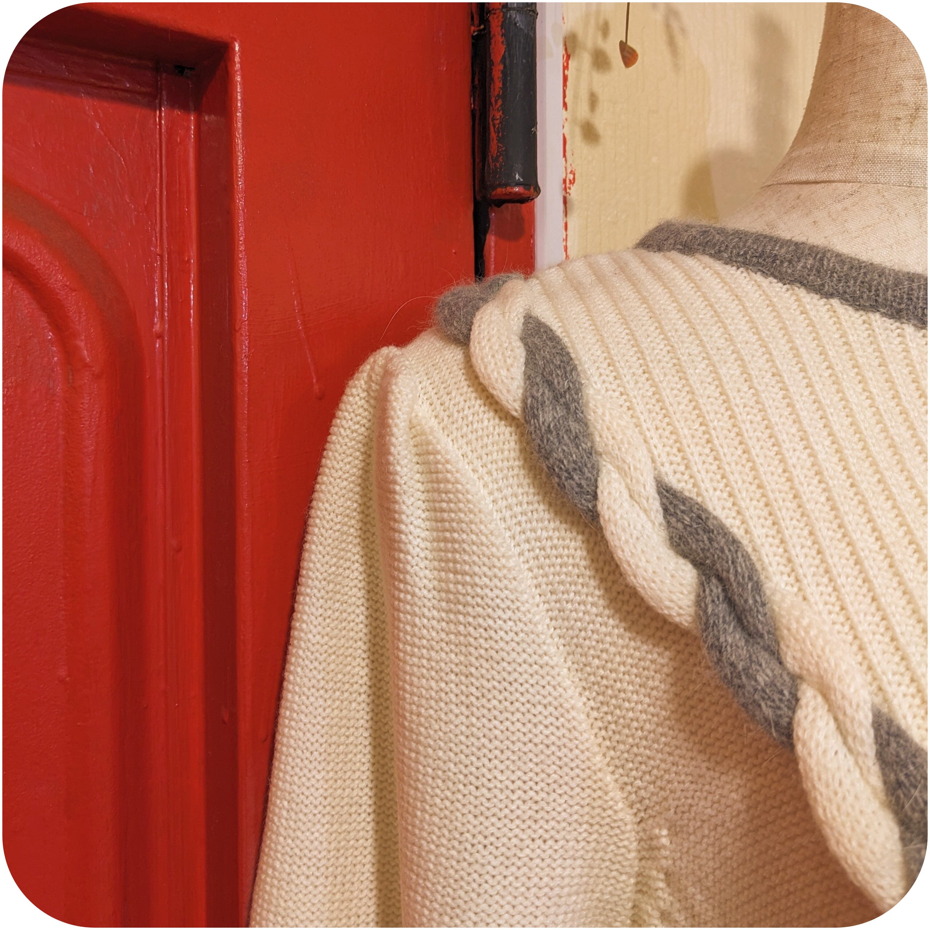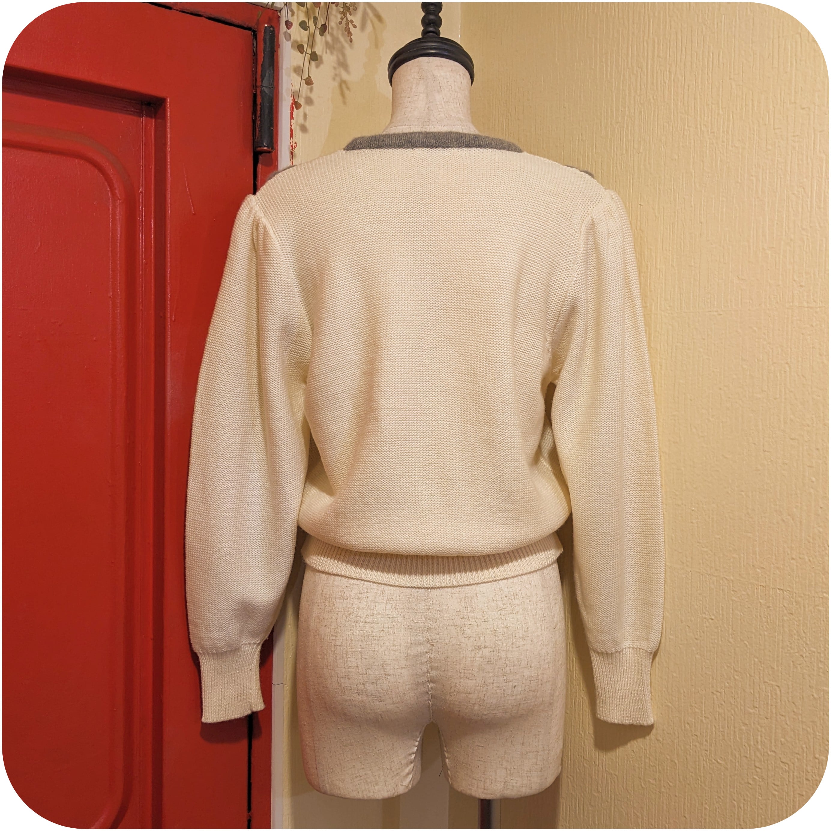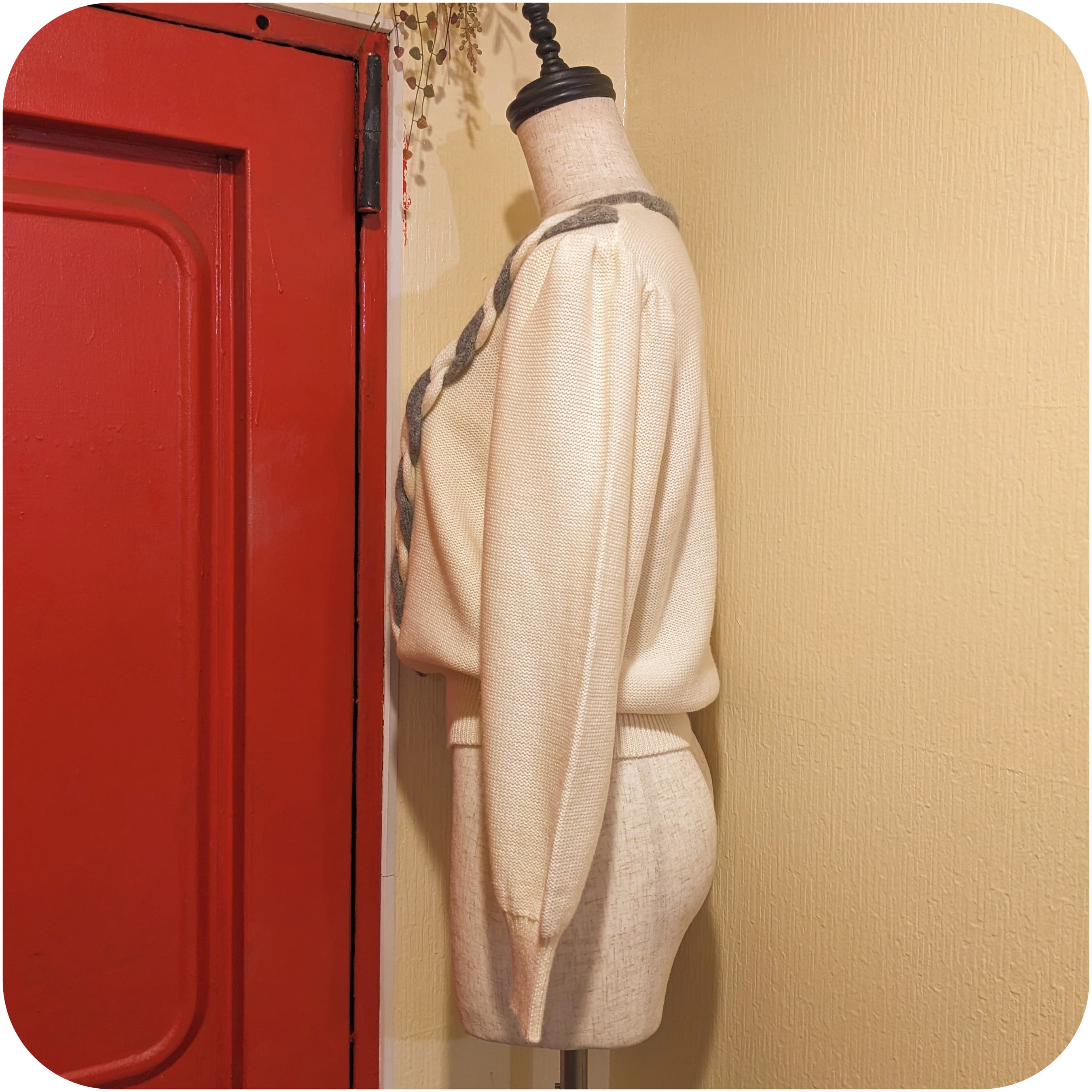 エレガントなオフホワイト×ライトグレーのフロントデザインニット