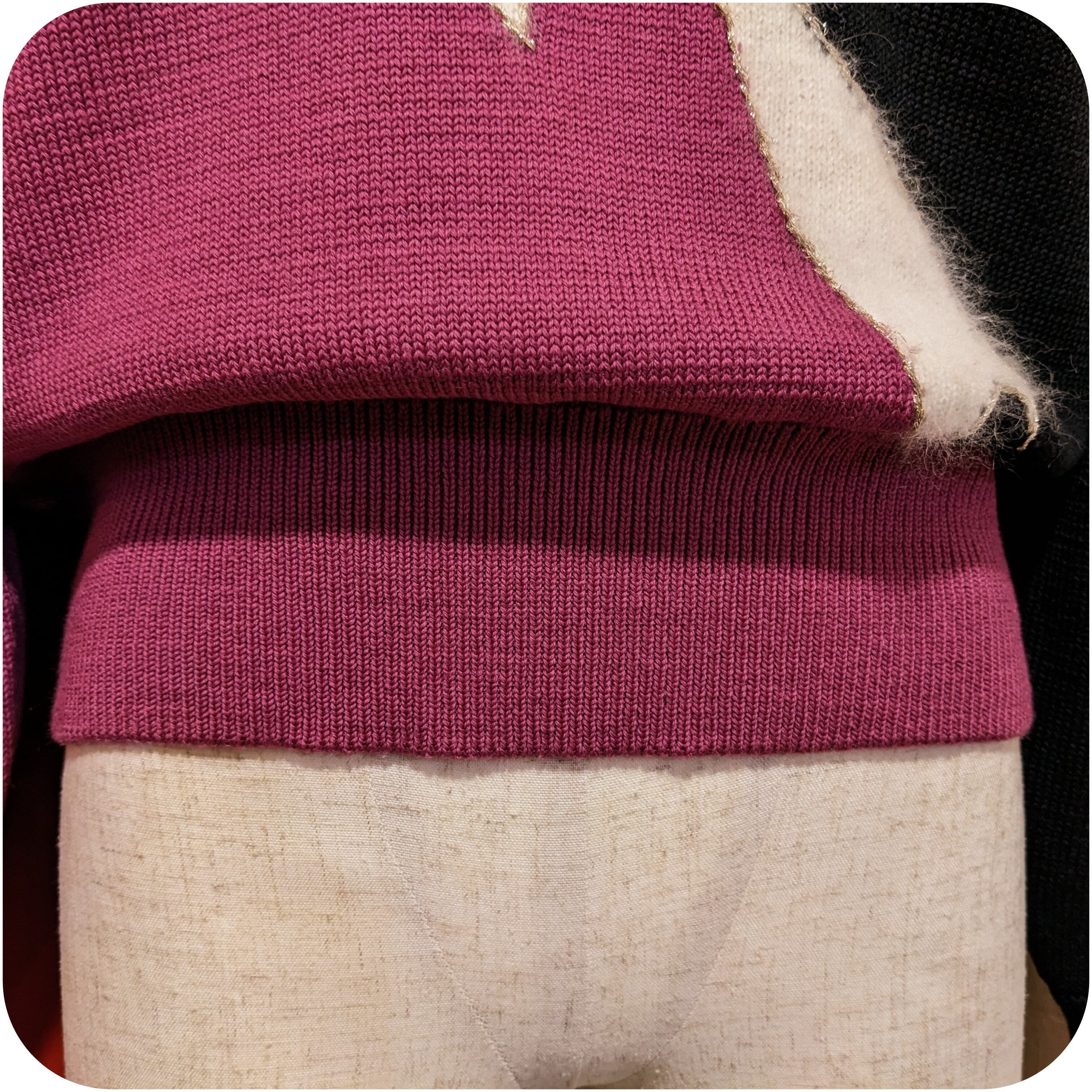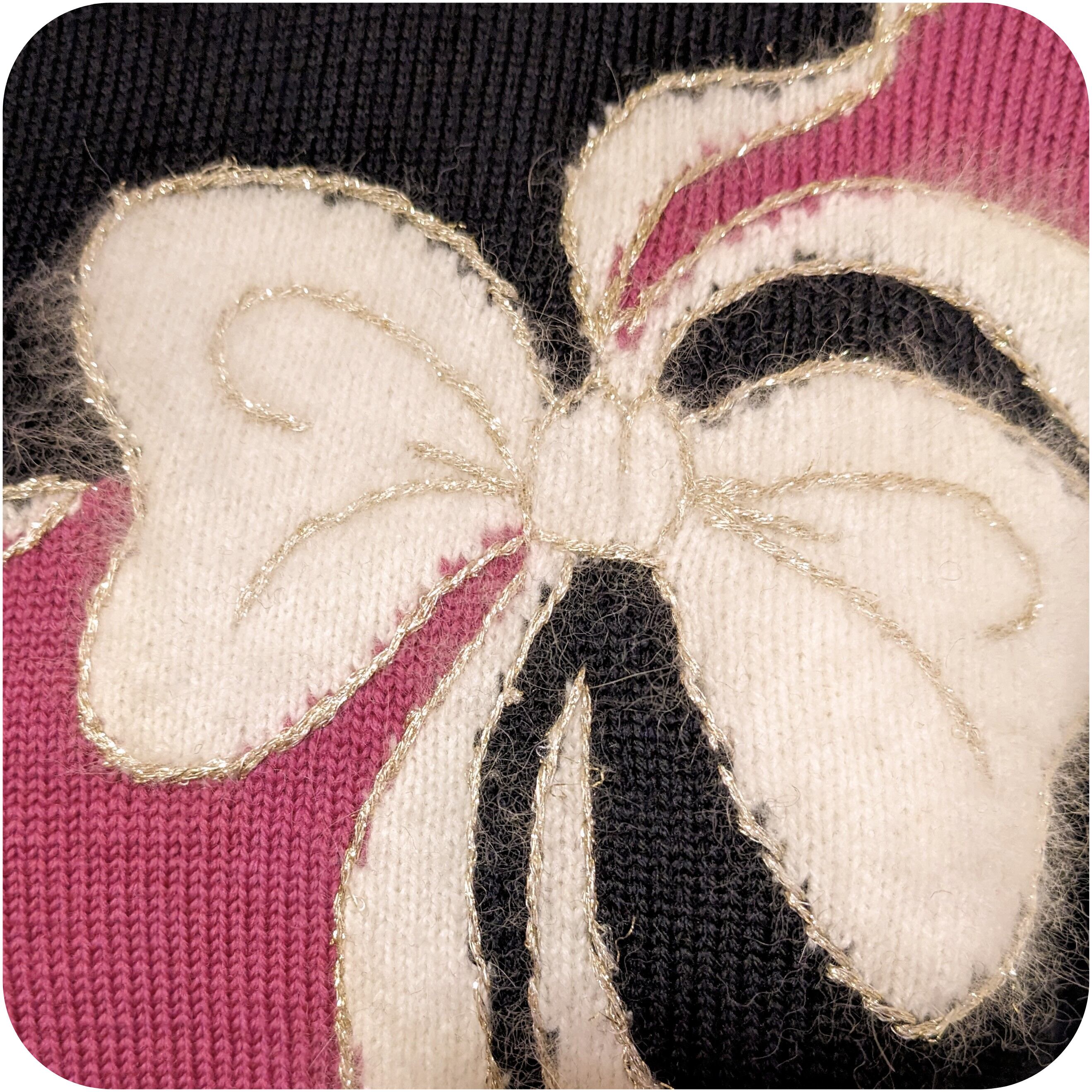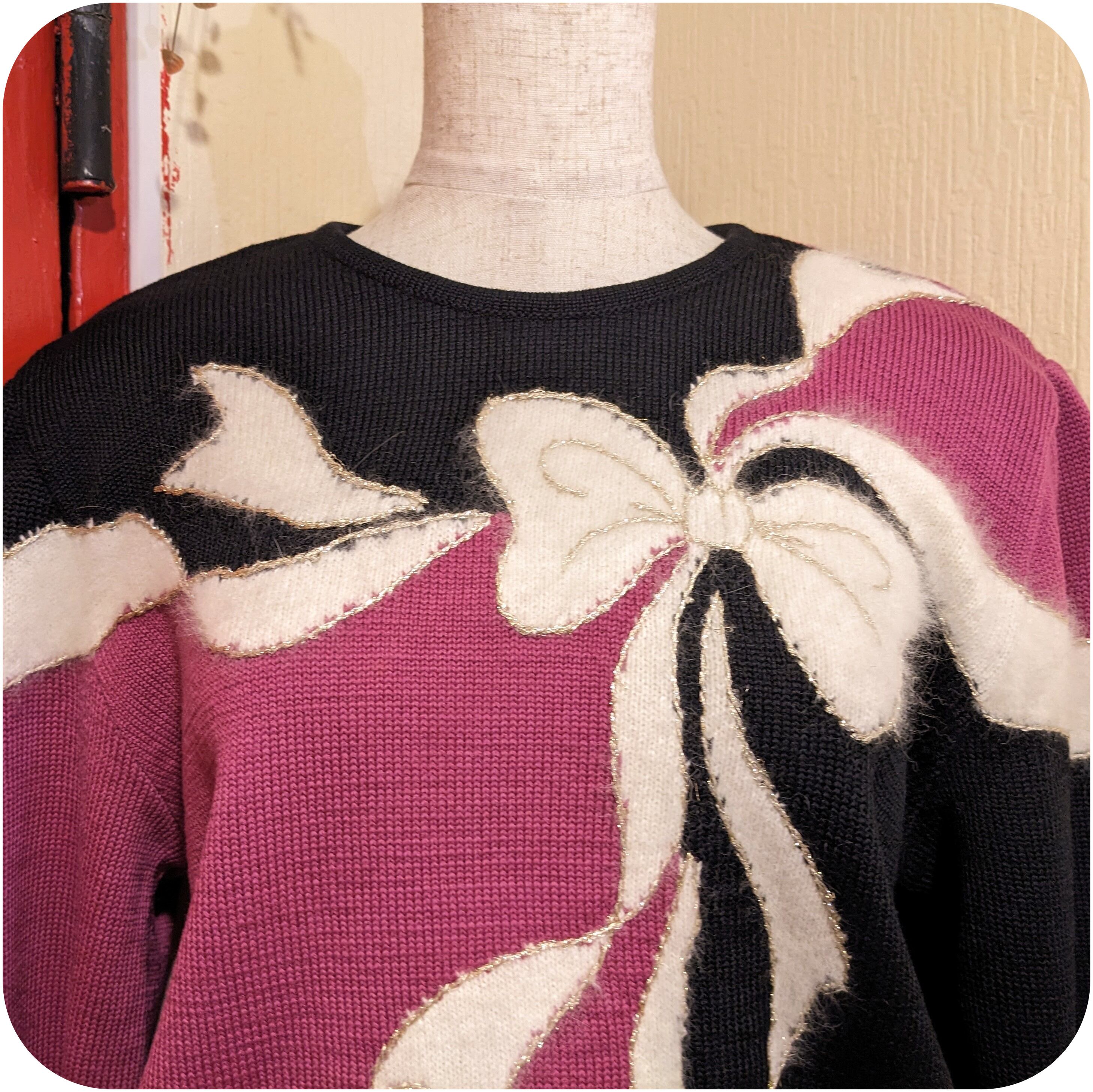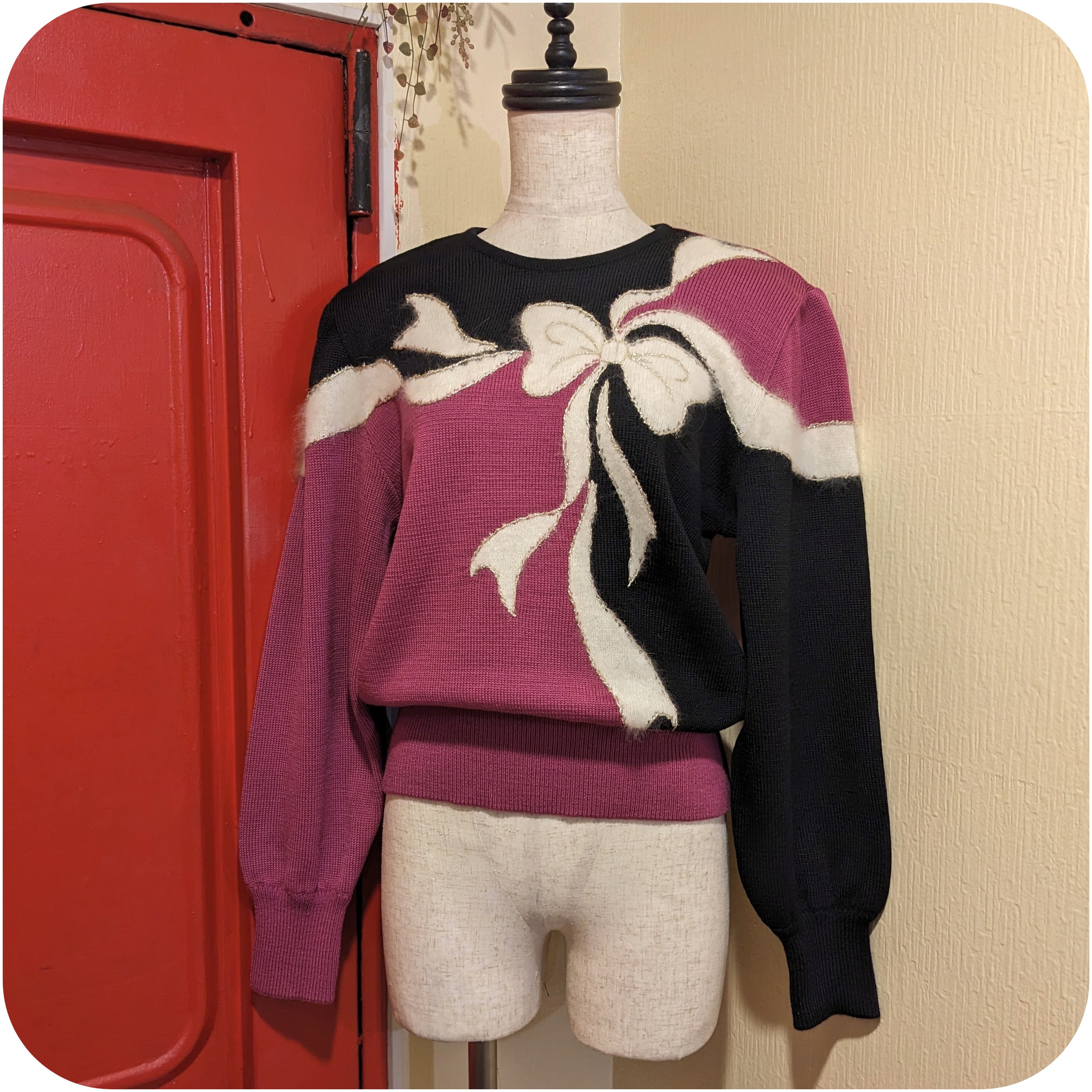 モードなラズベリー×ブラック×ホワイトのリボン柄ニット