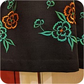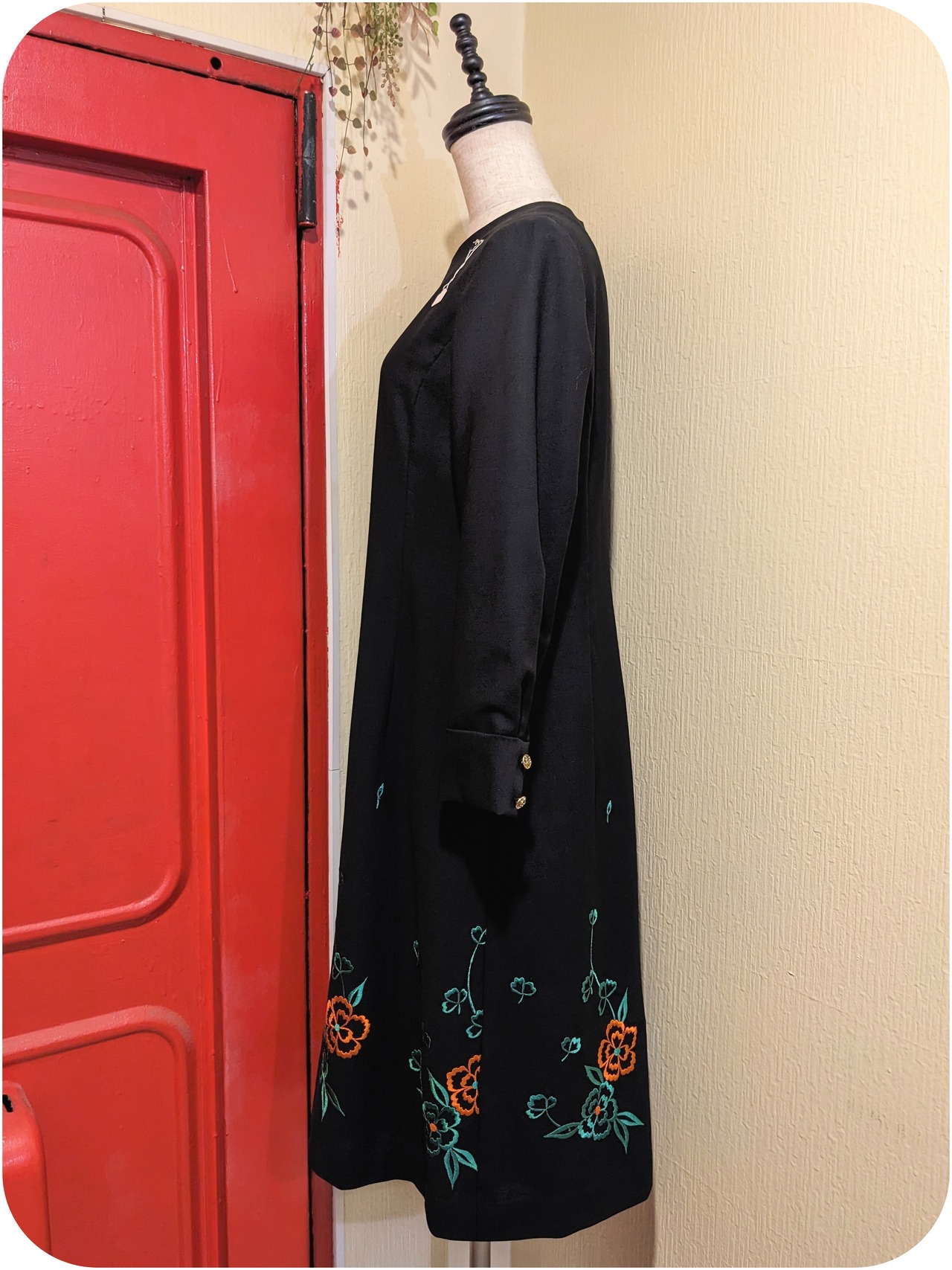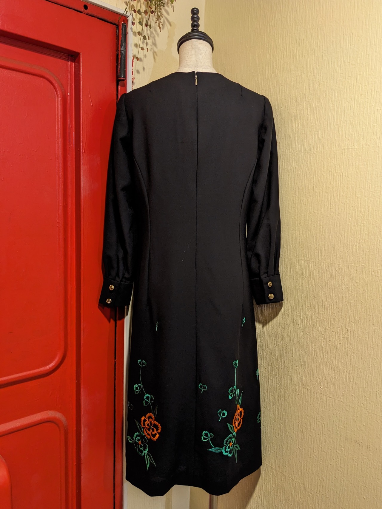 クラシカルなブラック×オレンジ×グリーンのフラワー刺繍入りワンピースです。