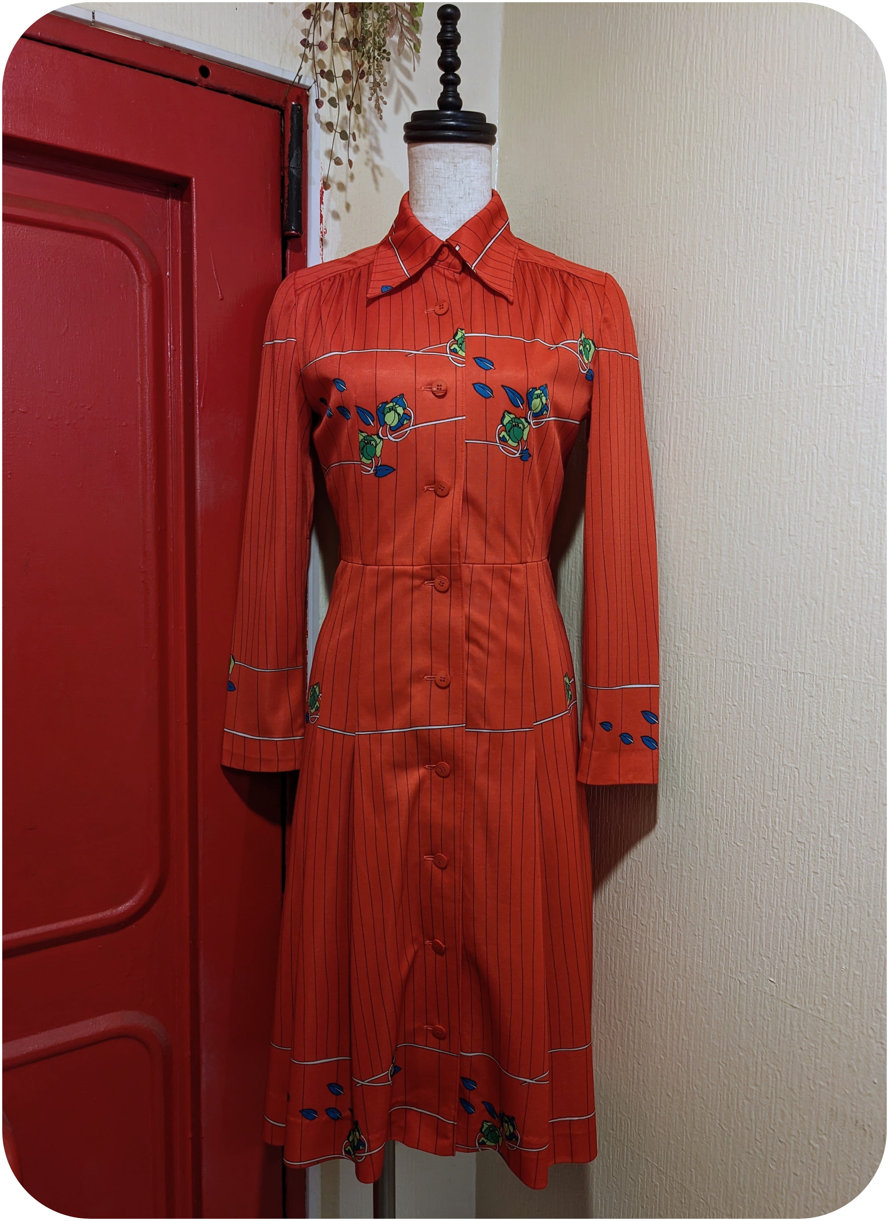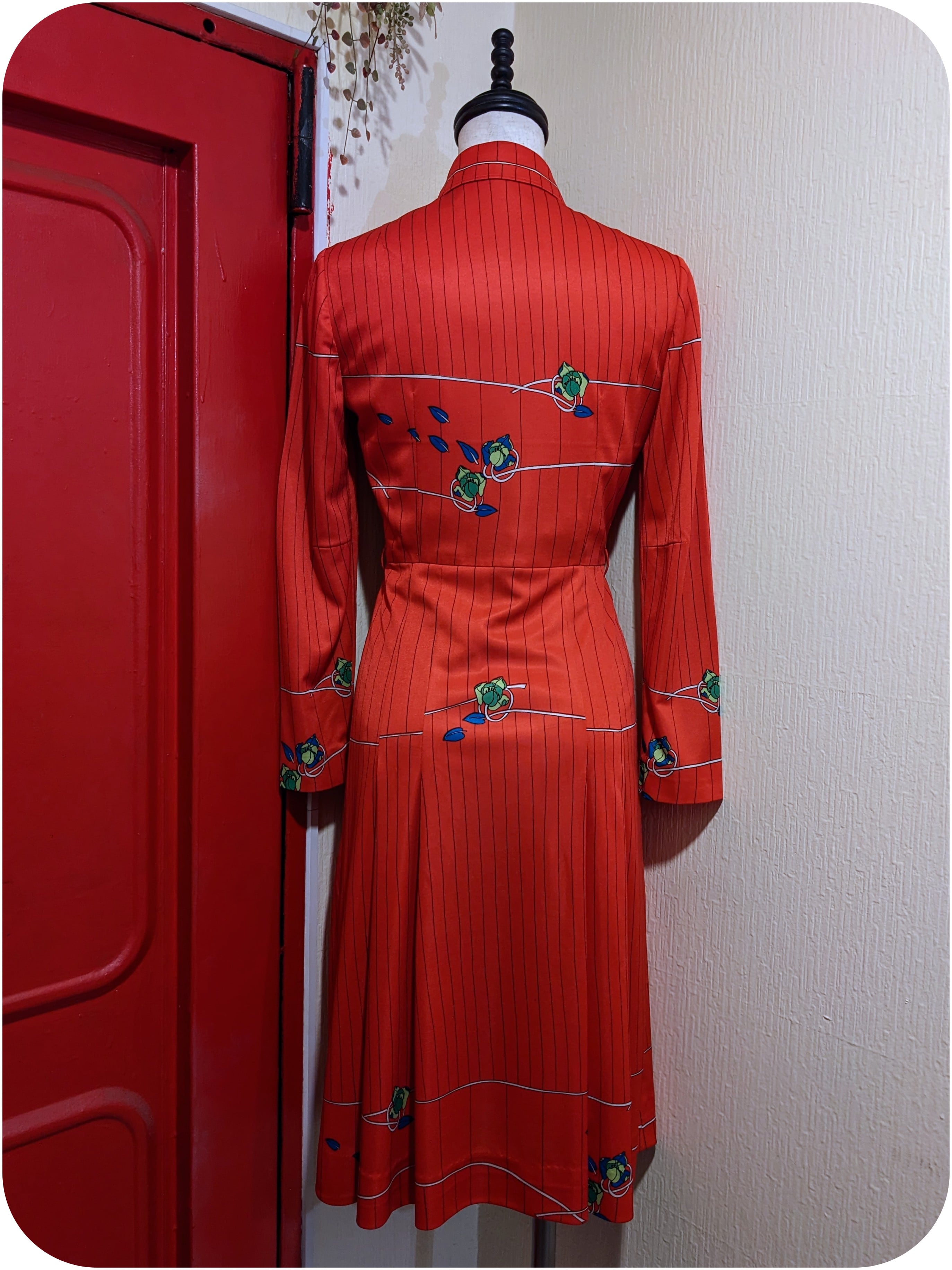 昭和レトロなトマトレッド×ライムグリーン×スモーキーネイビーのフラワーパネル柄ワンピース