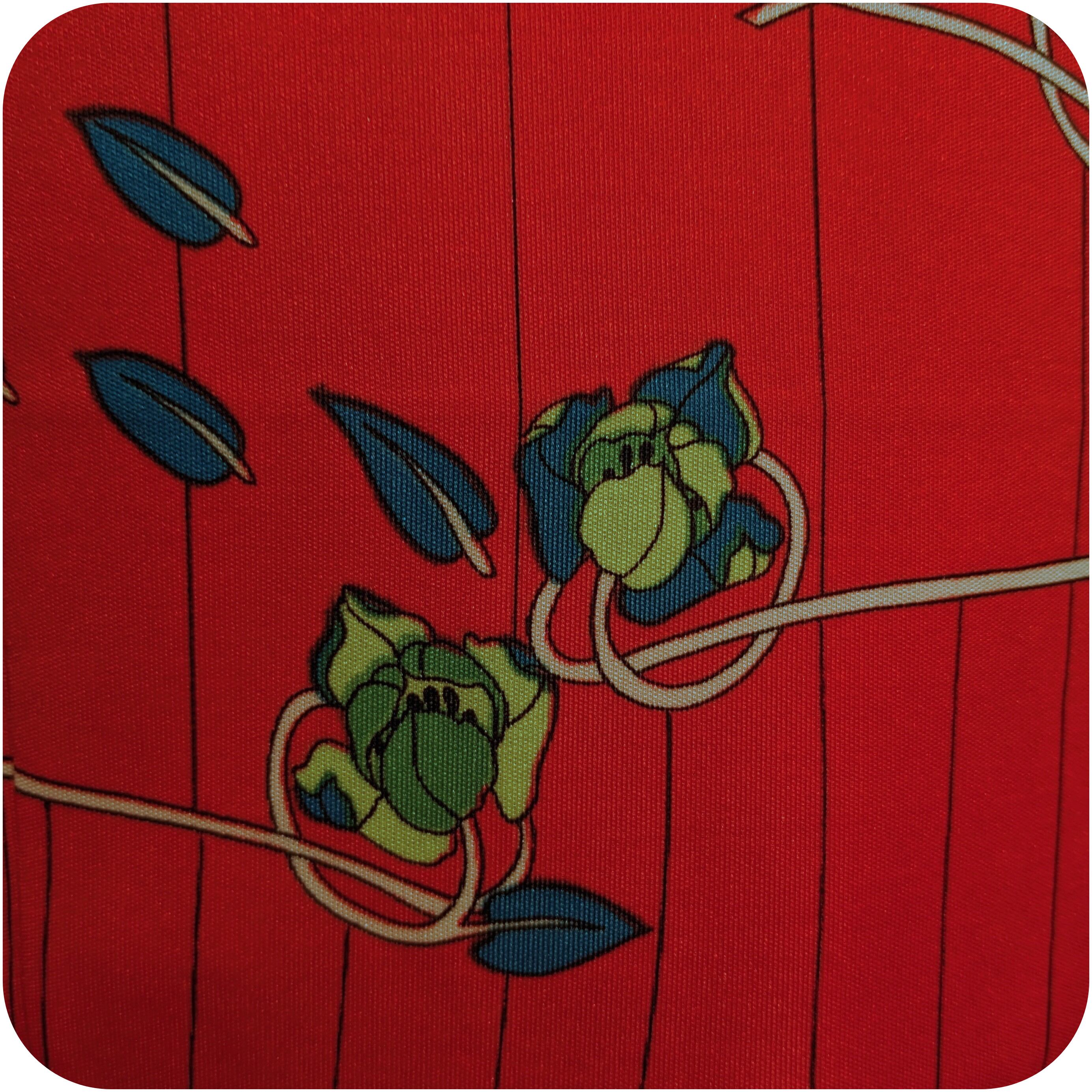昭和レトロなトマトレッド×ライムグリーン×スモーキーネイビーのフラワーパネル柄ワンピースです。
