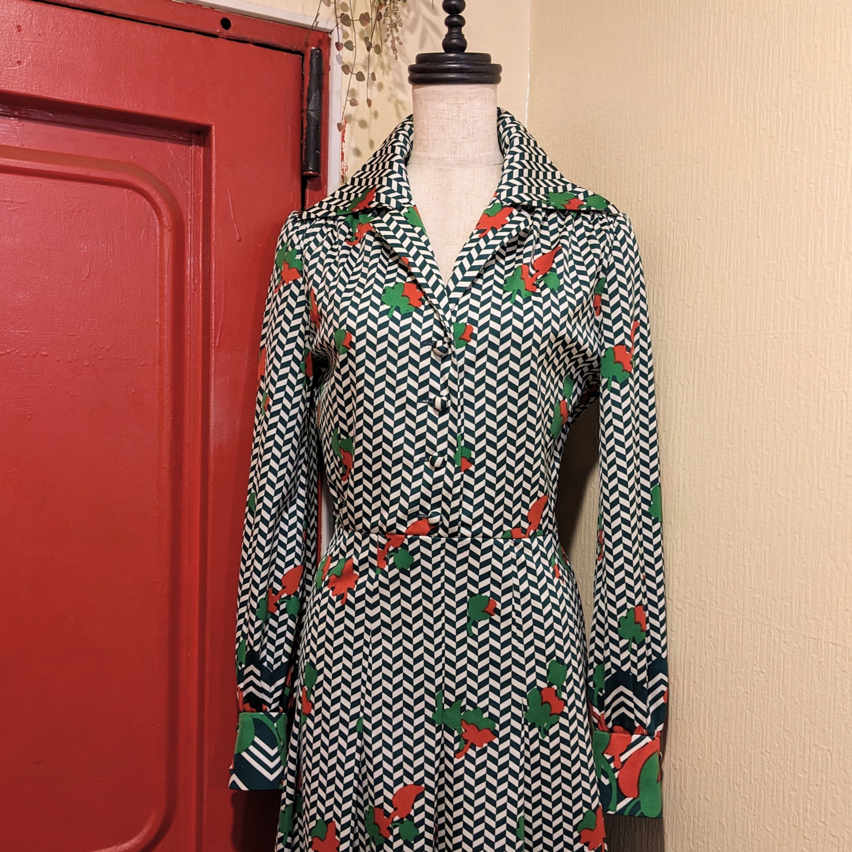 レトロなダークグリーン×オフホワイト×レッドのフラワーパネル柄ワンピースです。