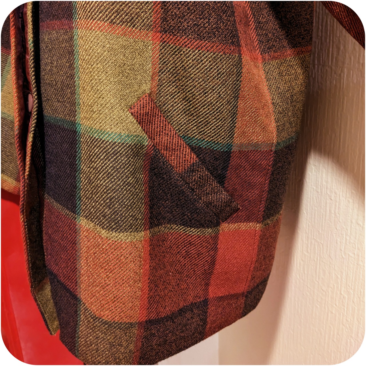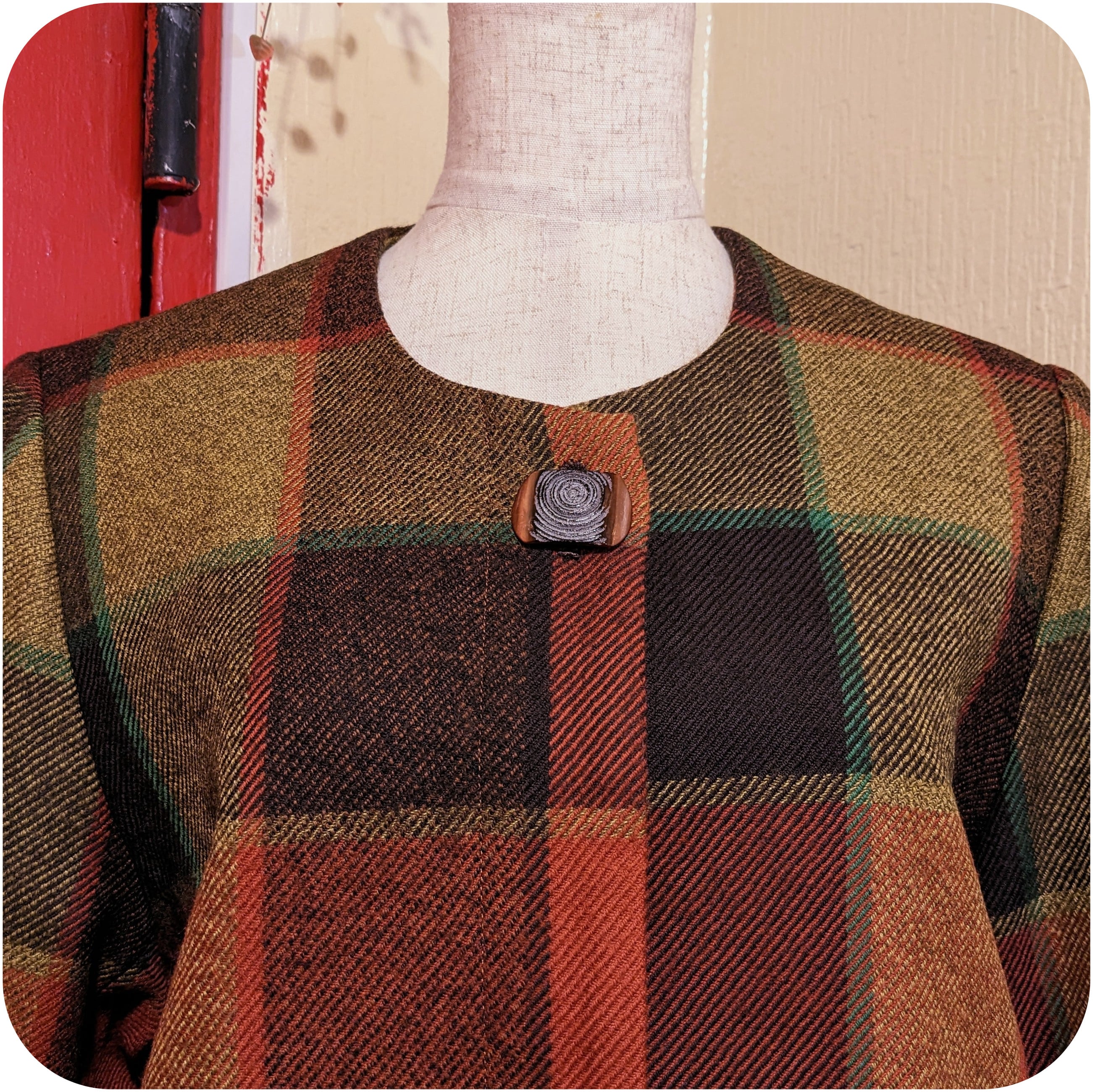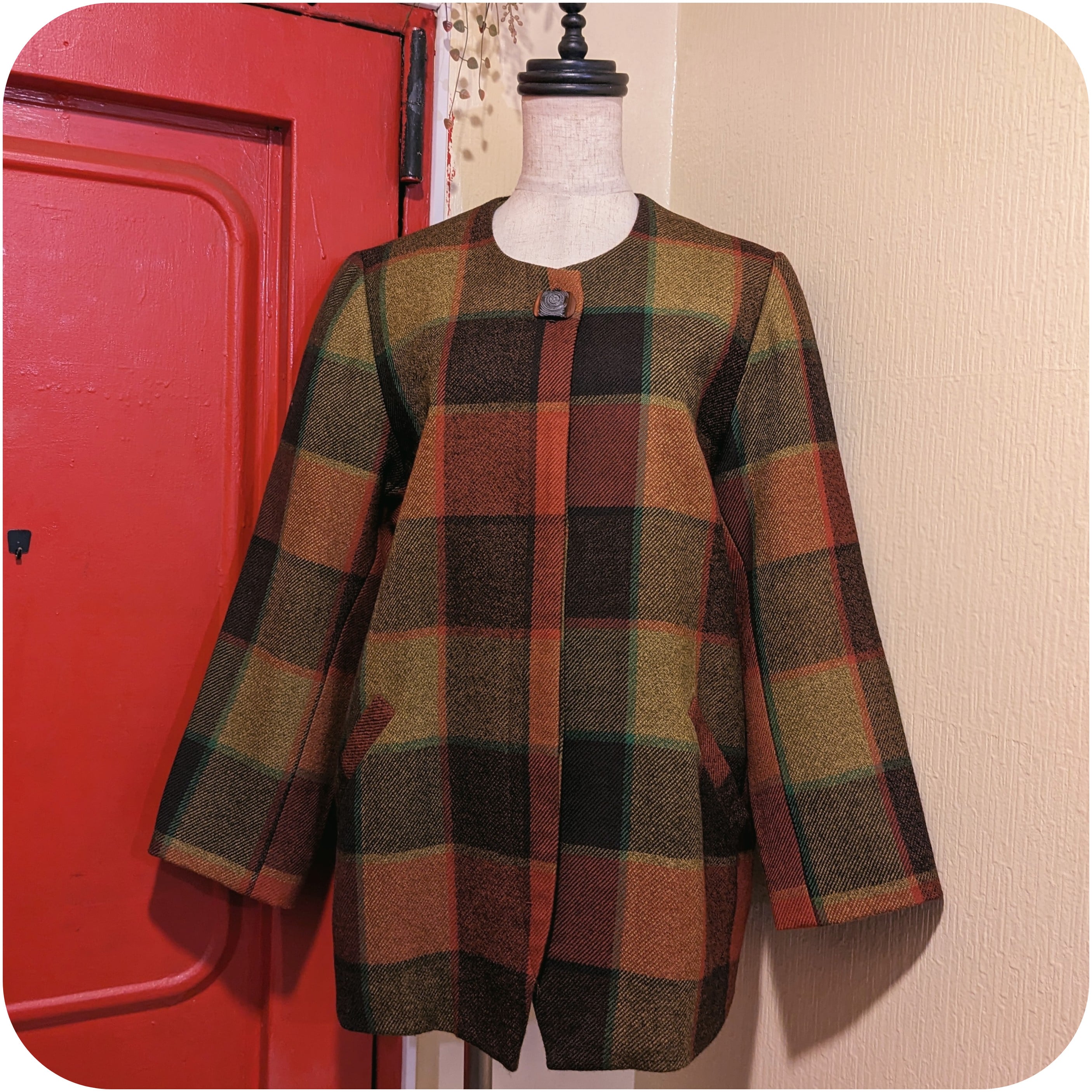 クラシカルなブラウン×スモーキーオレンジ×グリーンのチェック柄ショートコート