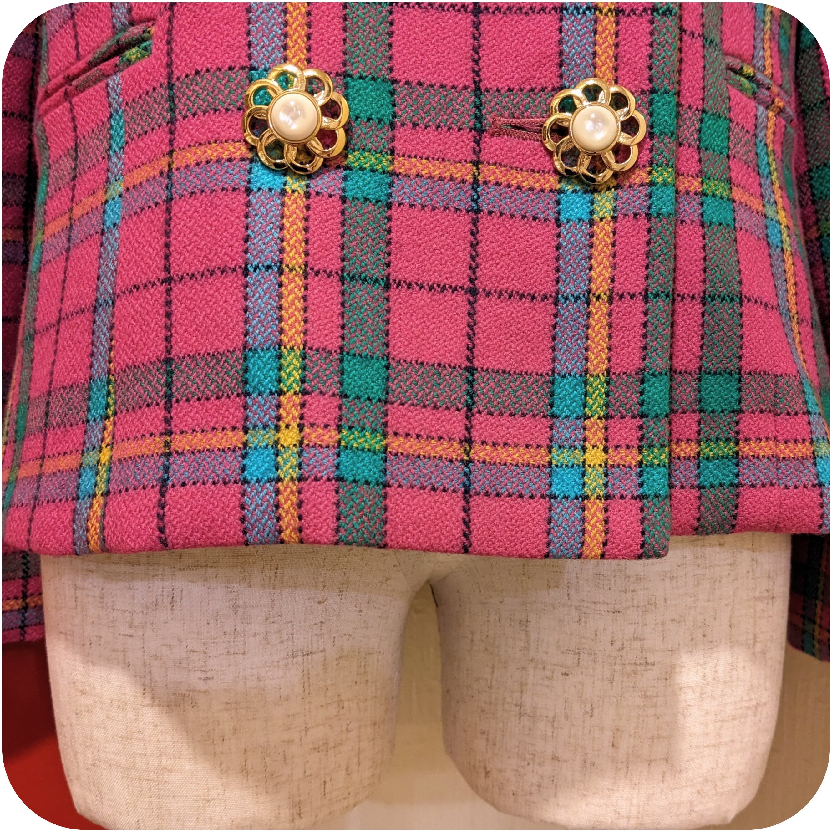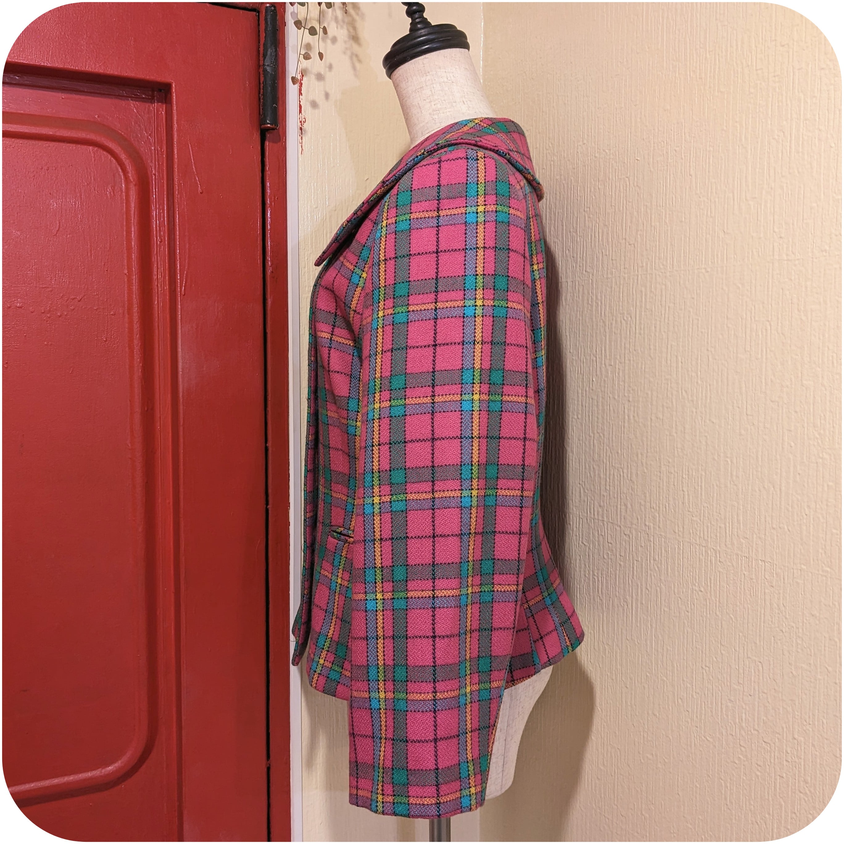 モードなチェリーピンク×エメラルドグリーン×イエローのチェック柄ジャケットです。