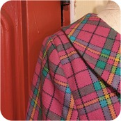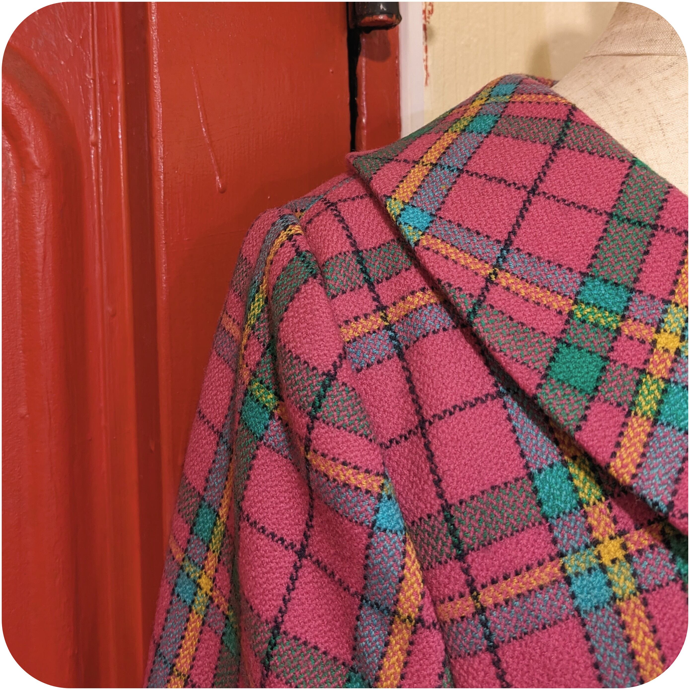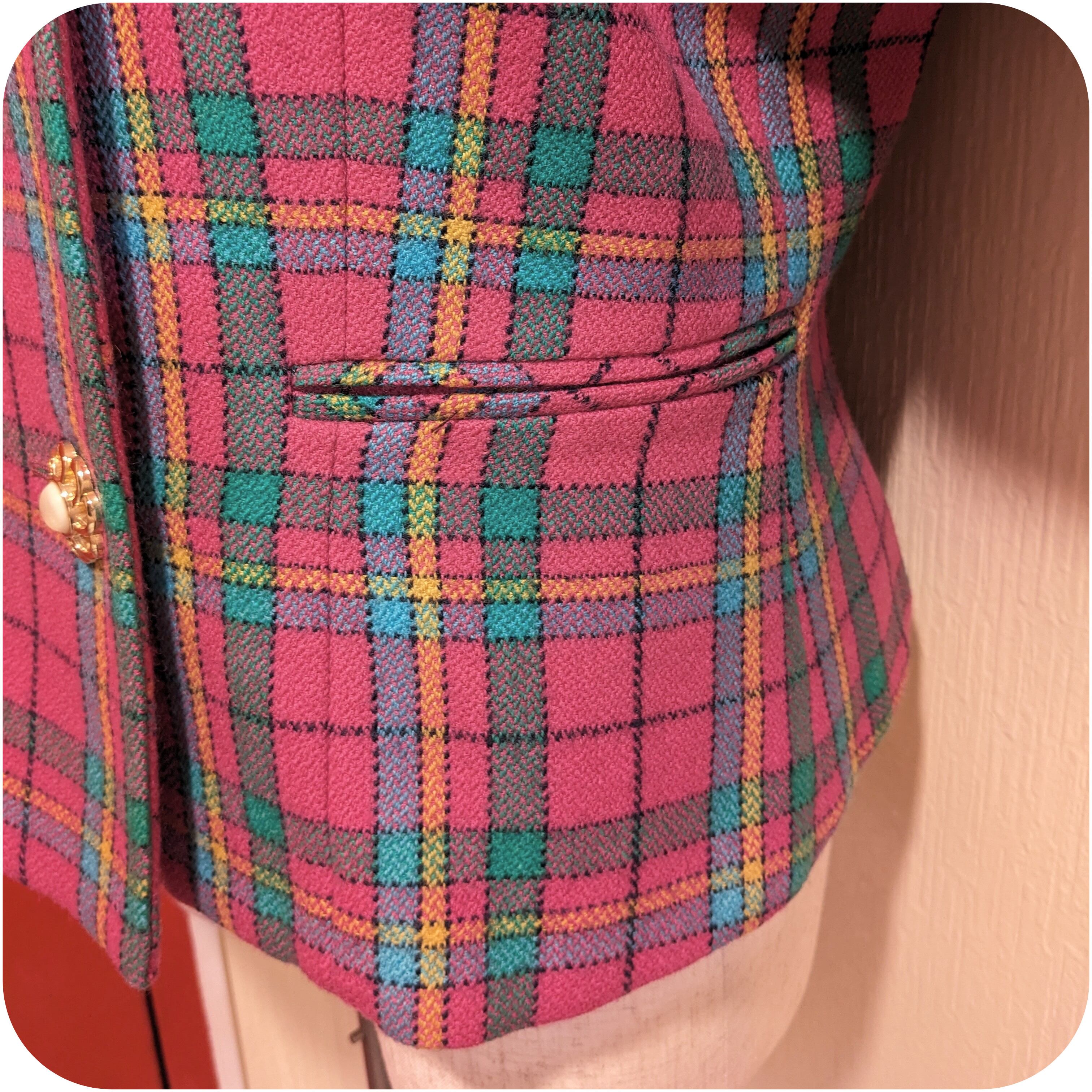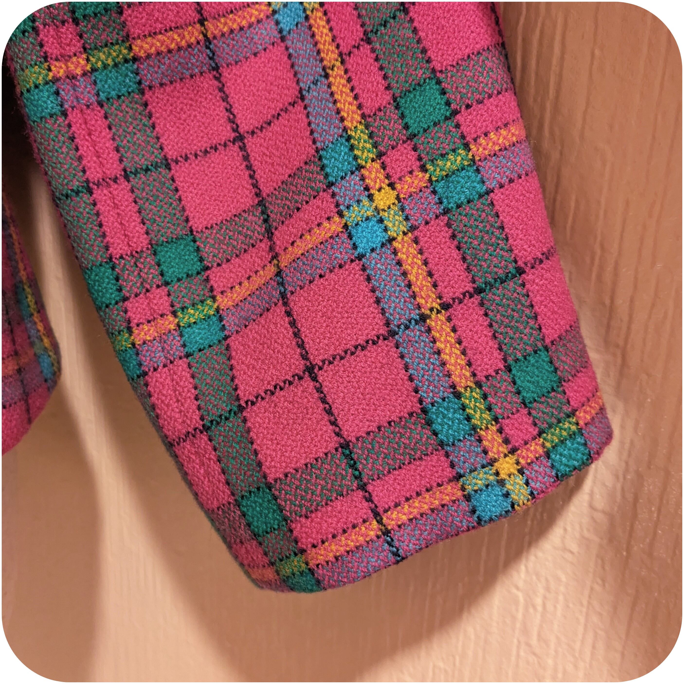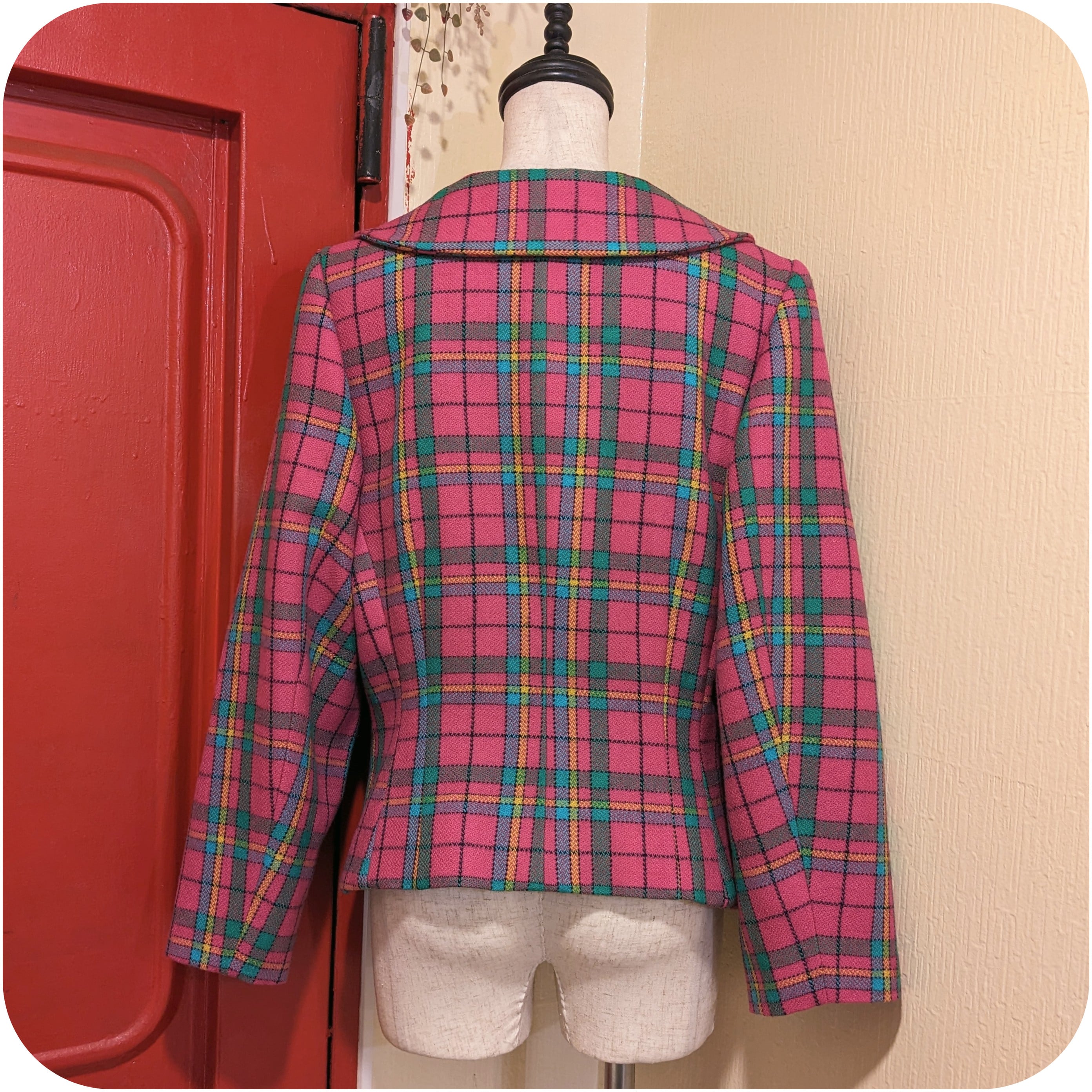 モードなチェリーピンク×エメラルドグリーン×イエローのチェック柄ジャケット