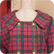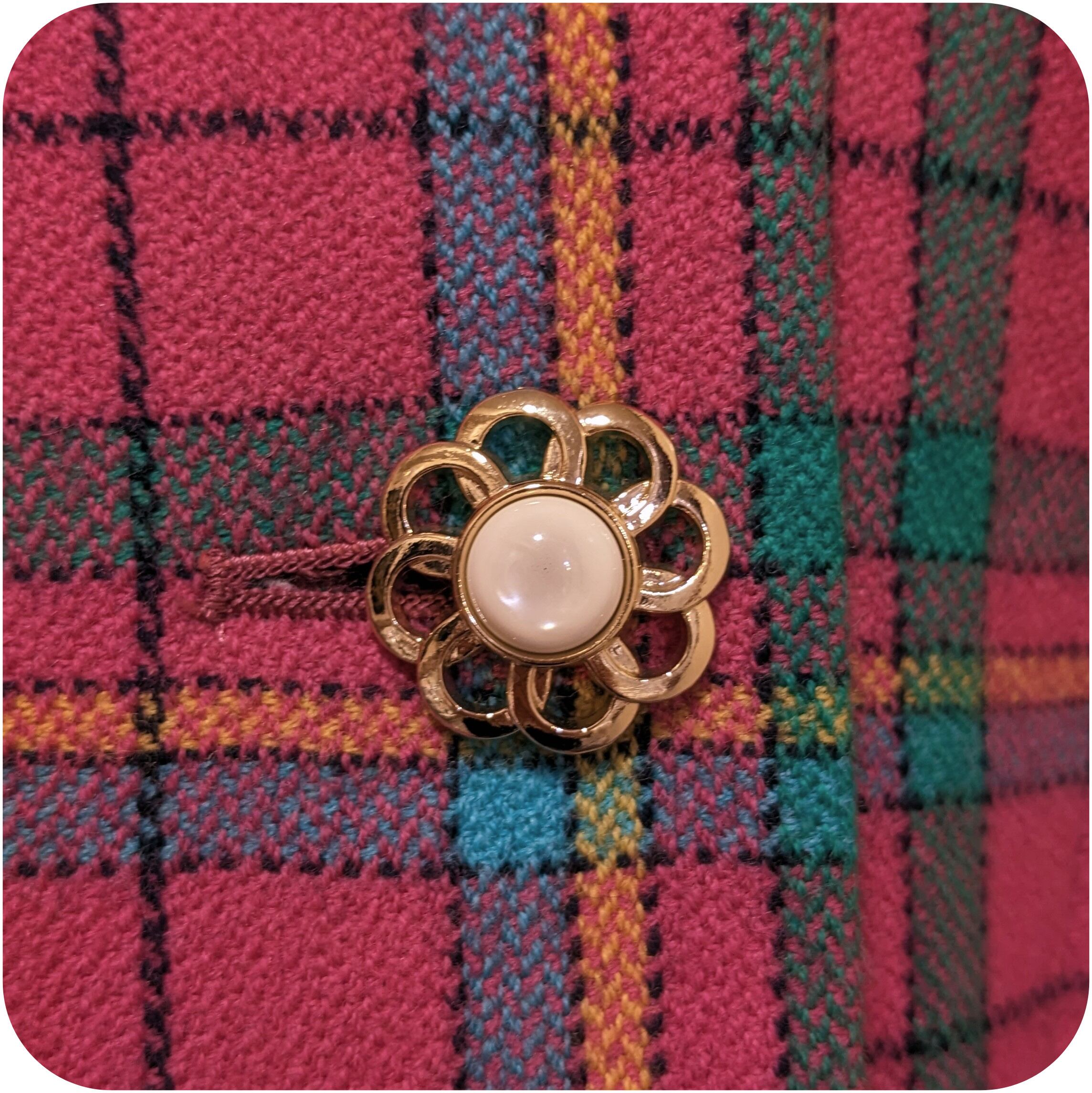 古着ならではのキュートな色合いのマテリアルと、ポップなフラワーモチーフボタンがとっても素敵。