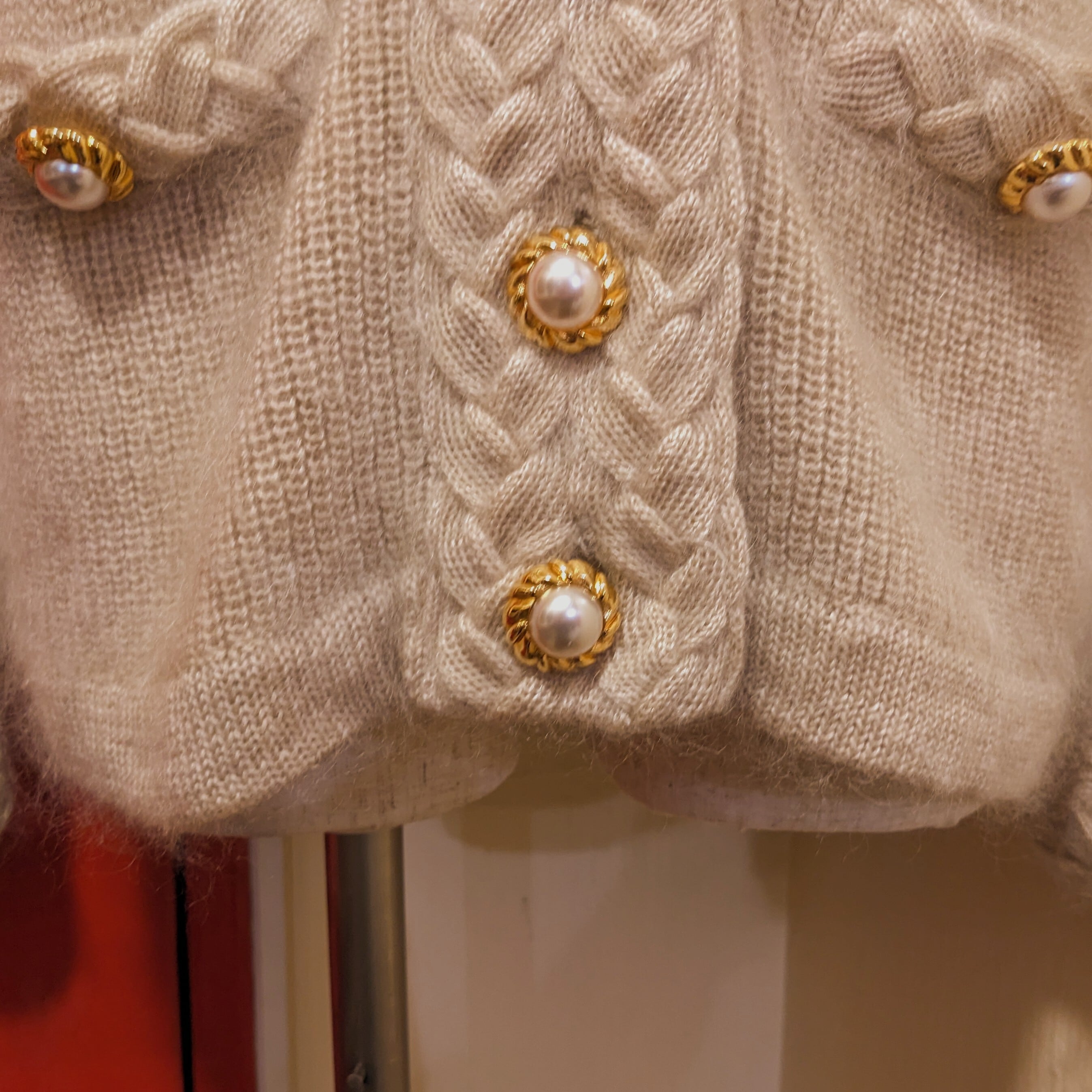 エレガントなライトベージュのモヘアカーディガンです。