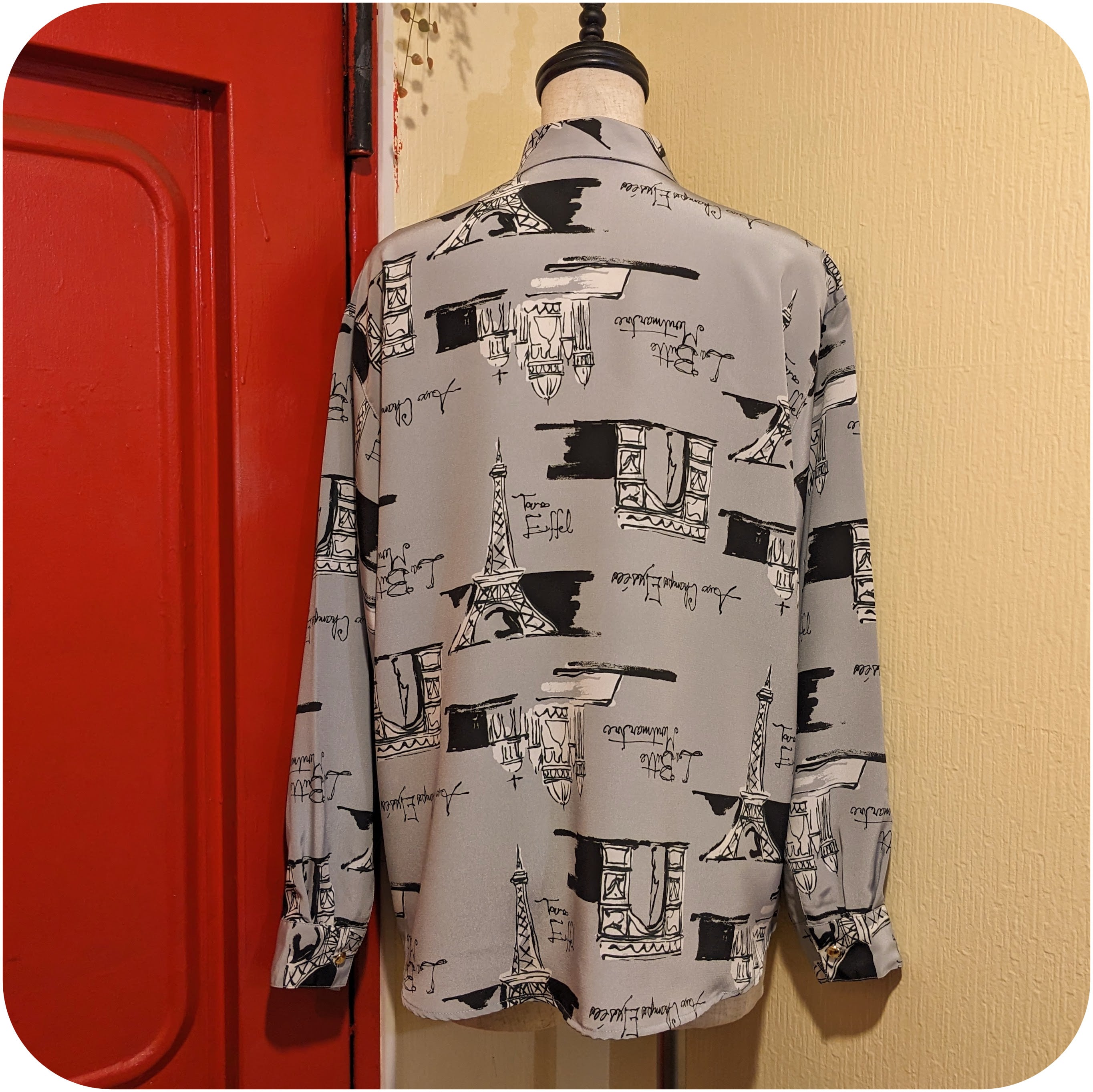 モードなライトグレー×ブラックのパリランドマーク柄ブラウスです。