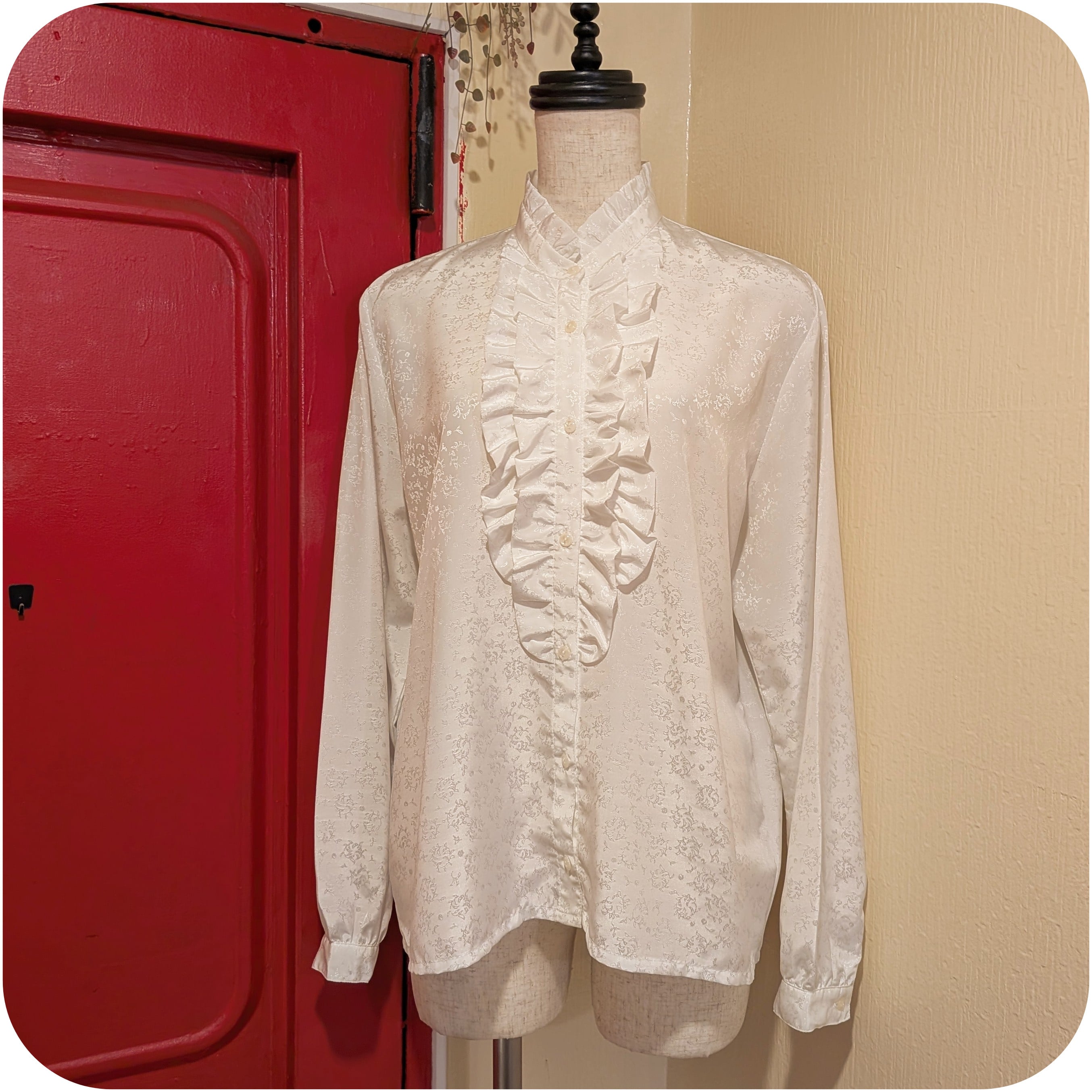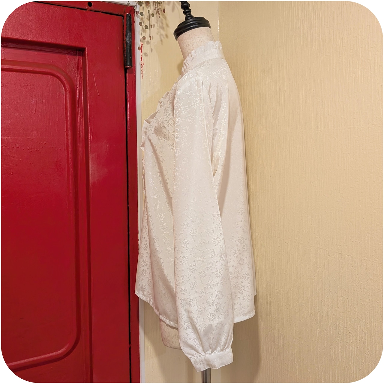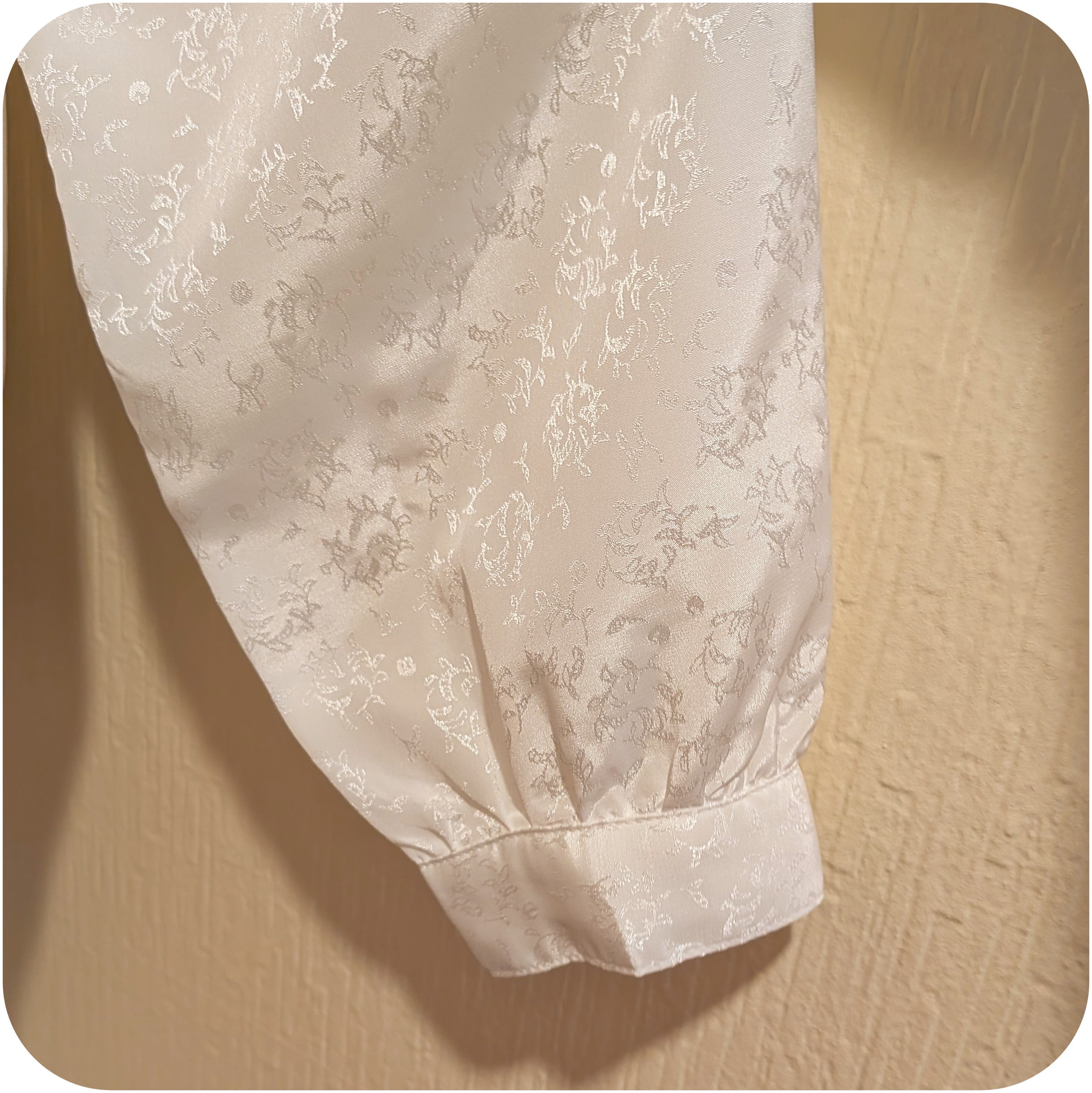 エレガントなホワイトのリーフ柄フリルデザインブラウスです。