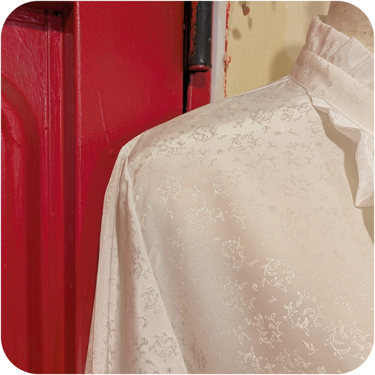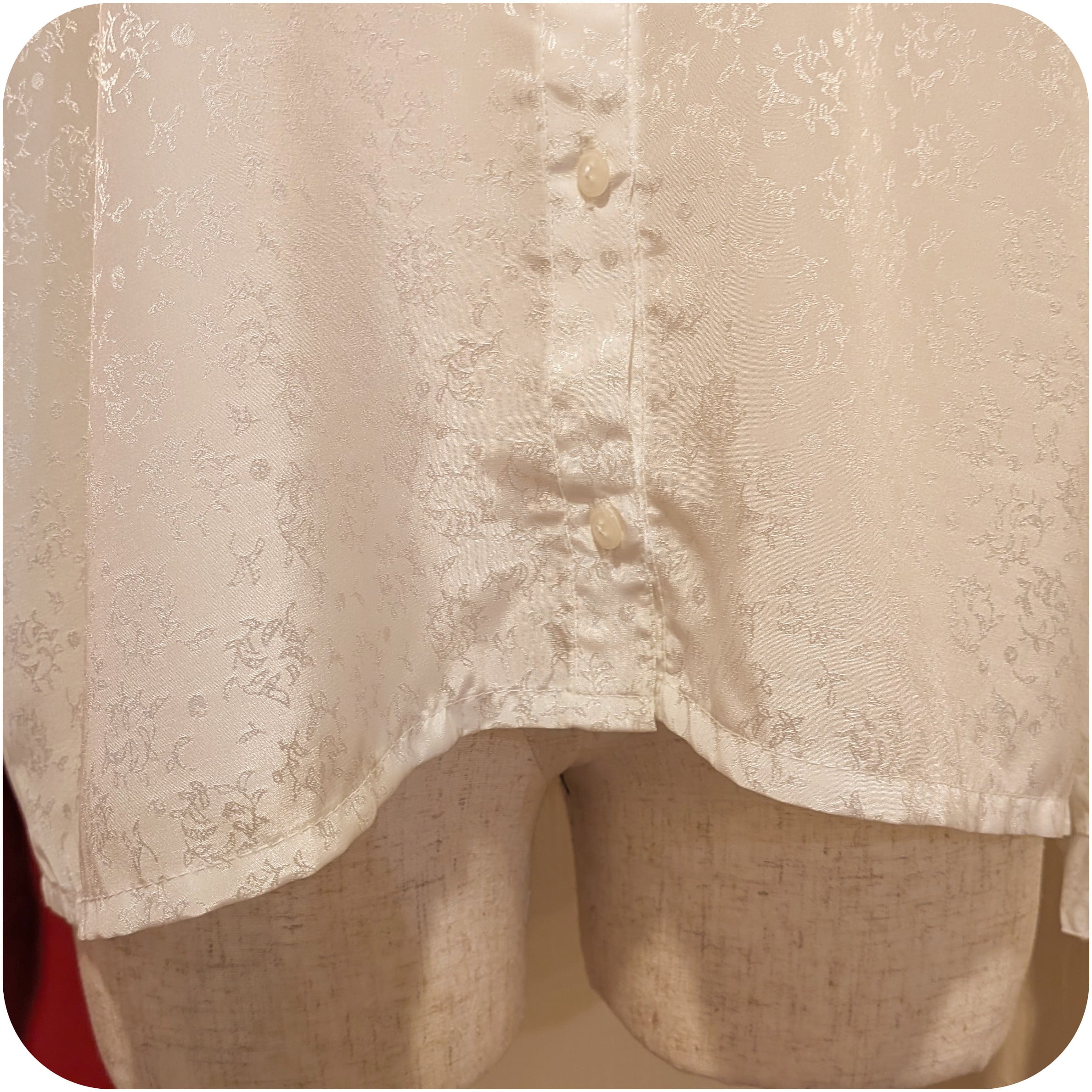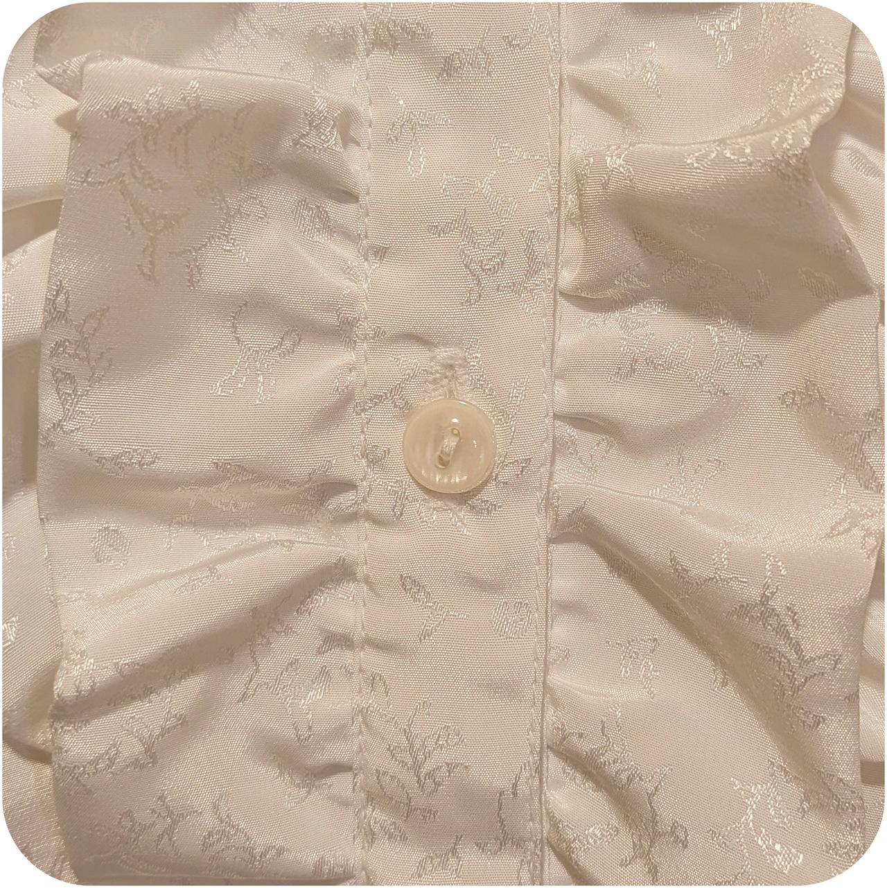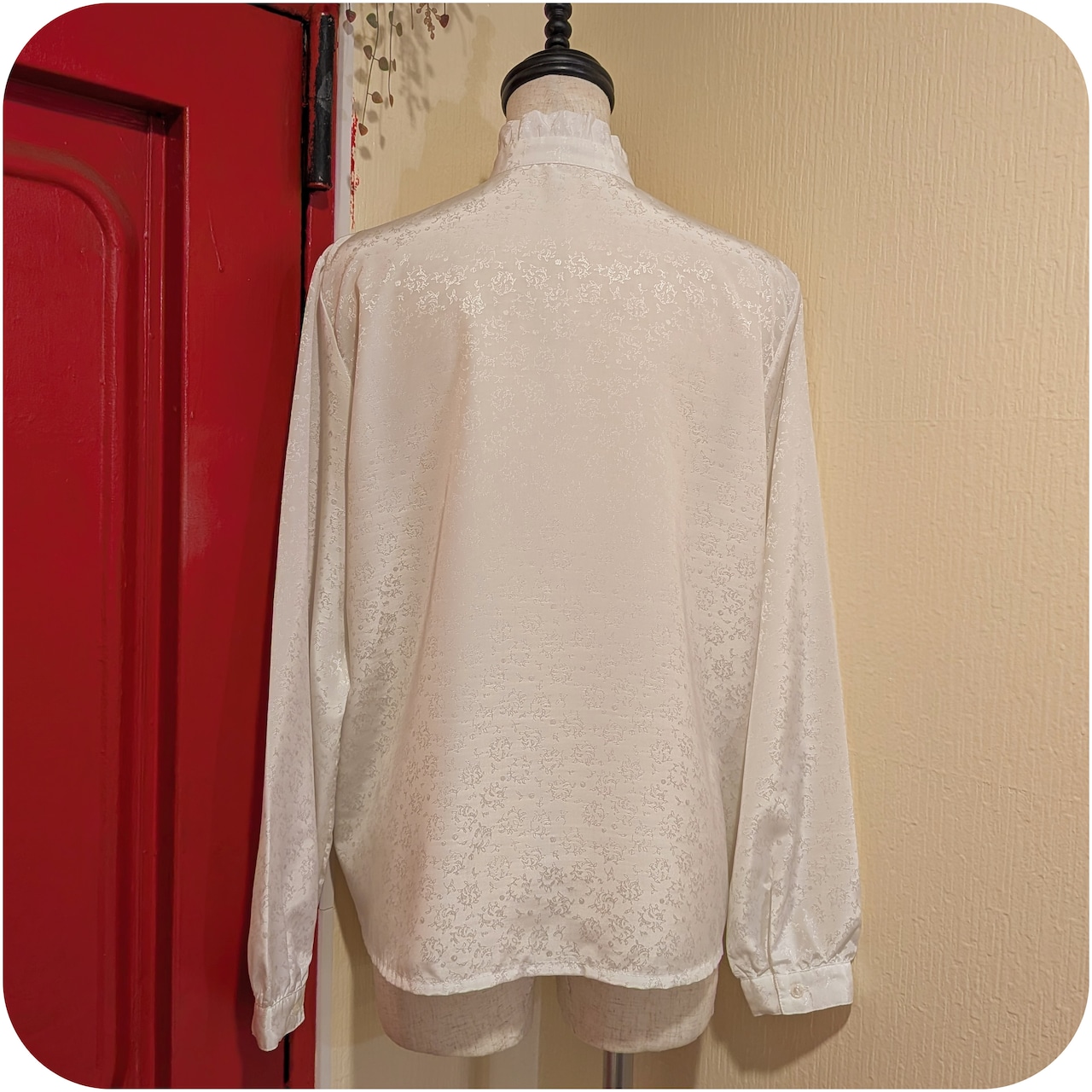 エレガントなホワイトのリーフ柄フリルデザインブラウスです。