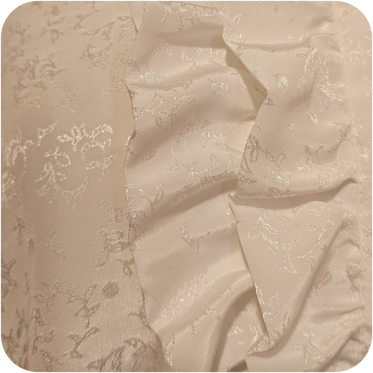 ノスタルジックなリーフ柄が織り込まれた光沢感のあるマテリアルと、フロントにあしらわれたフリルデザインがとっても素敵。