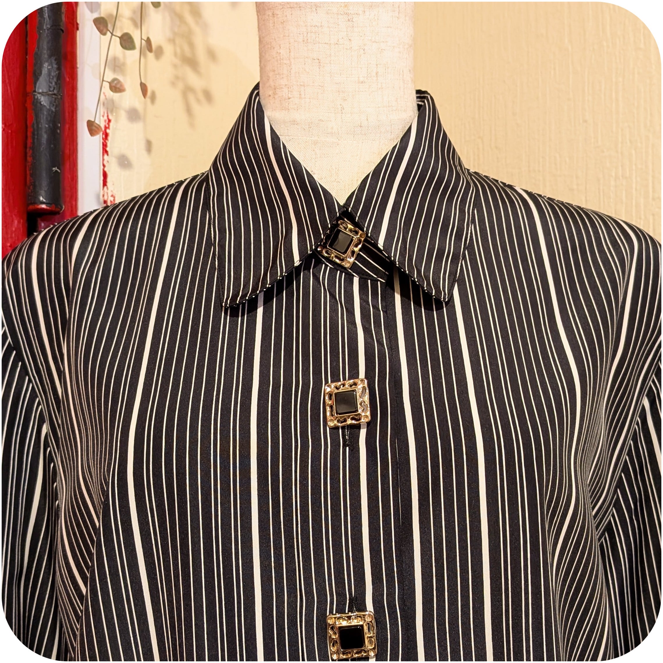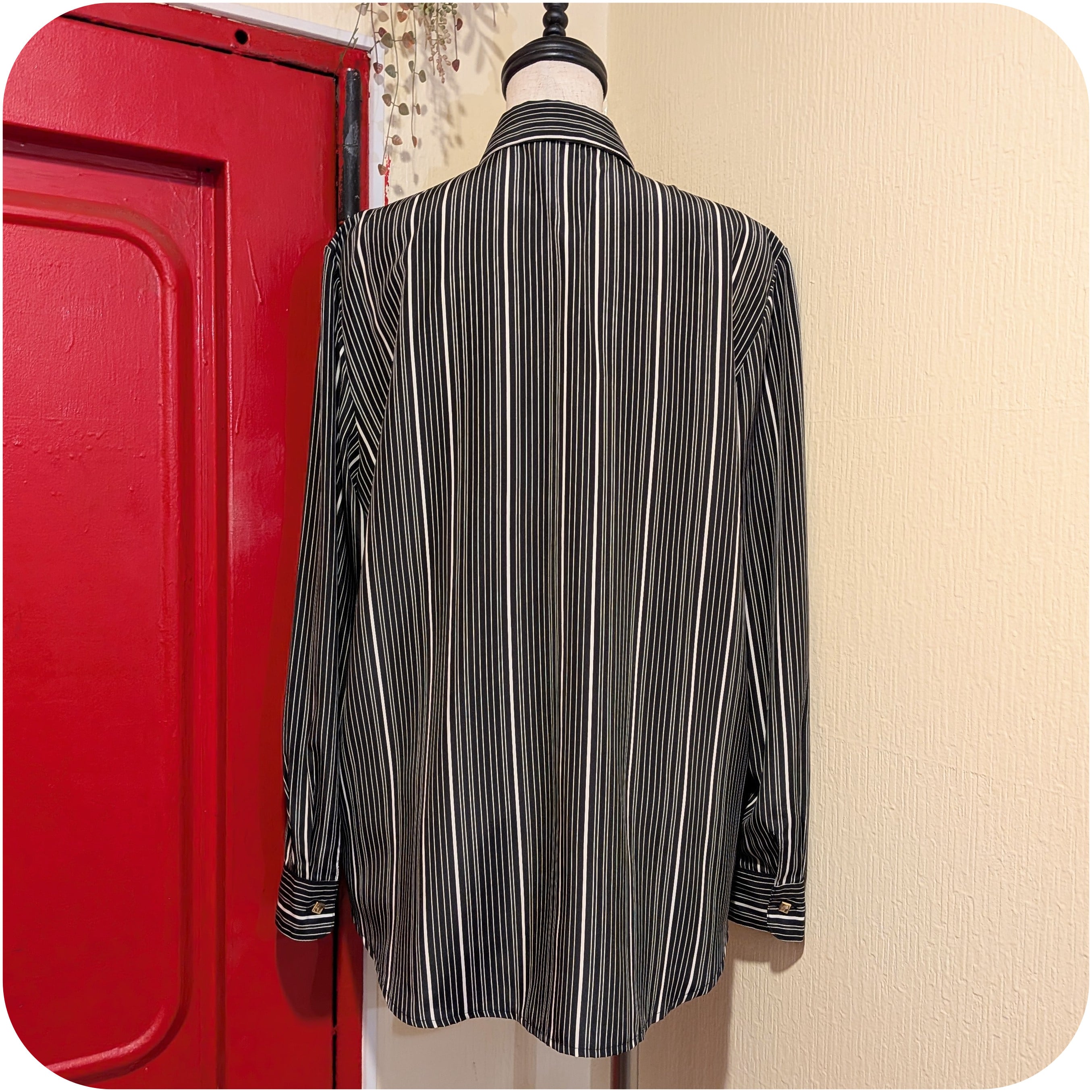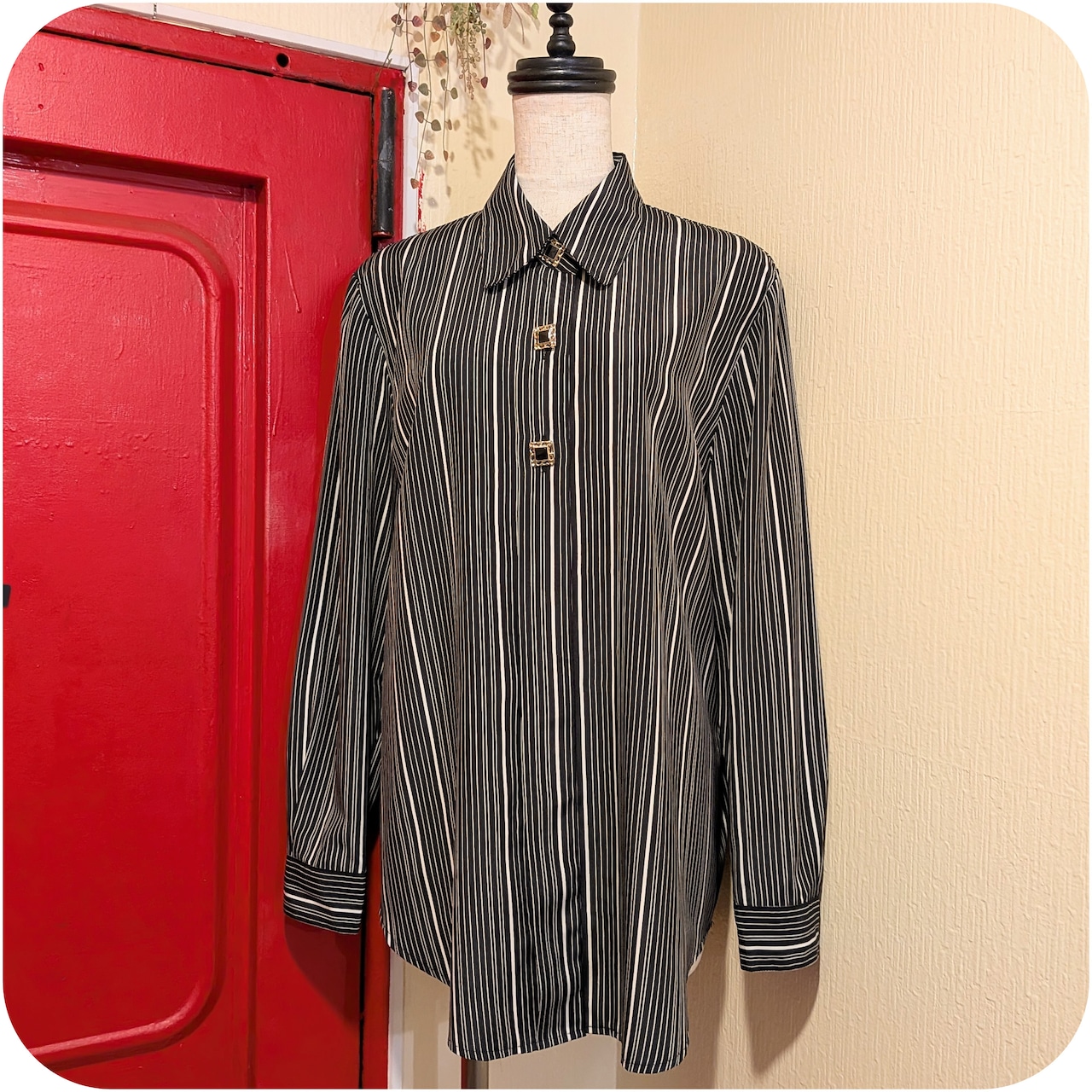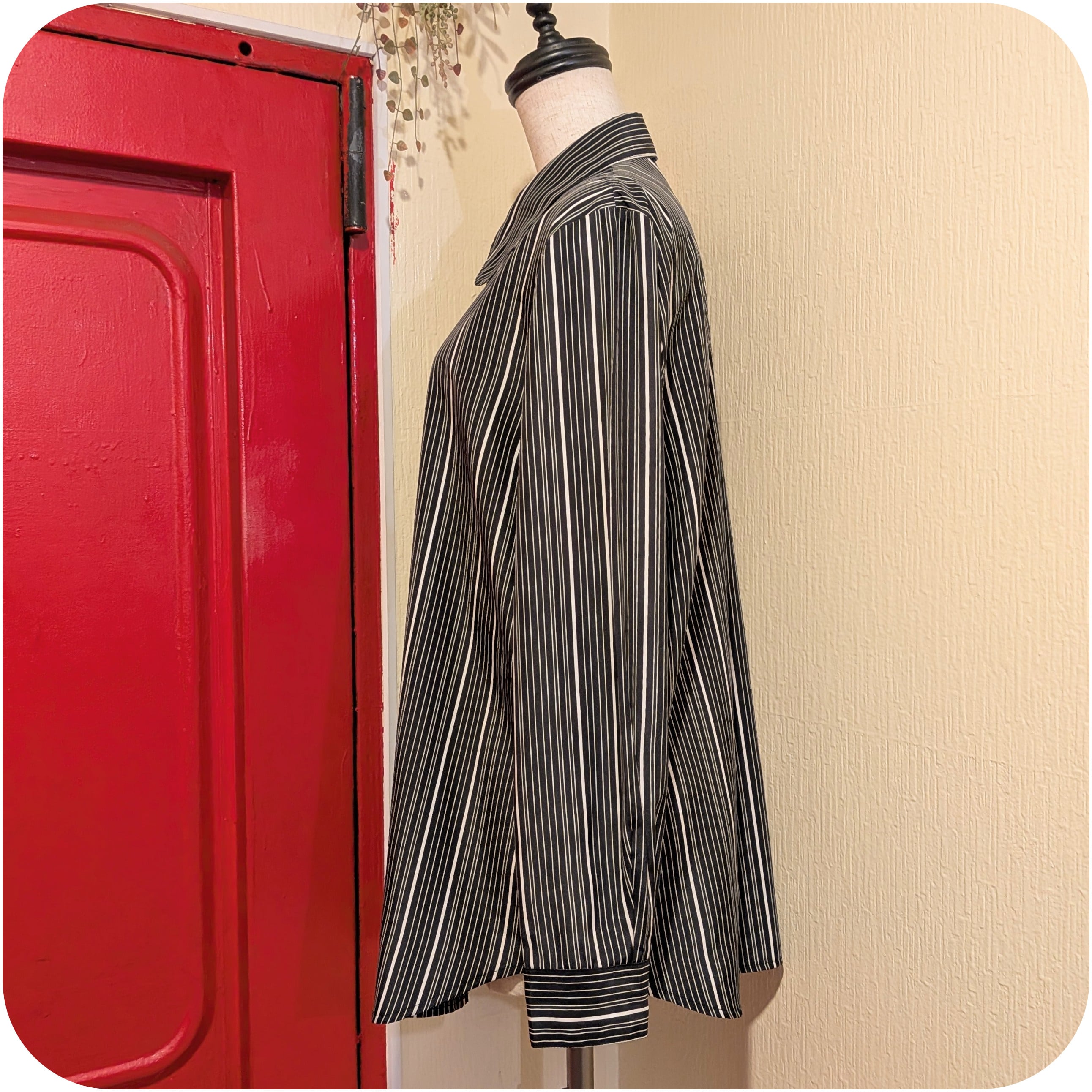 モードなブラック×ホワイトのストライプ柄ブラウスです。