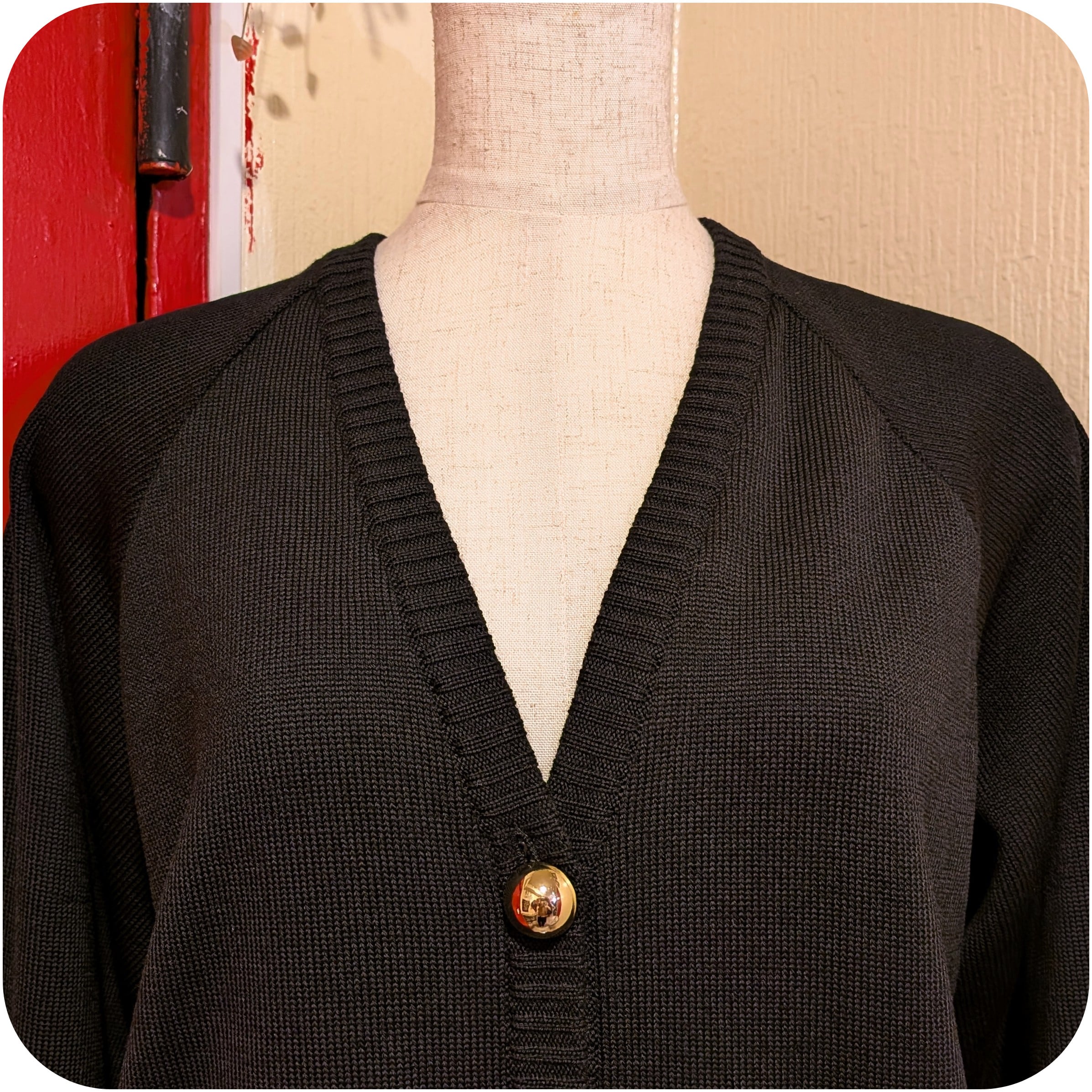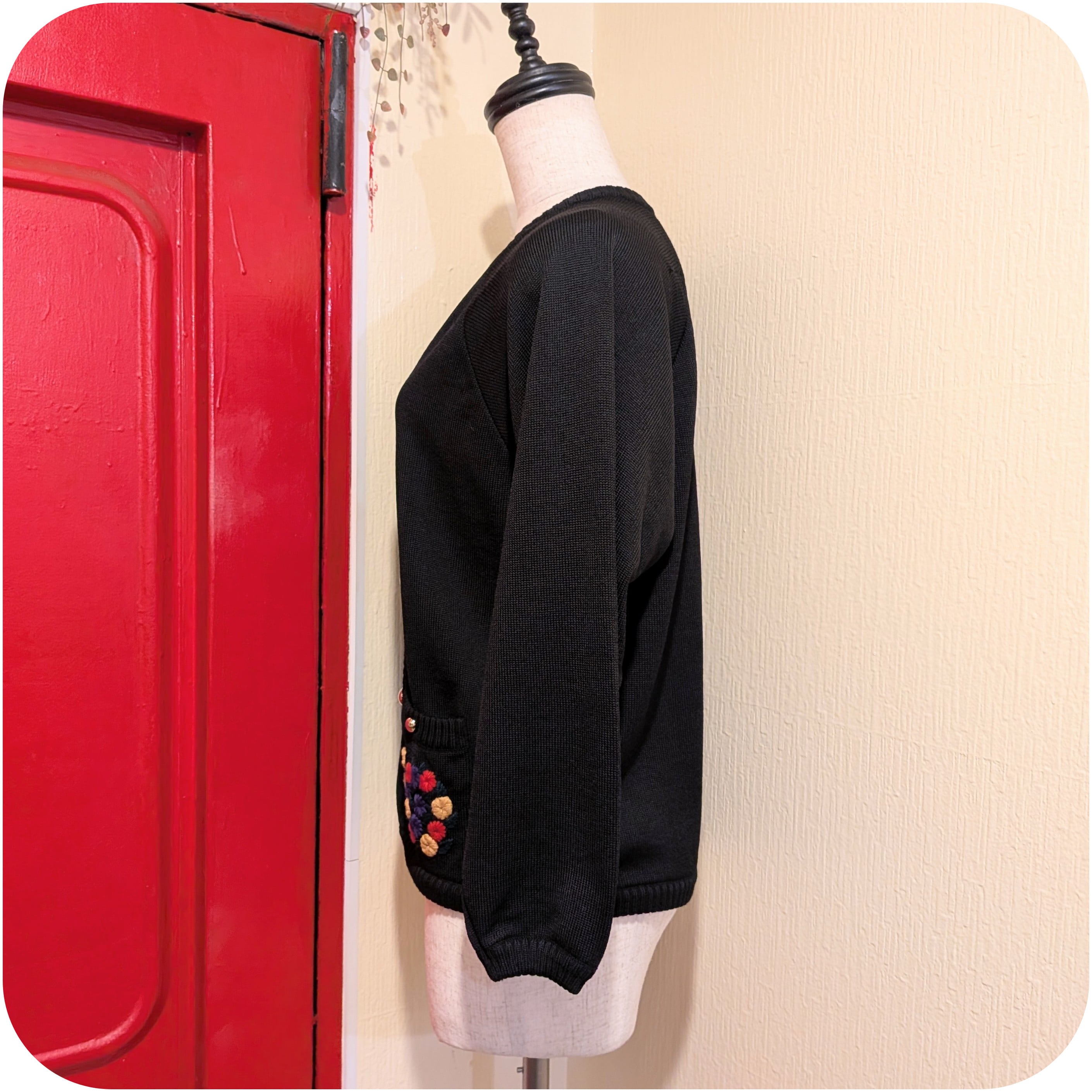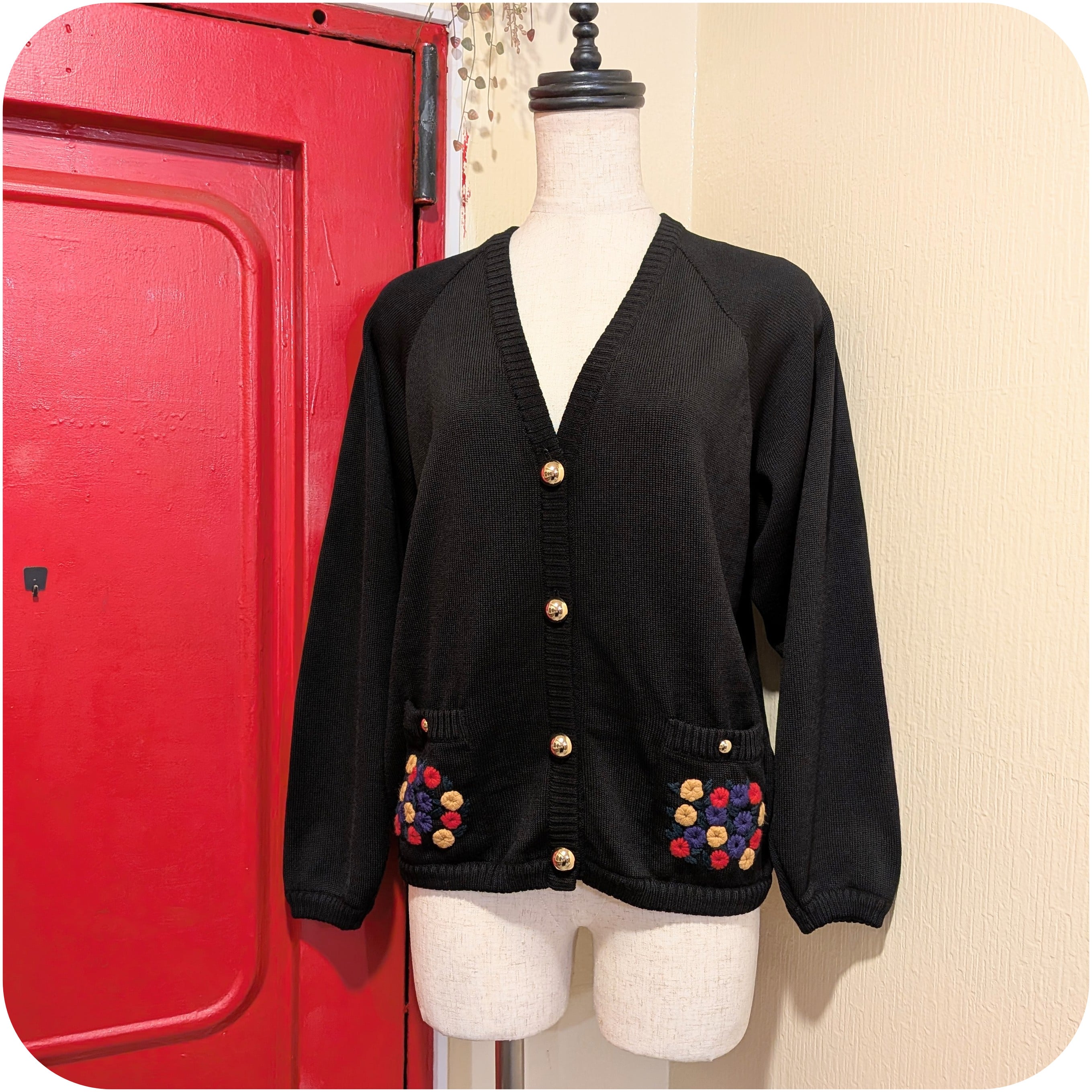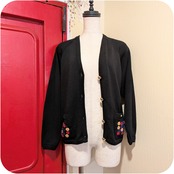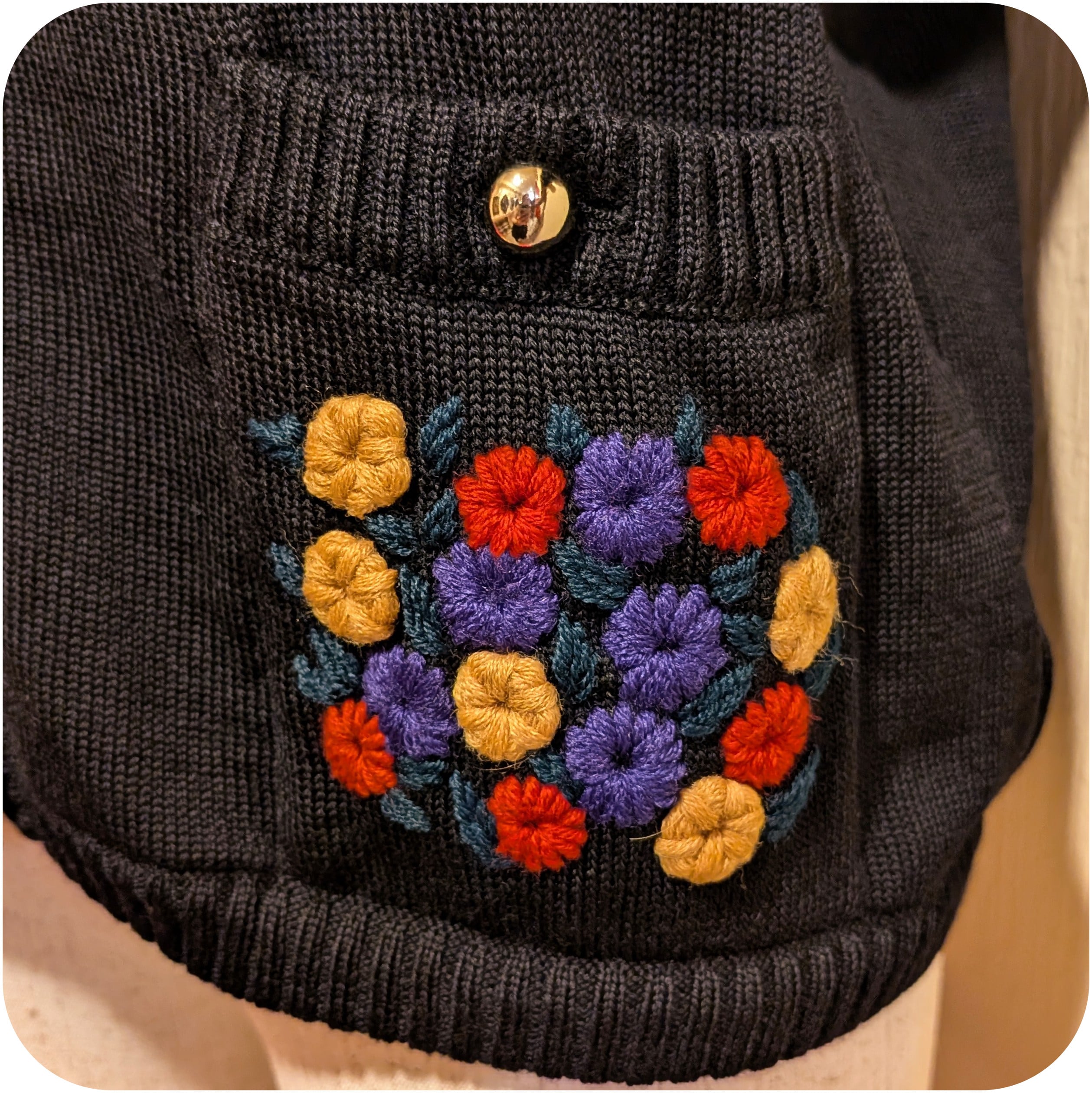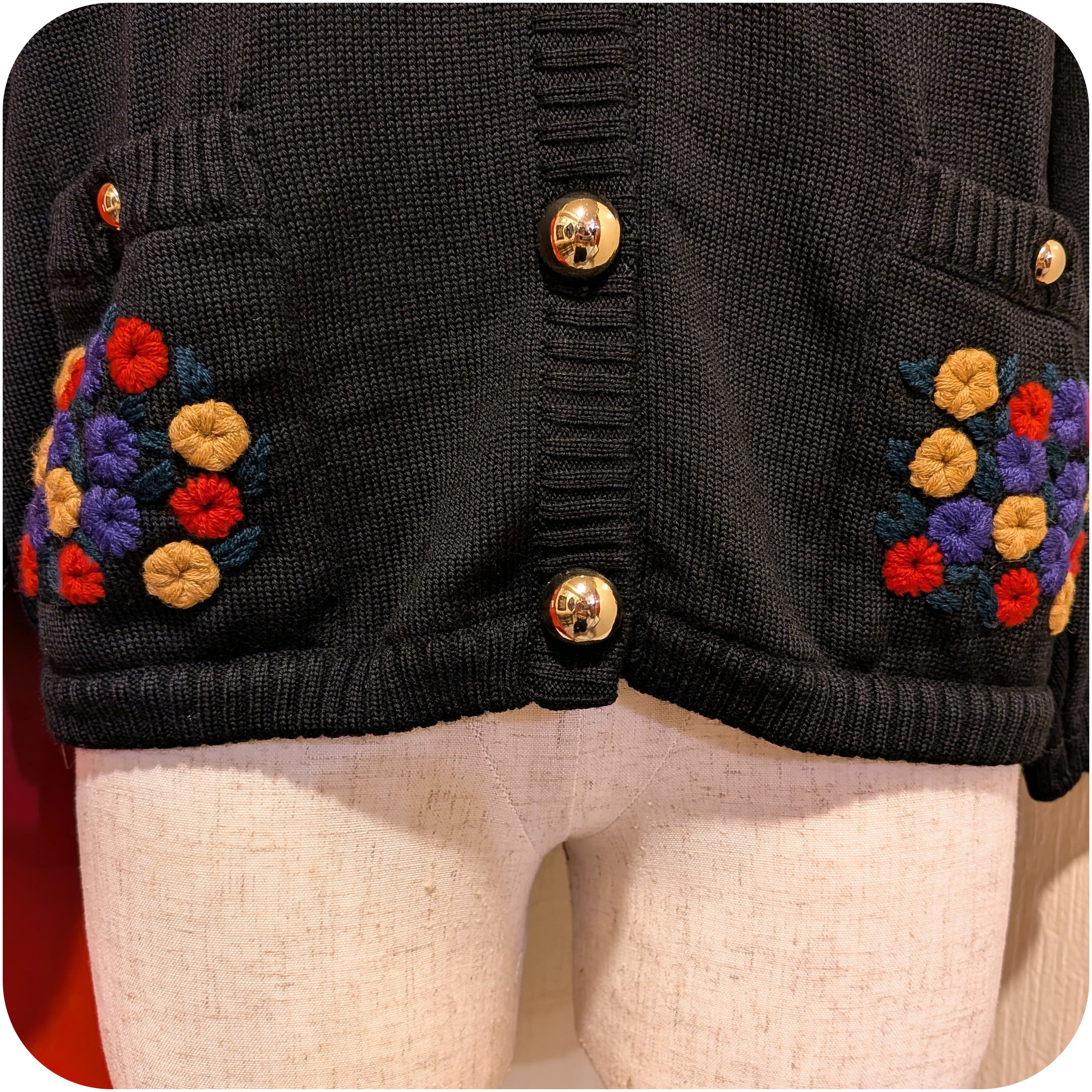 クラシカルなブラック×イエロー×パープルのフラワー刺繍入りカーディガン